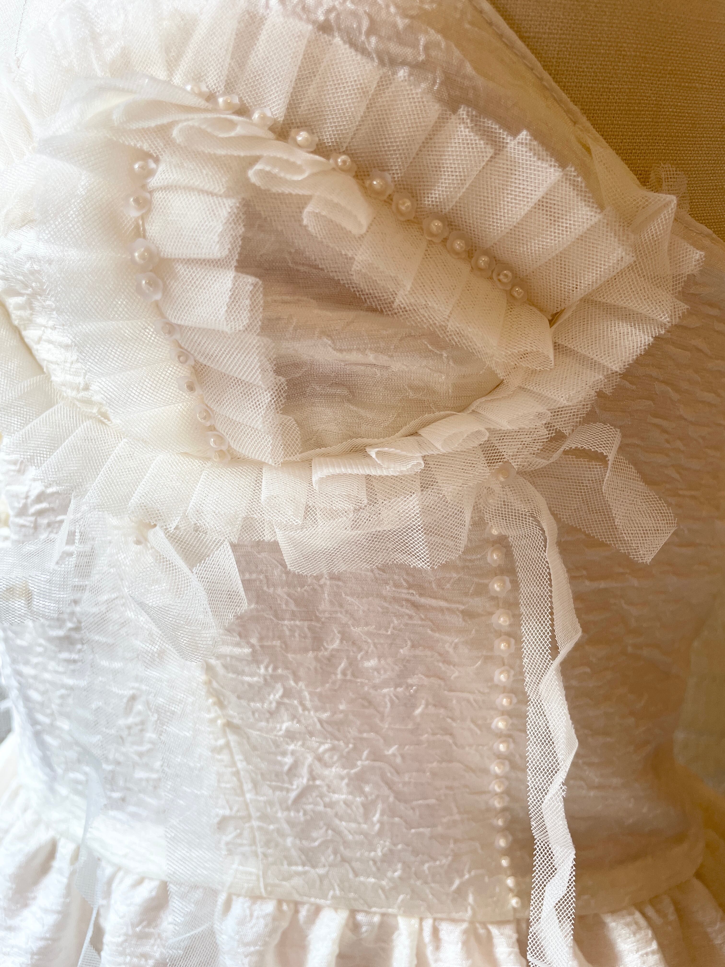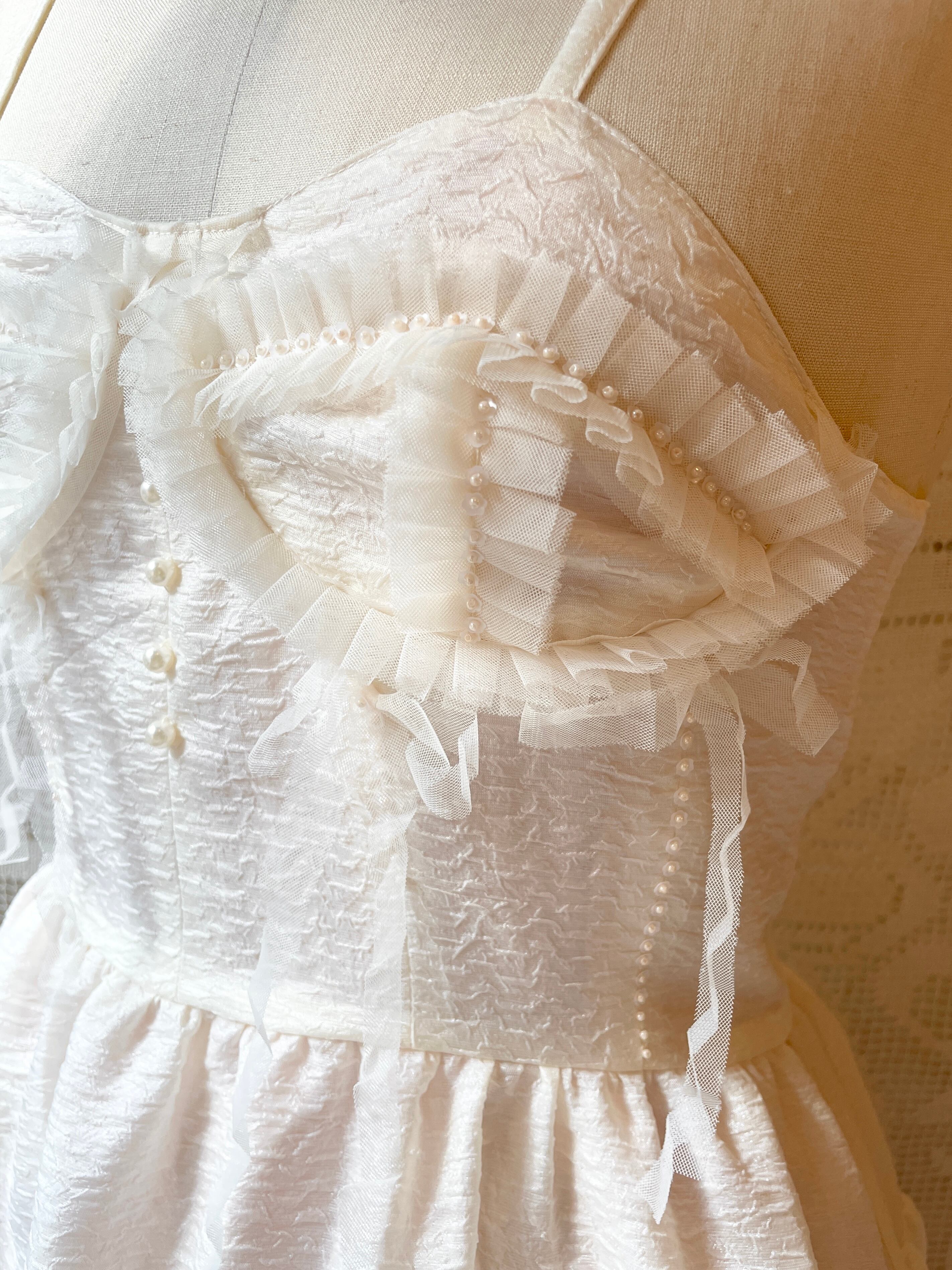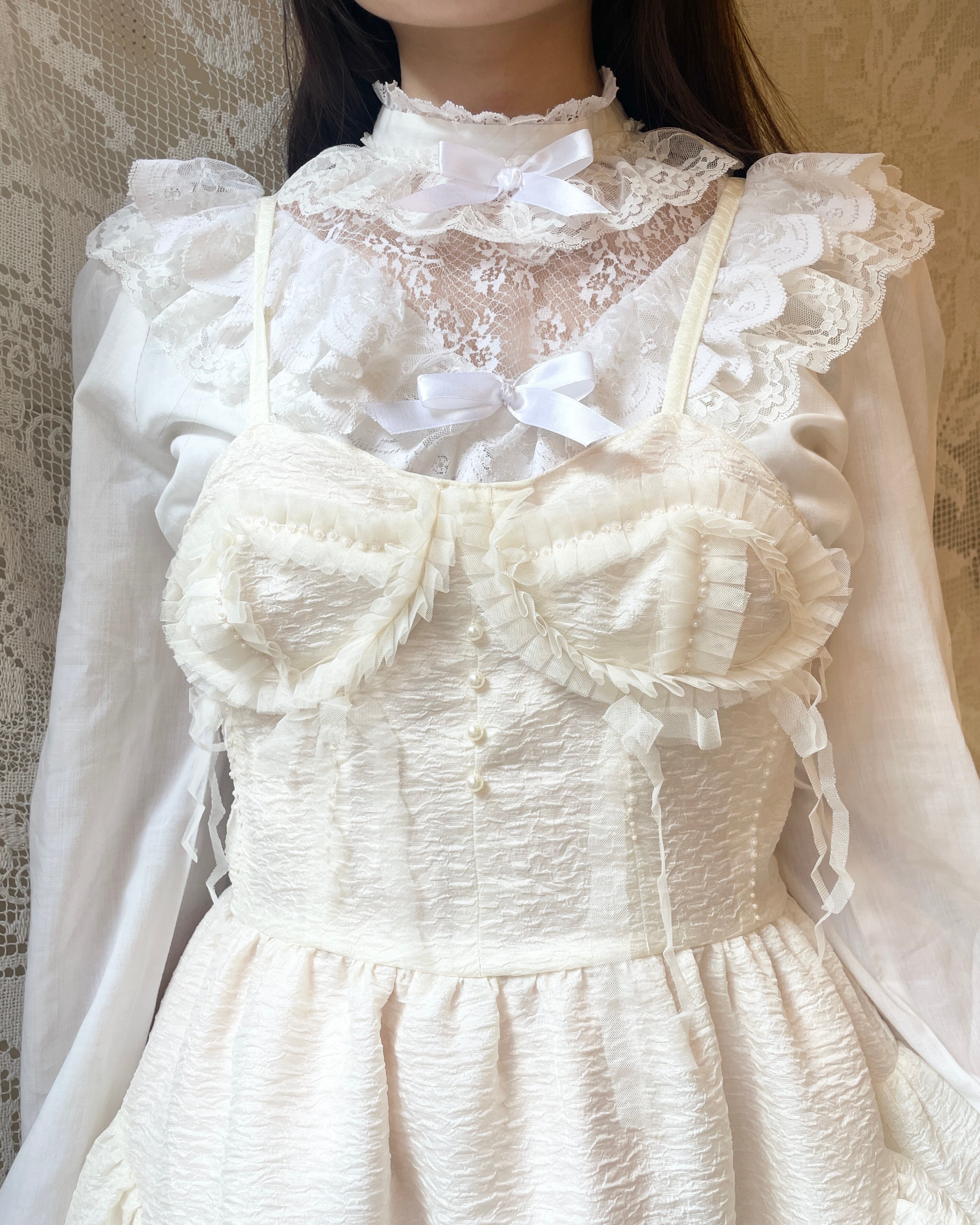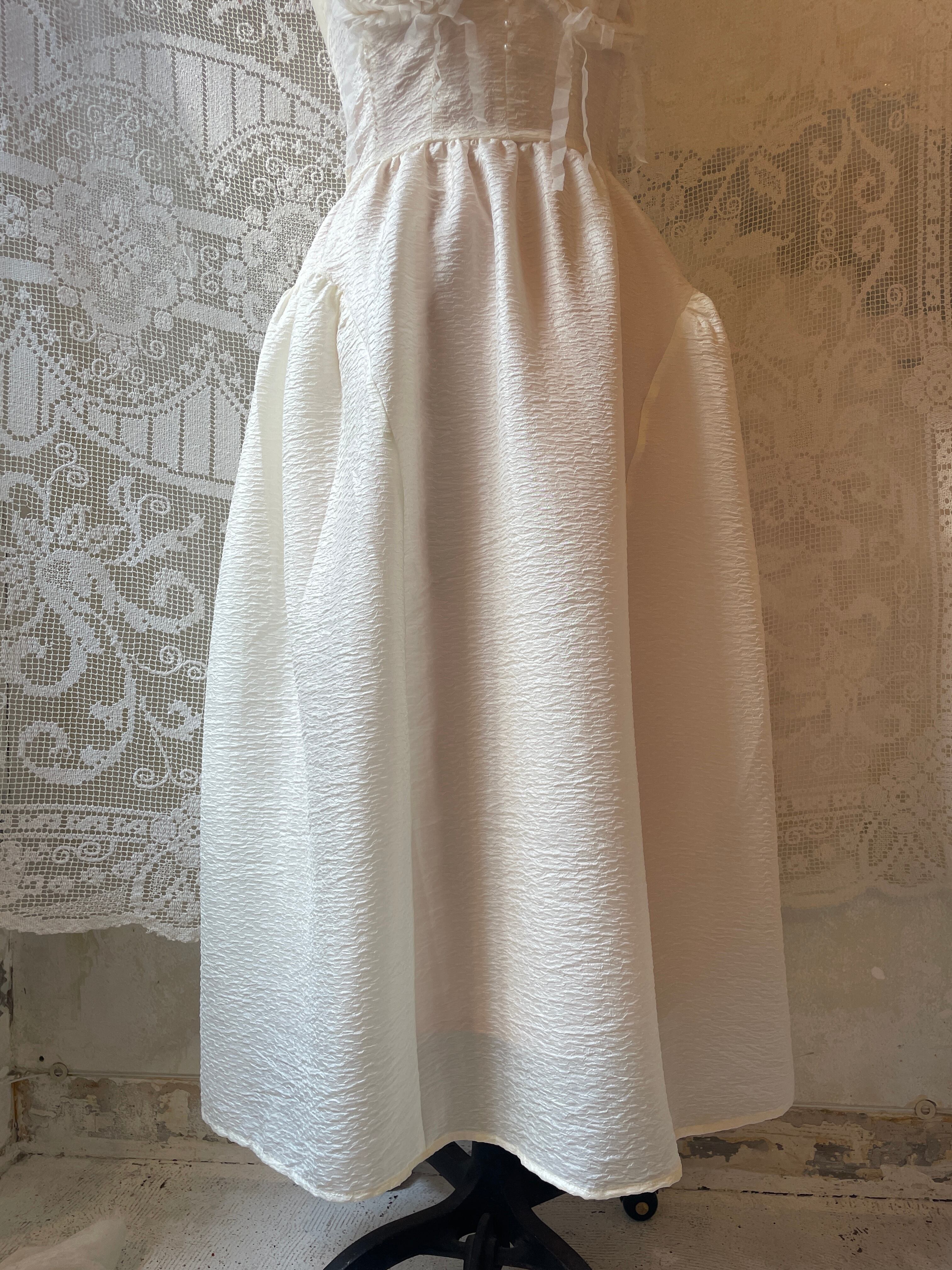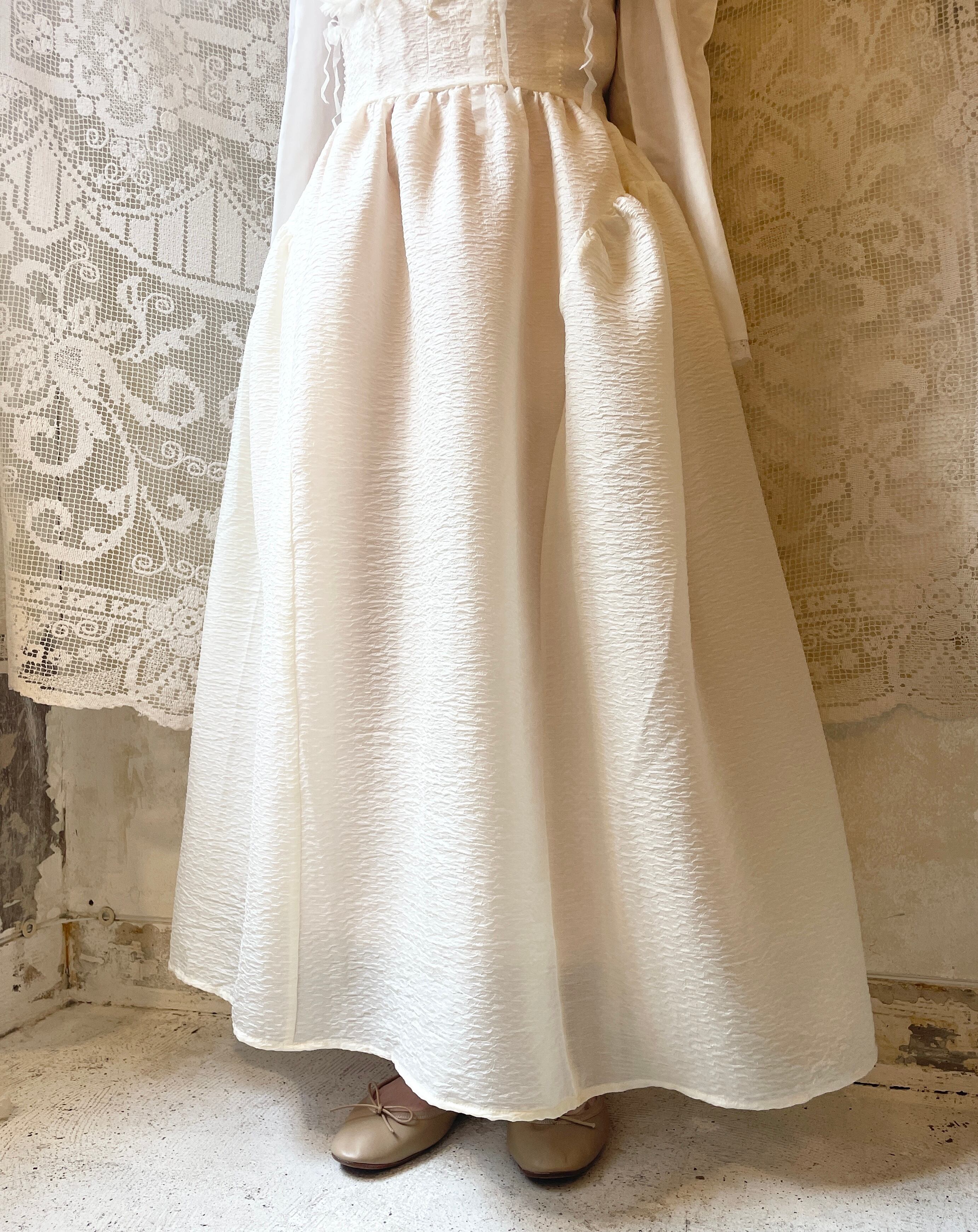 vintageドレスのような少しハリのある生成り色の生地で制作しています。