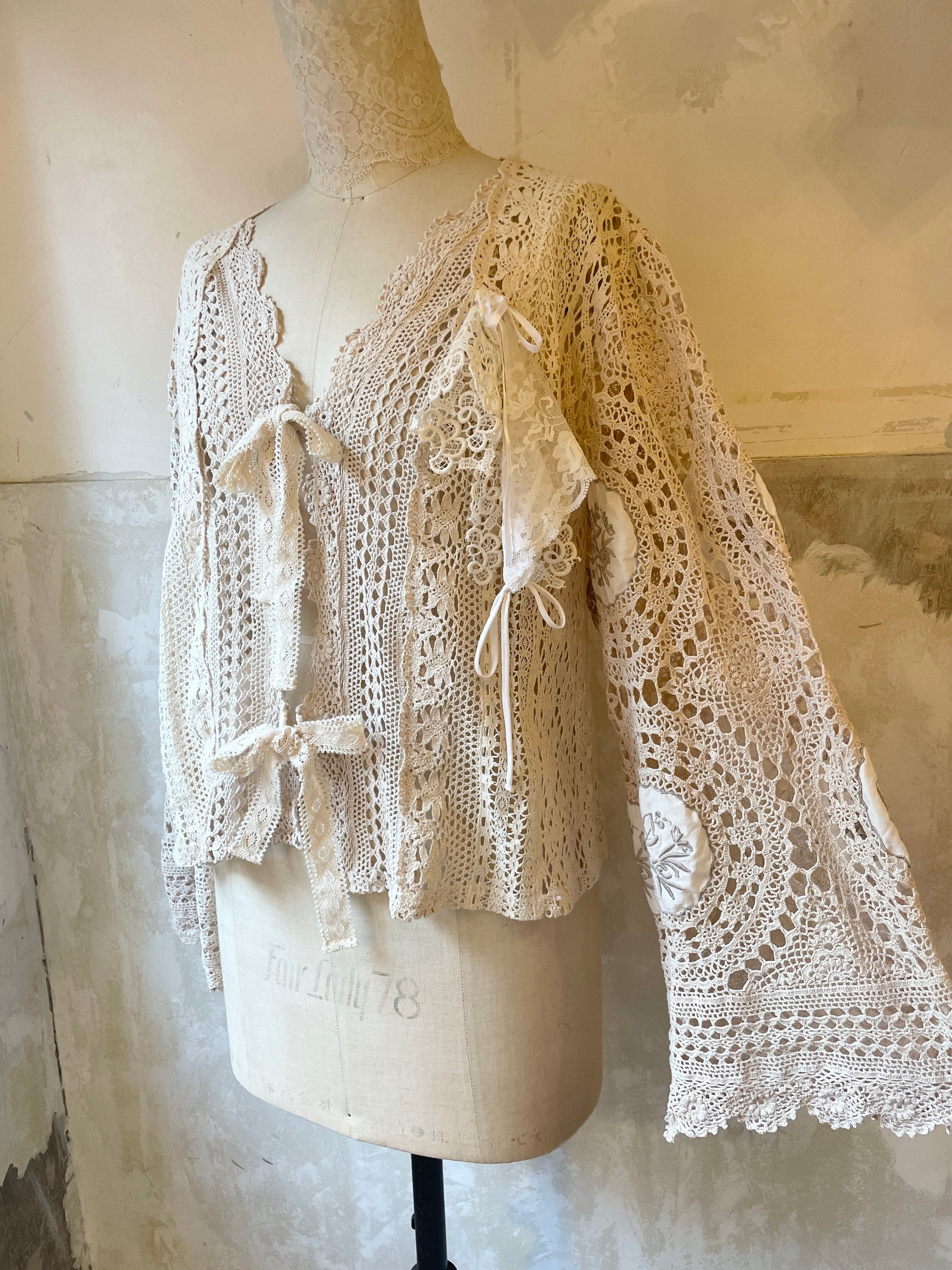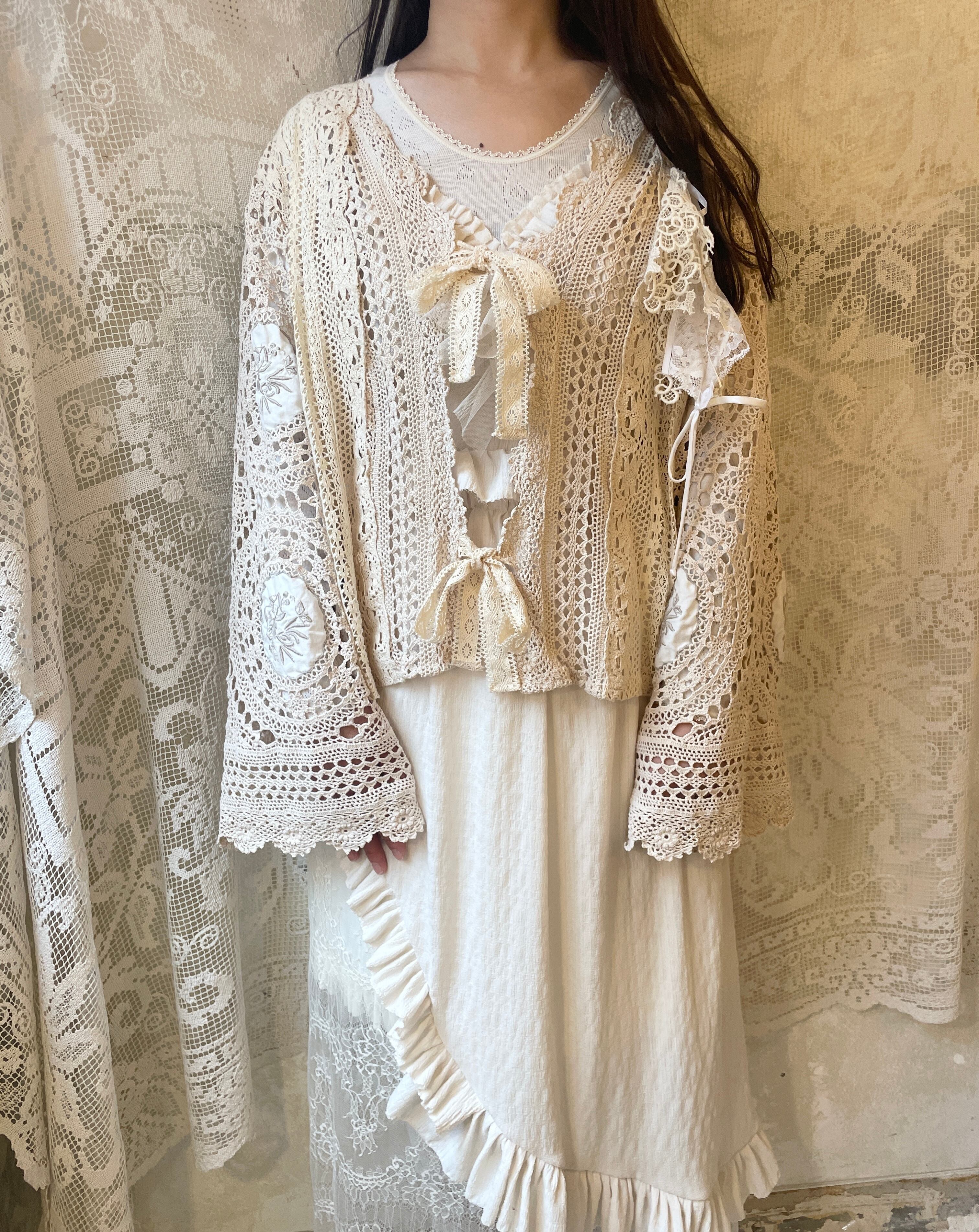 vintageのレース生地をたっぷり使用して作られたカーディガン。
