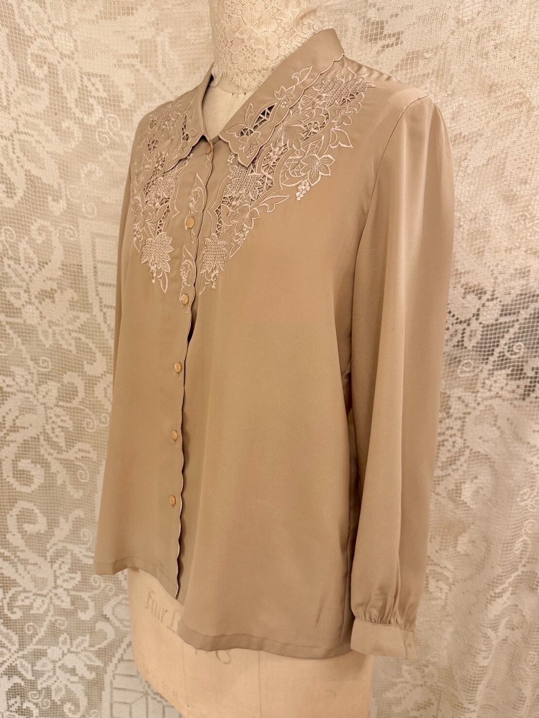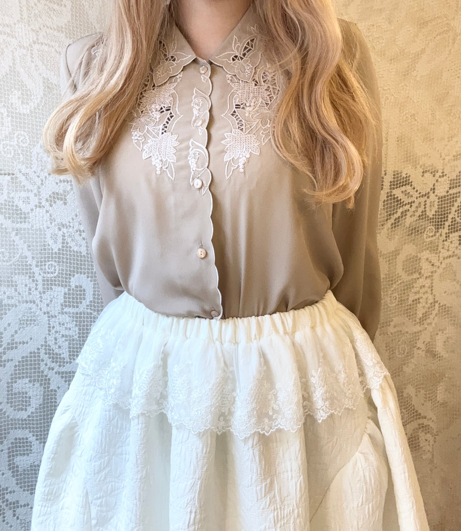 胸まわり、襟にはカットワークの刺繍˖ ࣪⊹