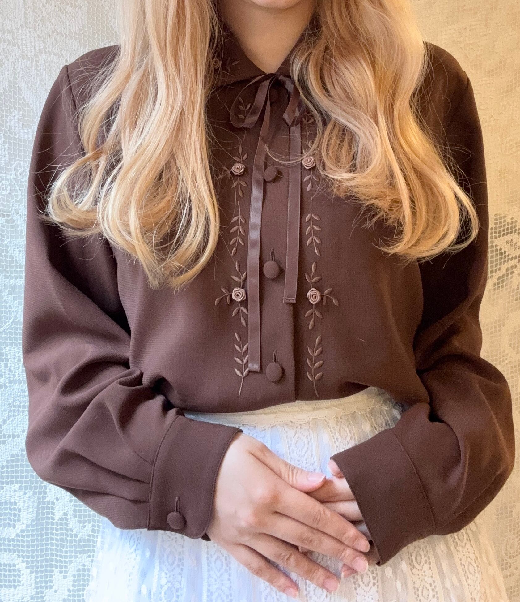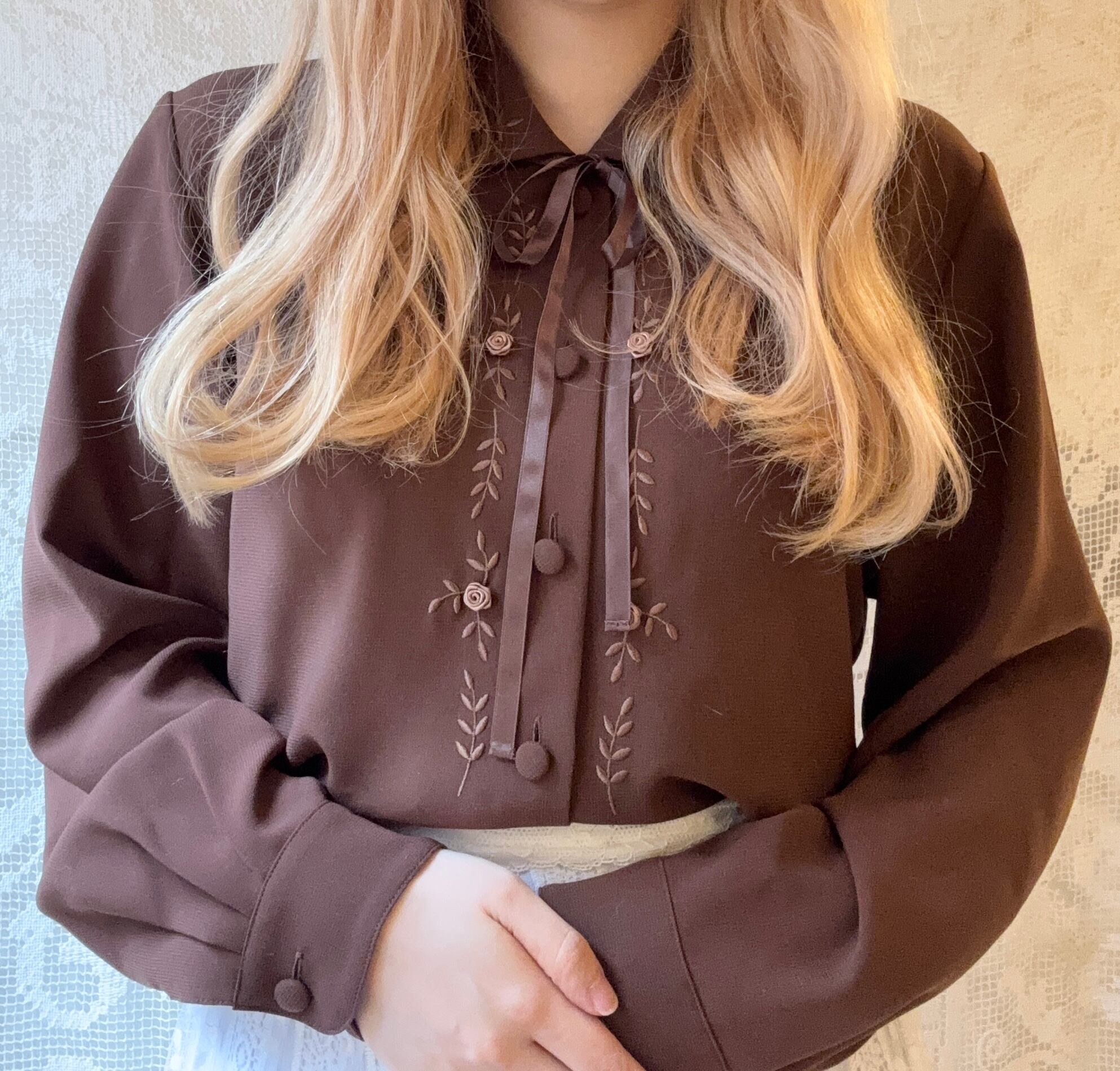 襟元のサテンリボンに加えて、薔薇のモチーフが散らばっていて可愛い要素が詰め込まれたブラウスです˖ ࣪⊹