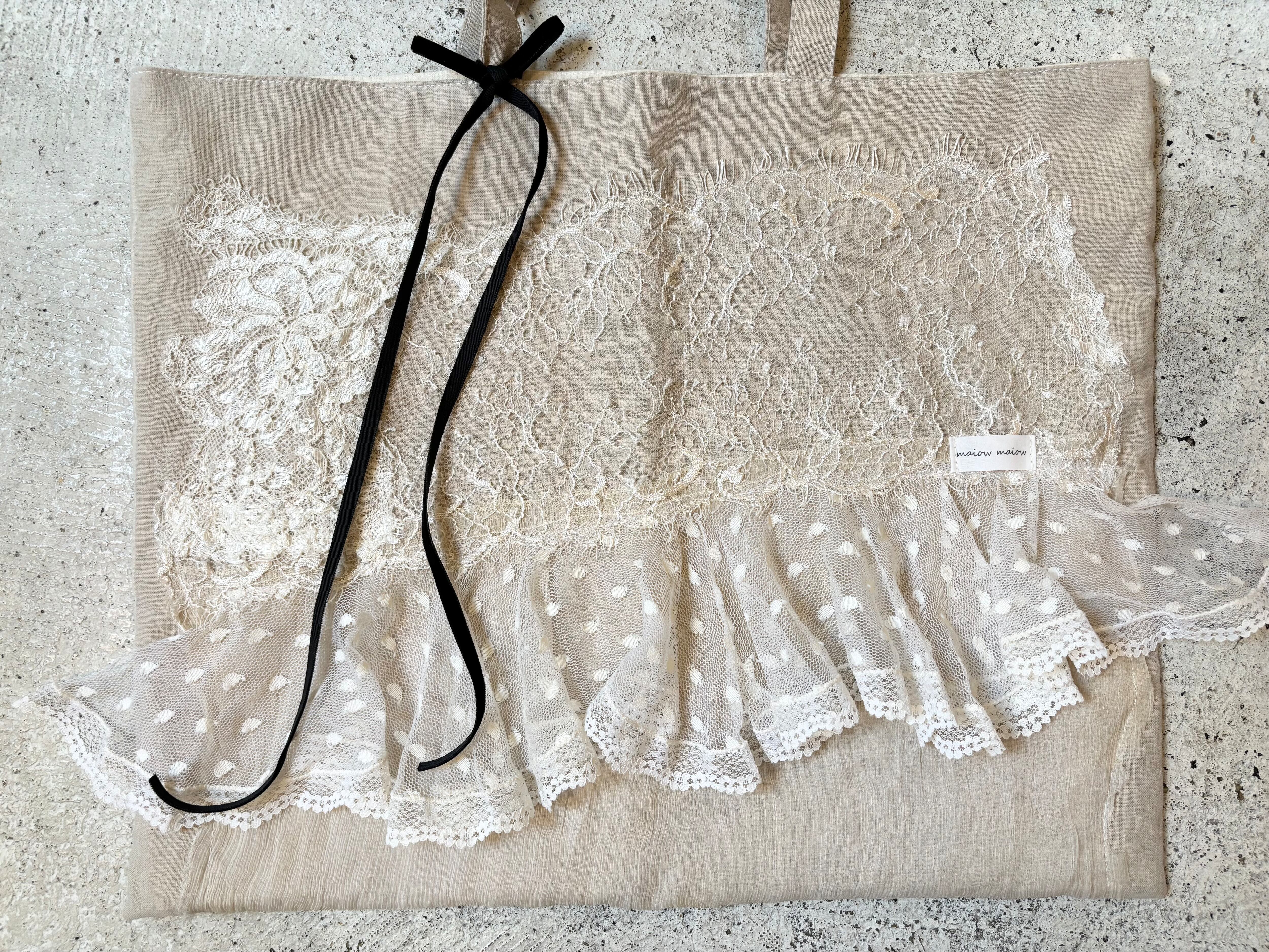 リネン系のベージュ生地に繊細なホワイトレース、黒のリボンがアクセントになり大人らしい可愛さを演出してくれます˖ ࣪⊹