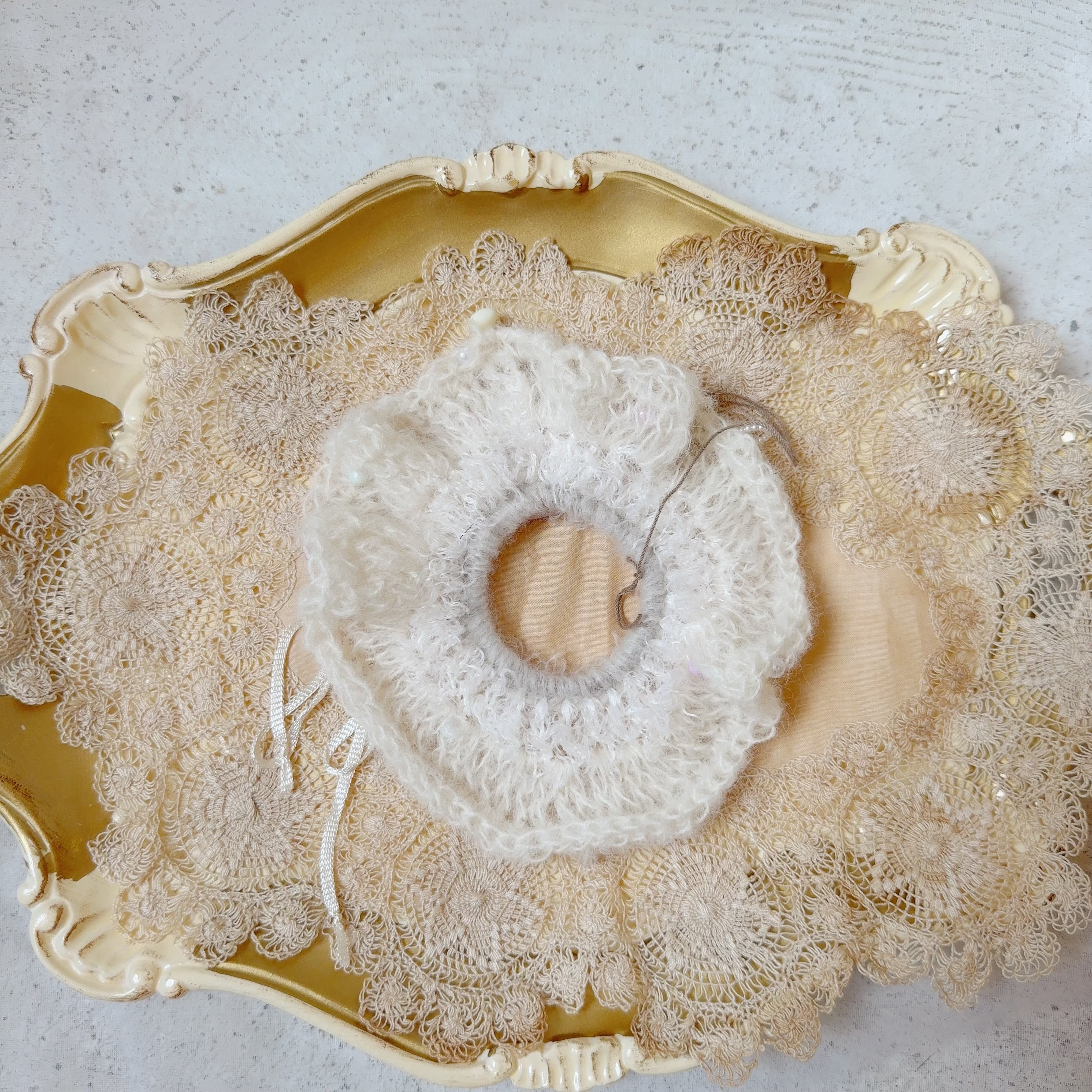 ホワイト・淡ピンクカラーのふんわり柔らかいニットにビーズやリボン等一つ一つ手作業で散りばめた繊細なデザインがとても可愛いです。