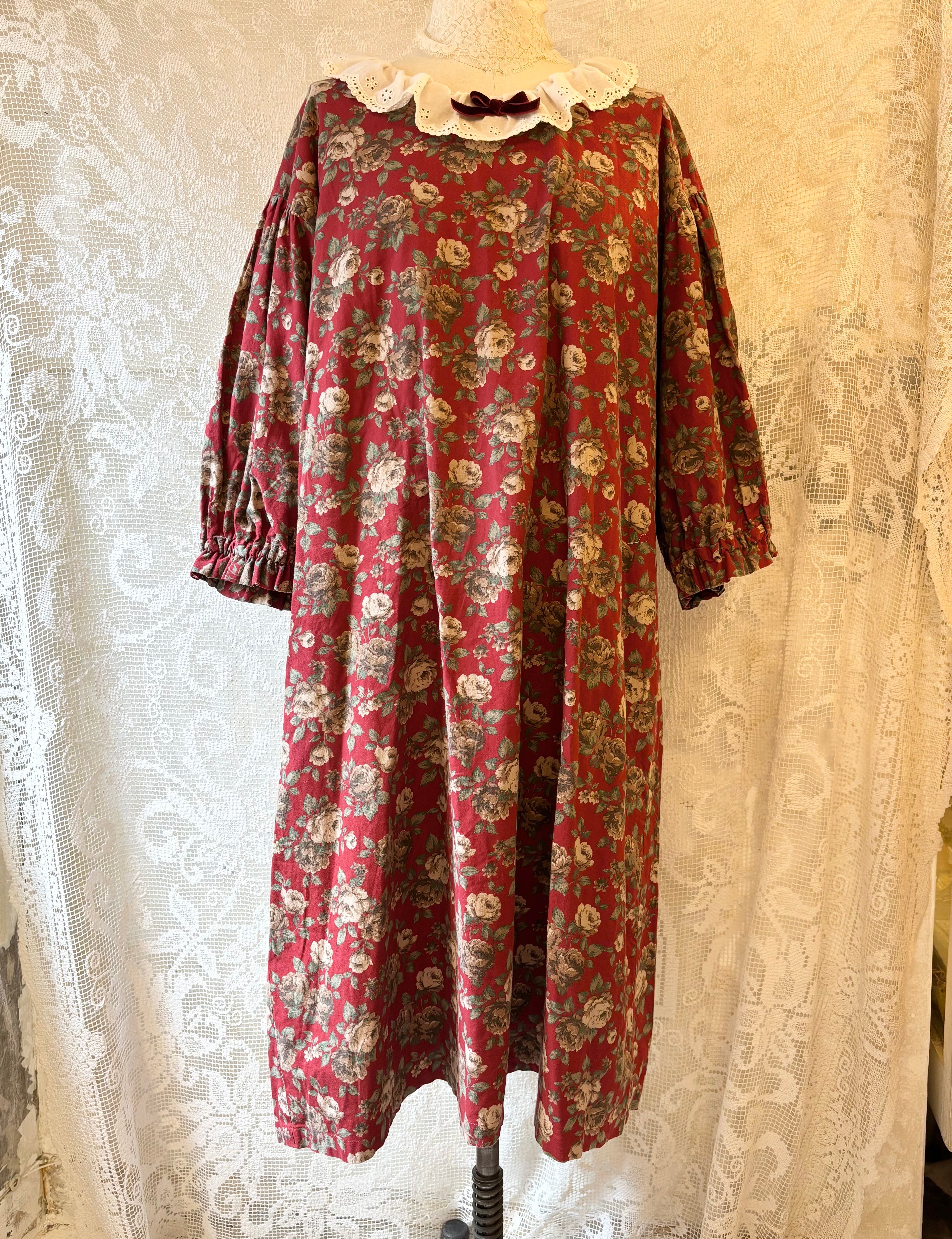 落ち着いた赤色に薔薇模様のvintageワンピースにに生成りのフリル襟とベロアリボンをプラスしたキュートなデザイン˖ ࣪⊹