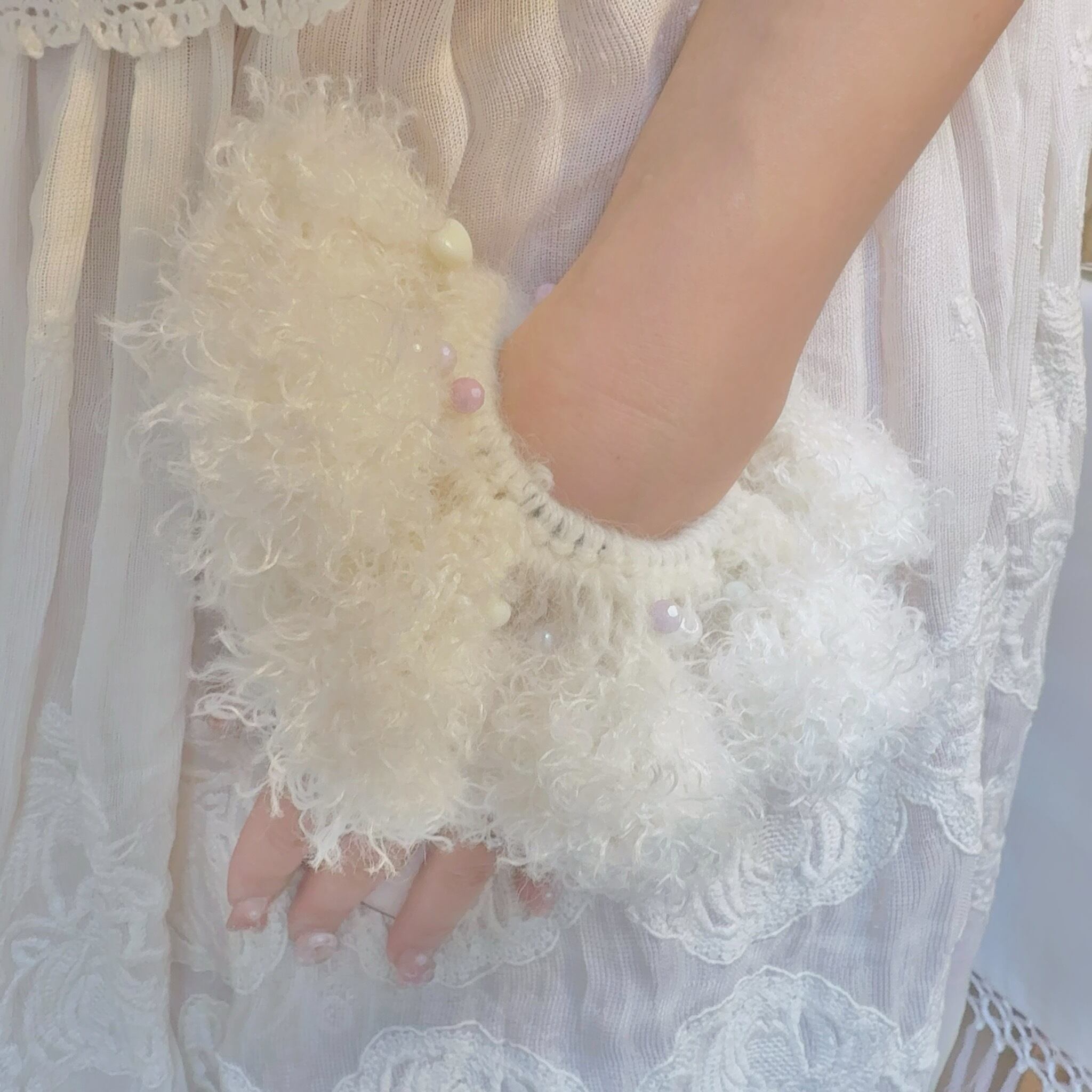 淡いピンク・パープル系のカラーが混じったふんわり柔らかいニットにビーズやリボン等一つ一つ手作業で散りばめた繊細なデザインがとても可愛いです。
