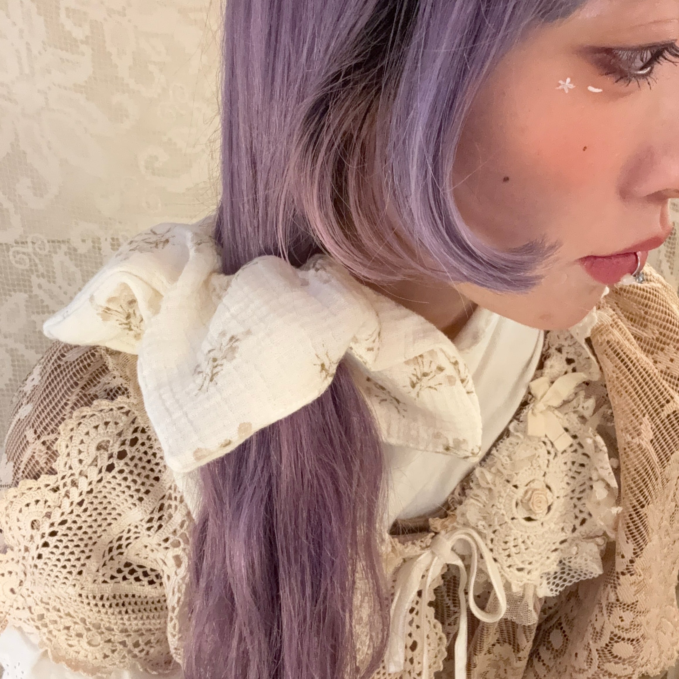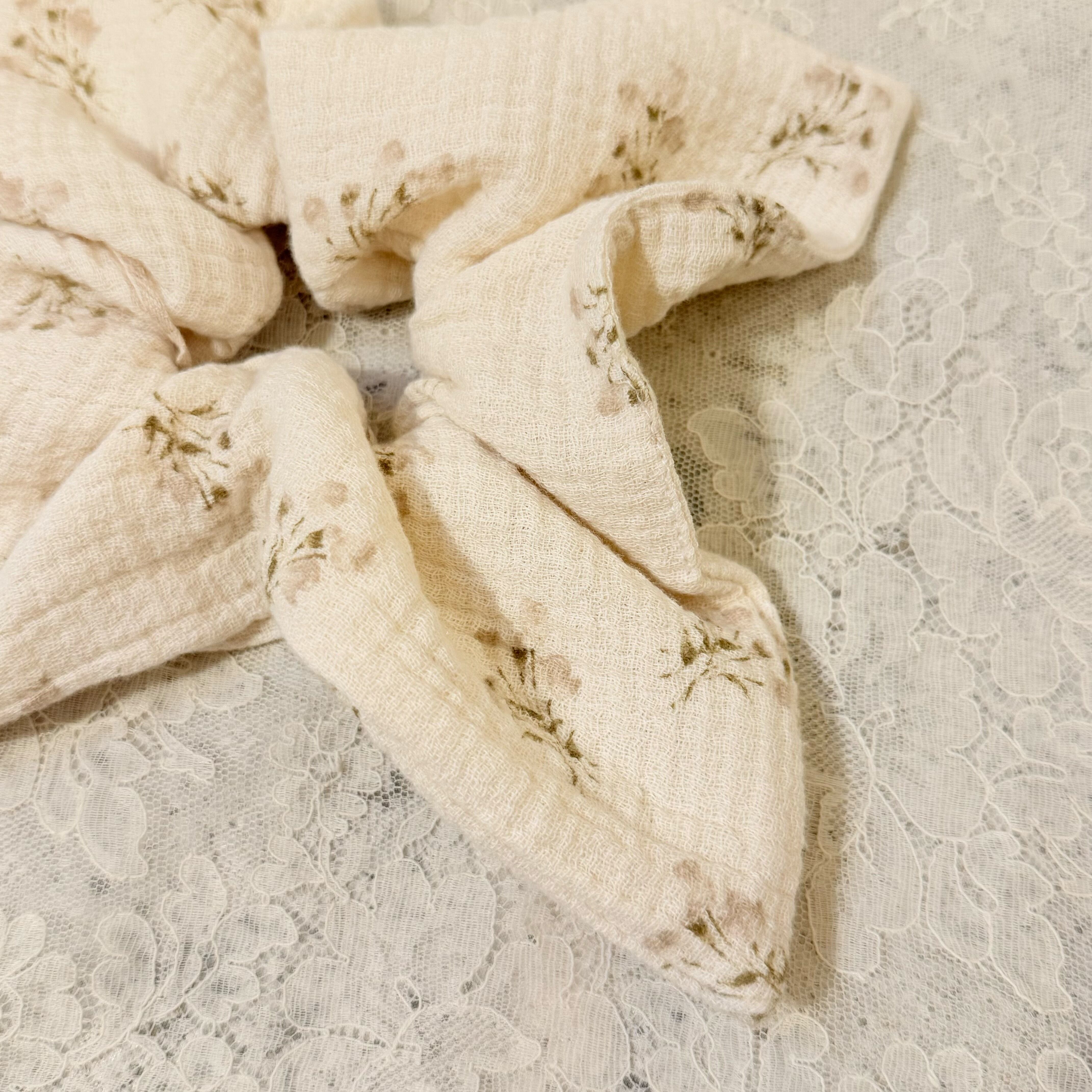 淡いベージュ系の花柄のダブルガーゼ生地で制作されたシュシュ。