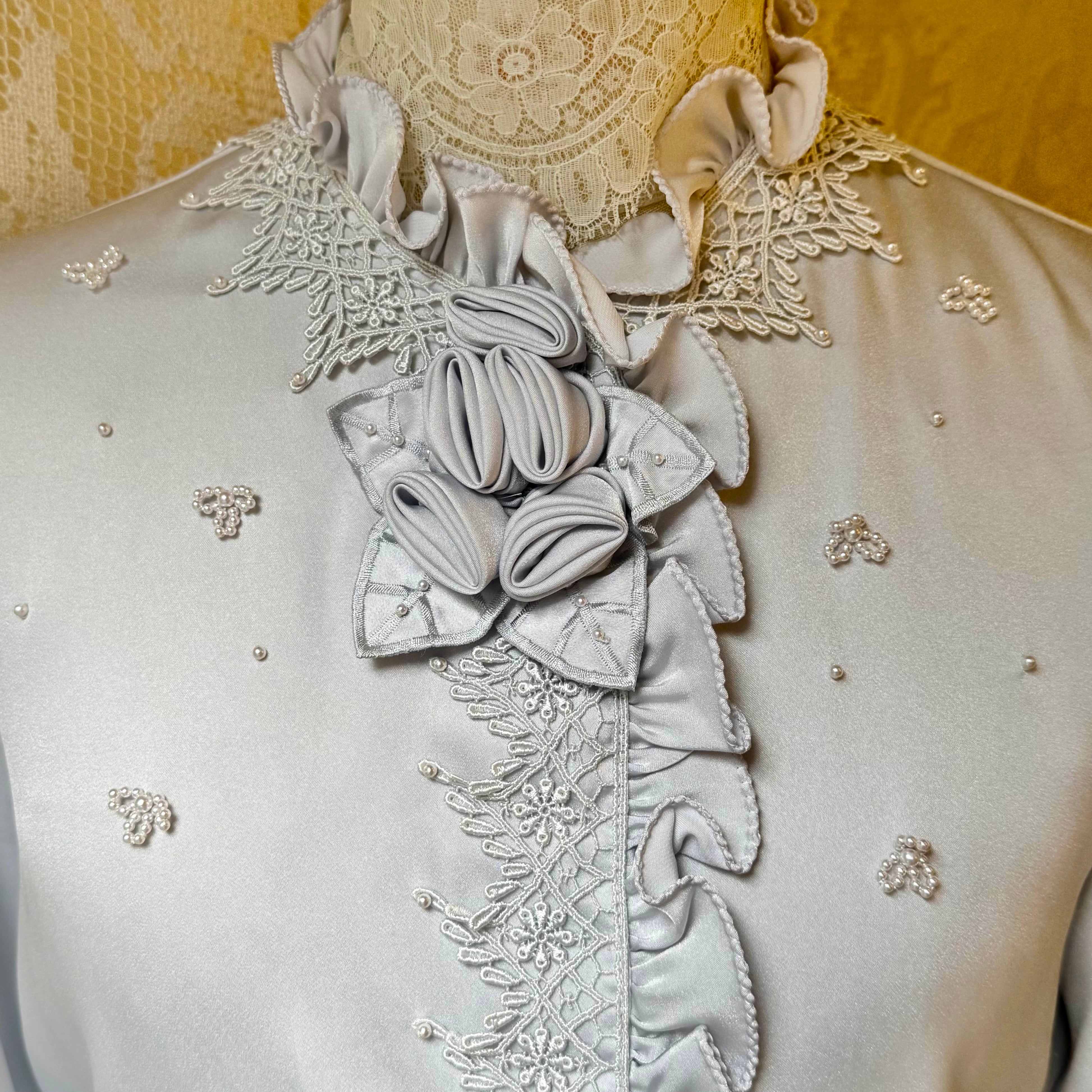 胸元まわりは共布の薔薇のモチーフやレースの装飾が施してありとても華やかなデザイン˖ ࣪⊹
