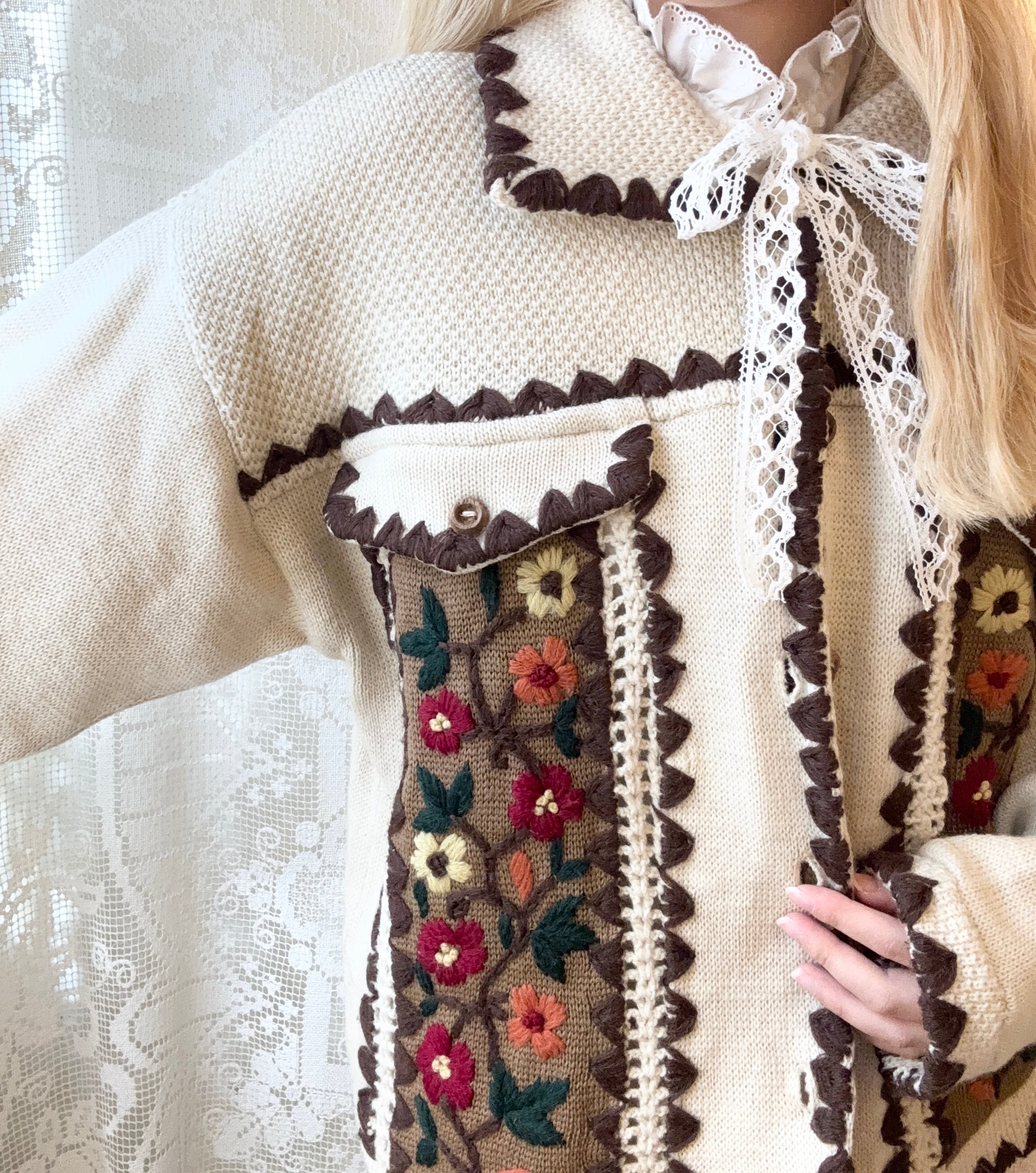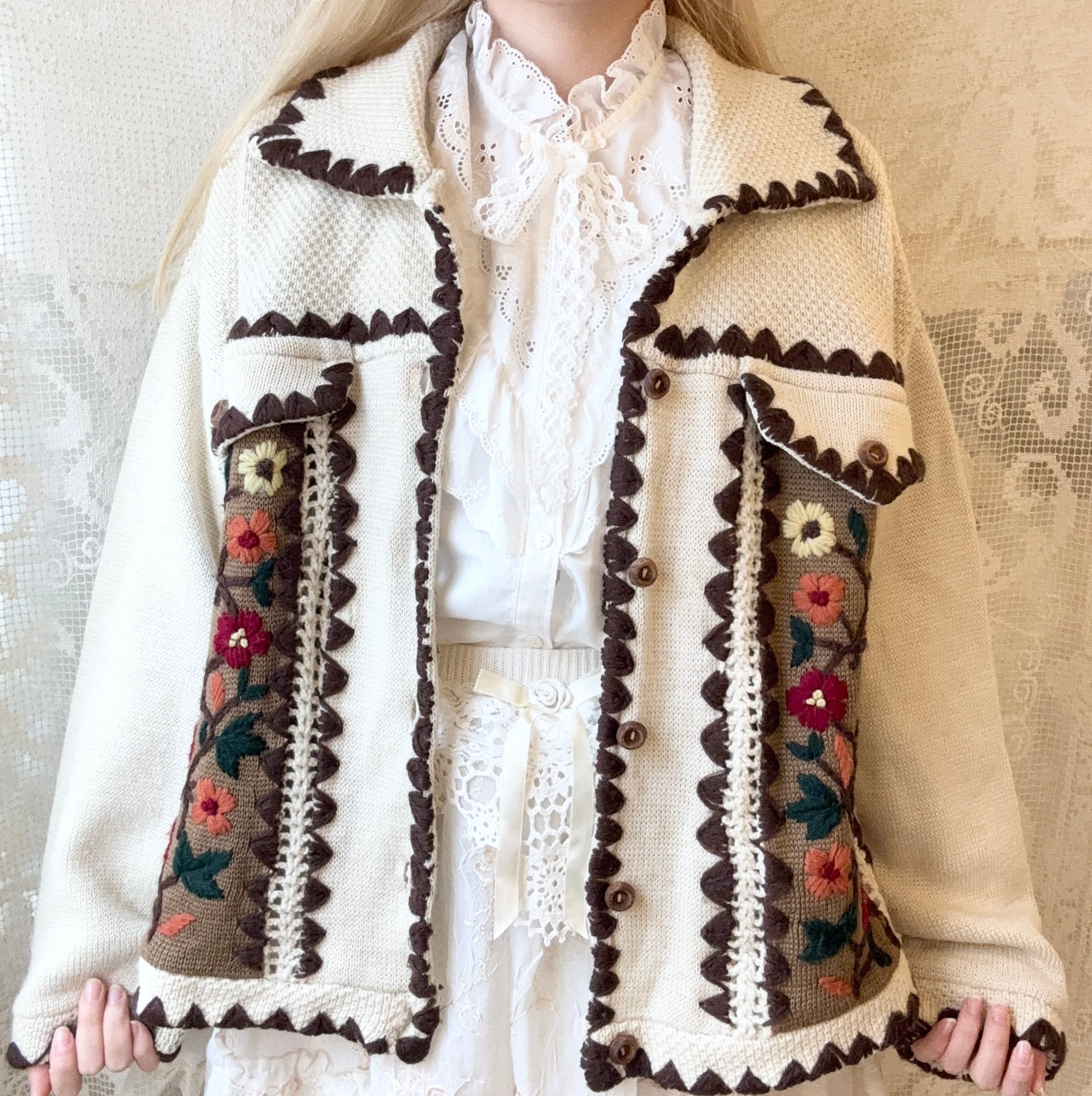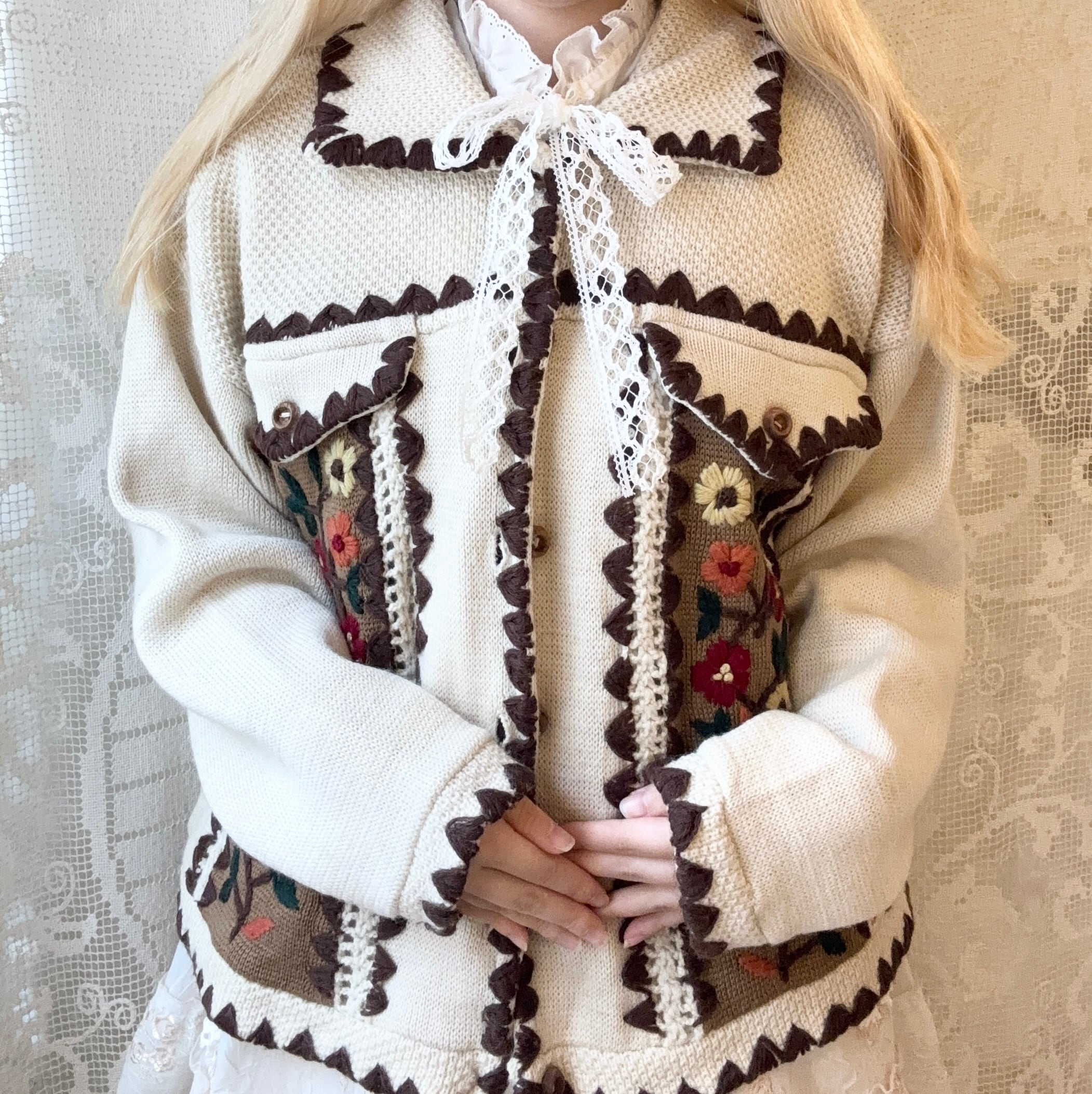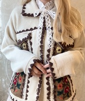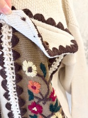 カーディガン全体のスカラップ、身頃にはニット刺繍が施されていて、全体として温かみのあるデザインとなっております。