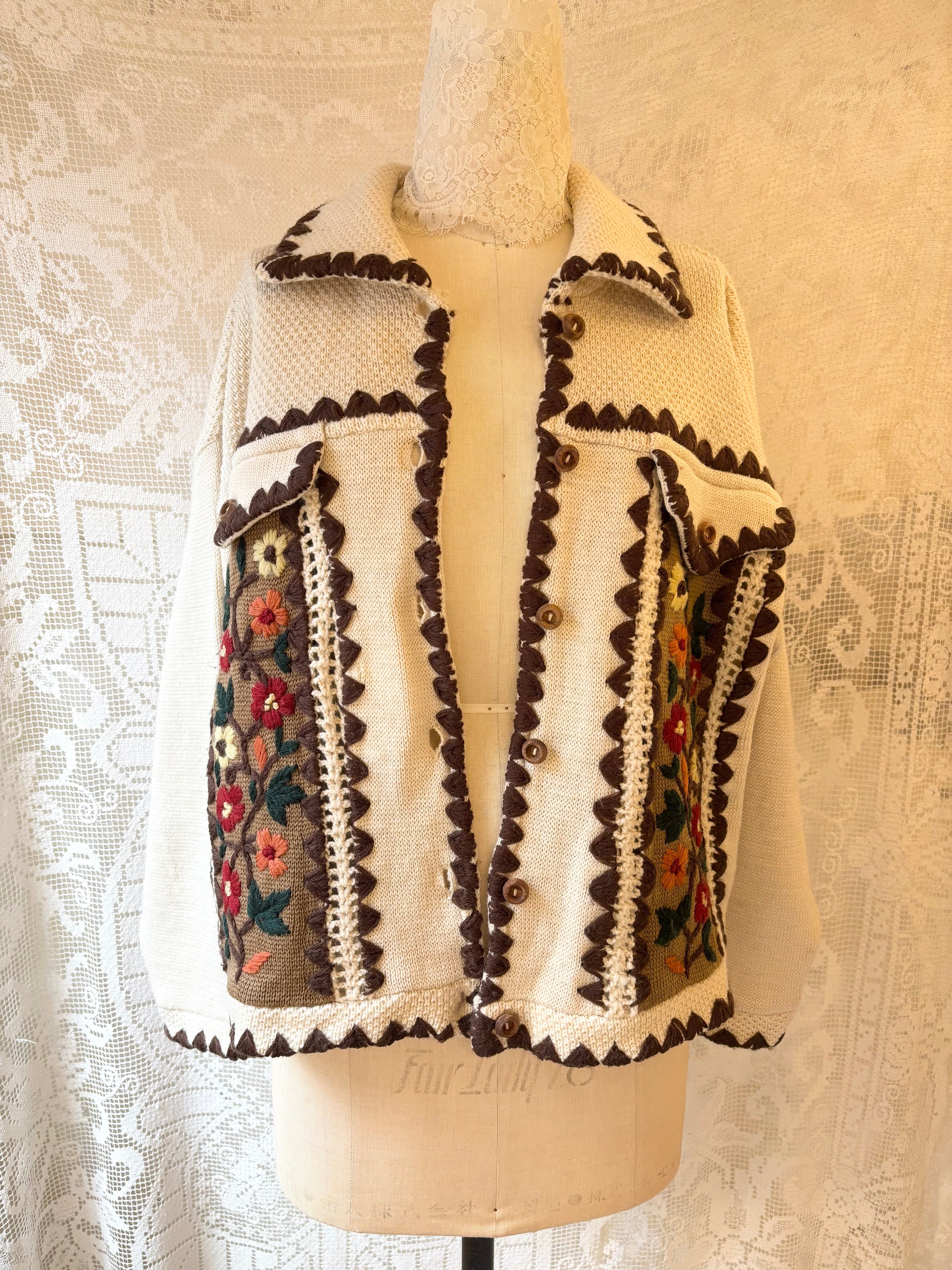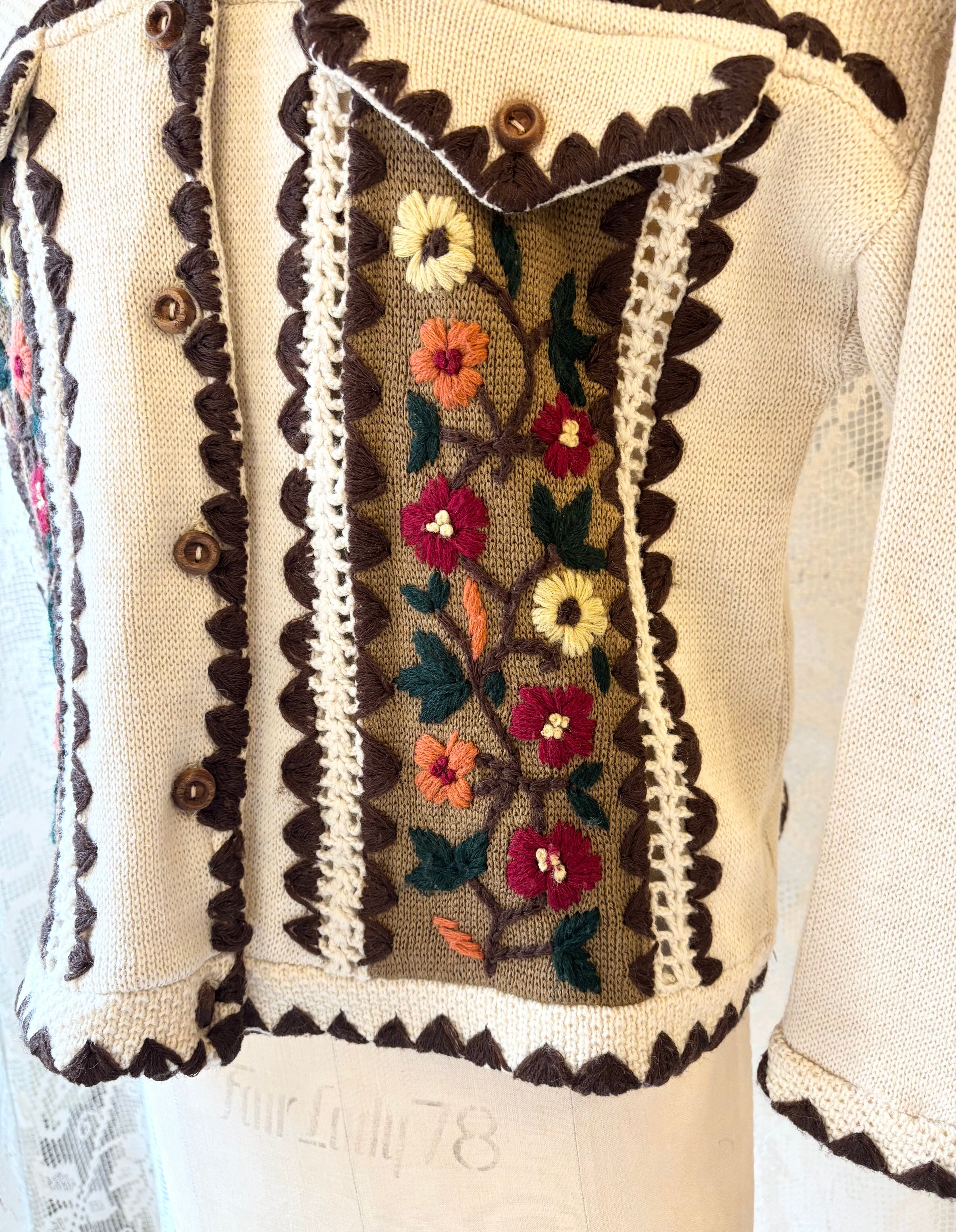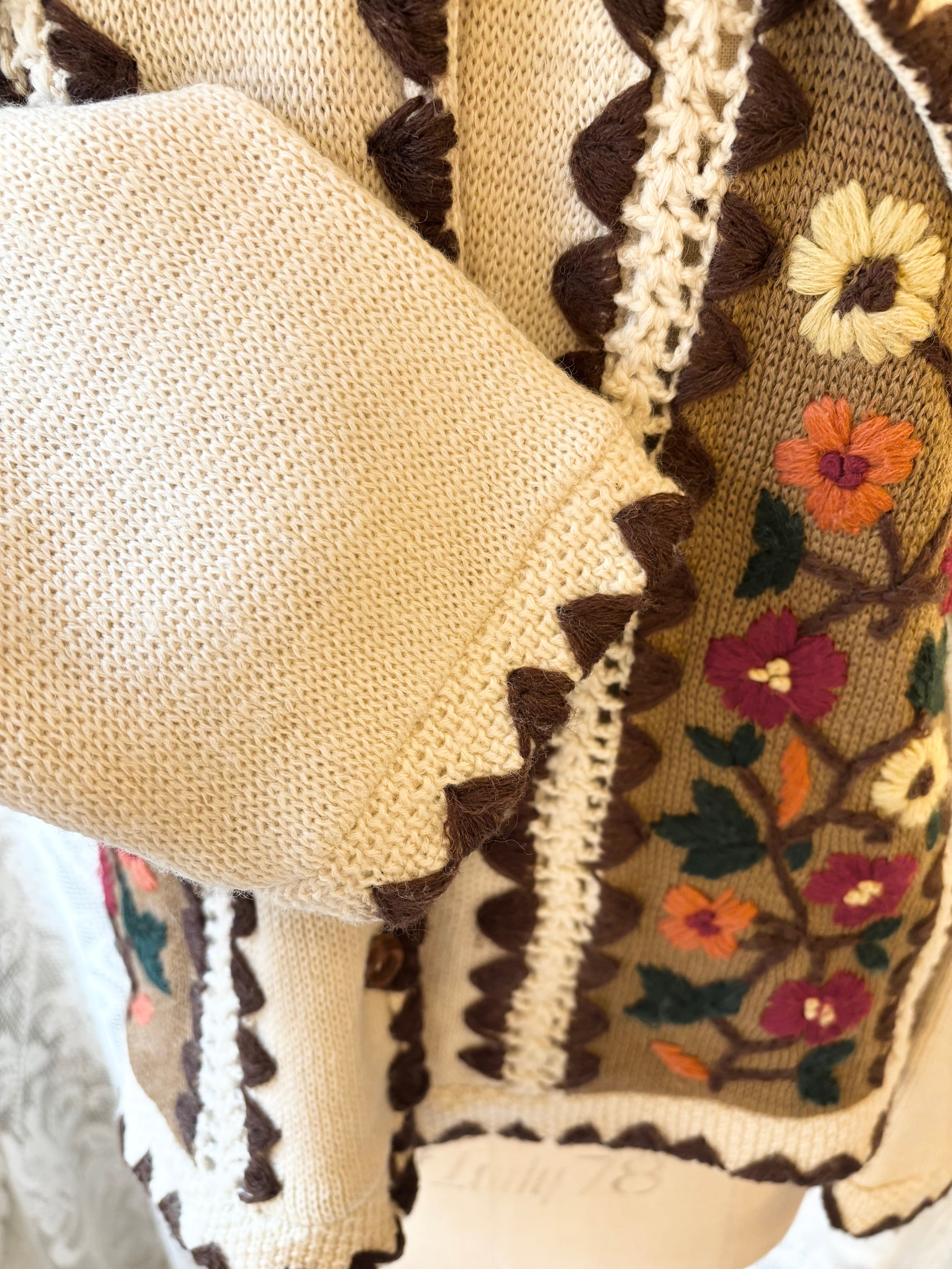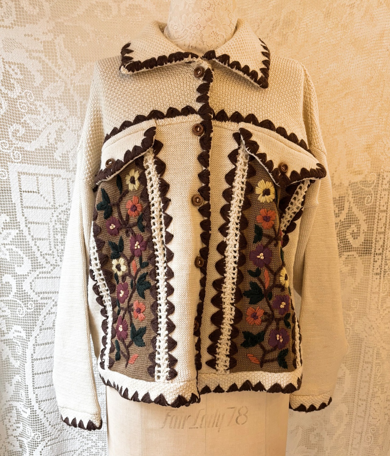 カーディガン全体のスカラップ、身頃にはニット刺繍が施されていて、全体として温かみのあるデザインとなっております。