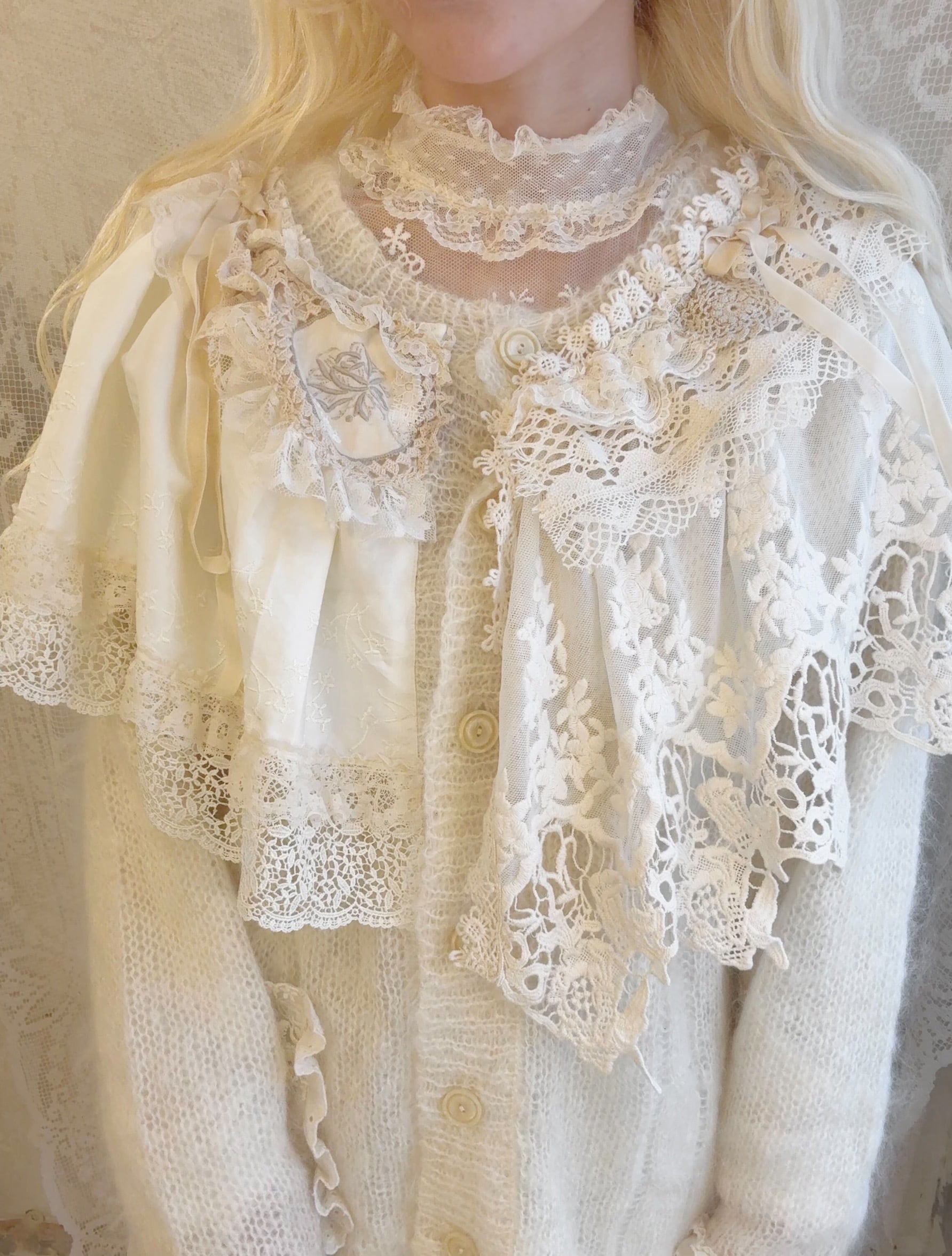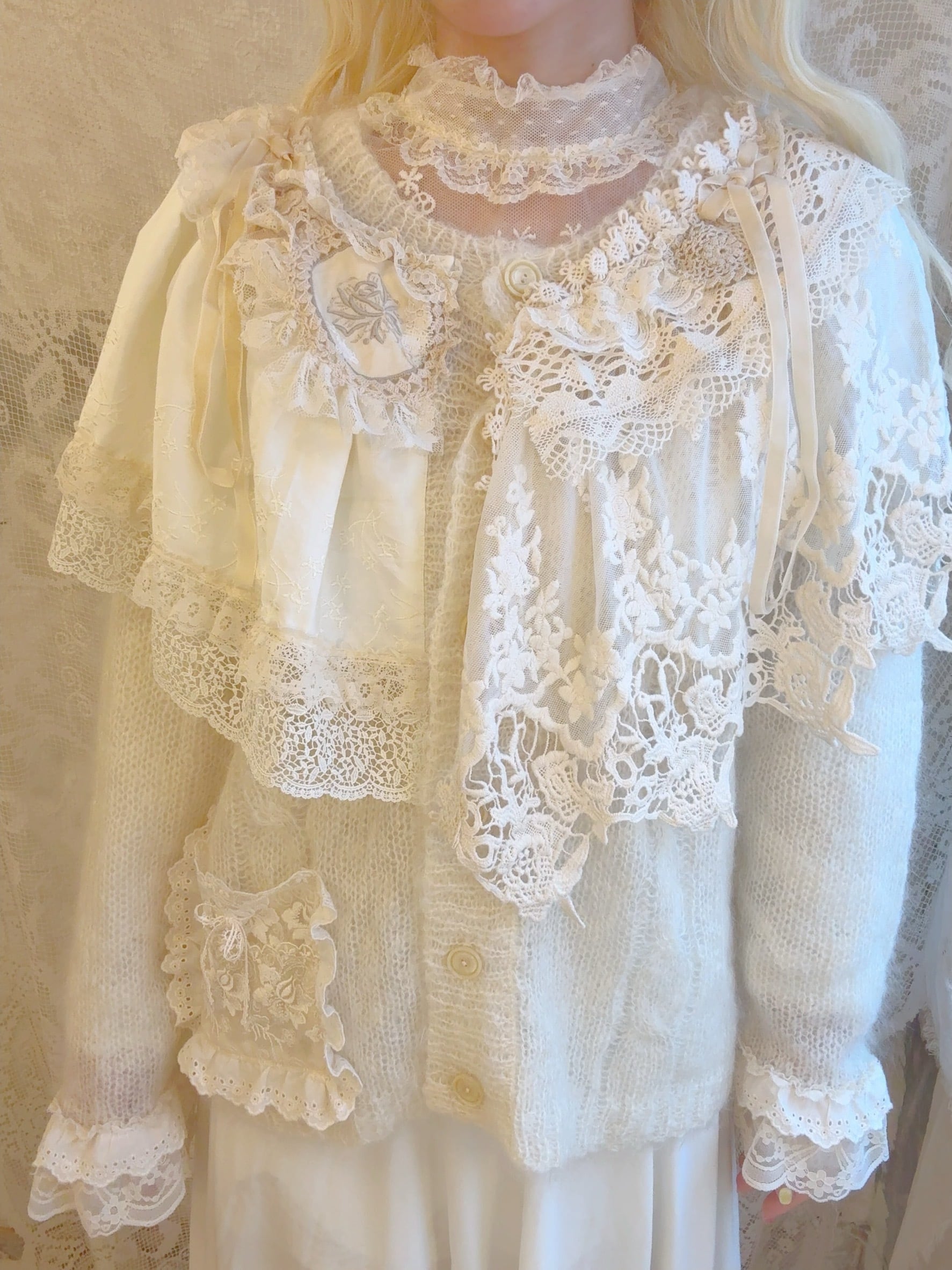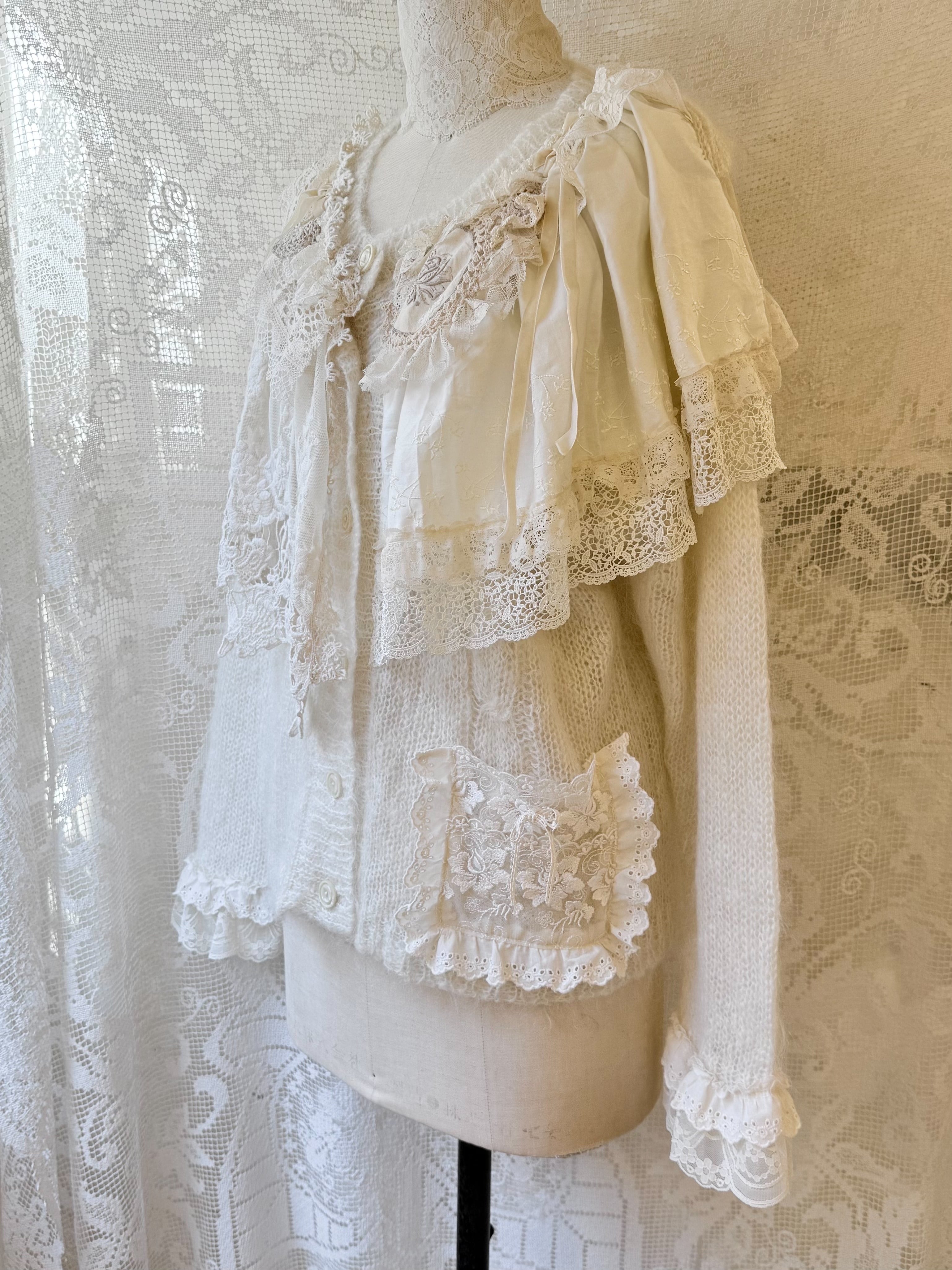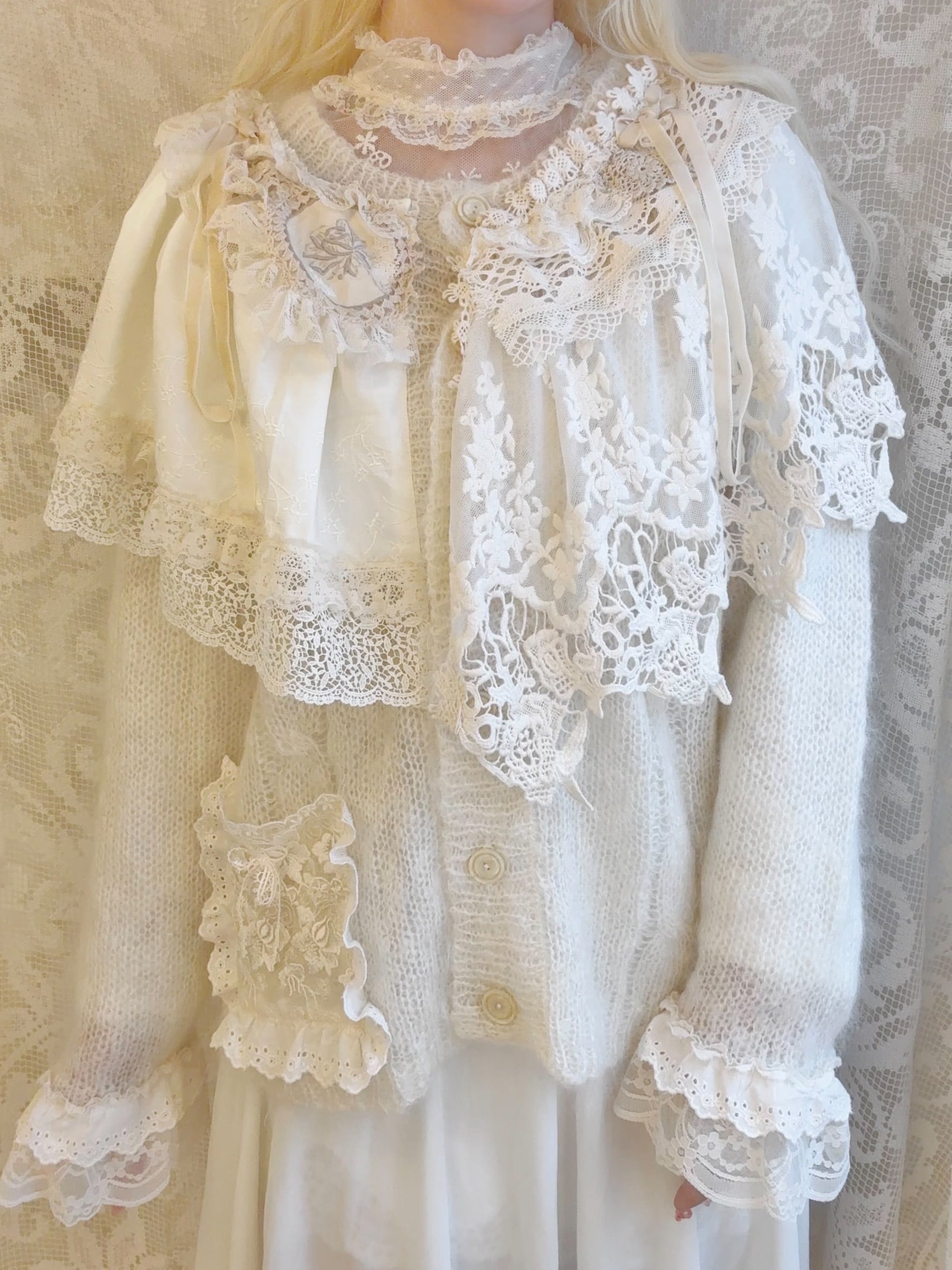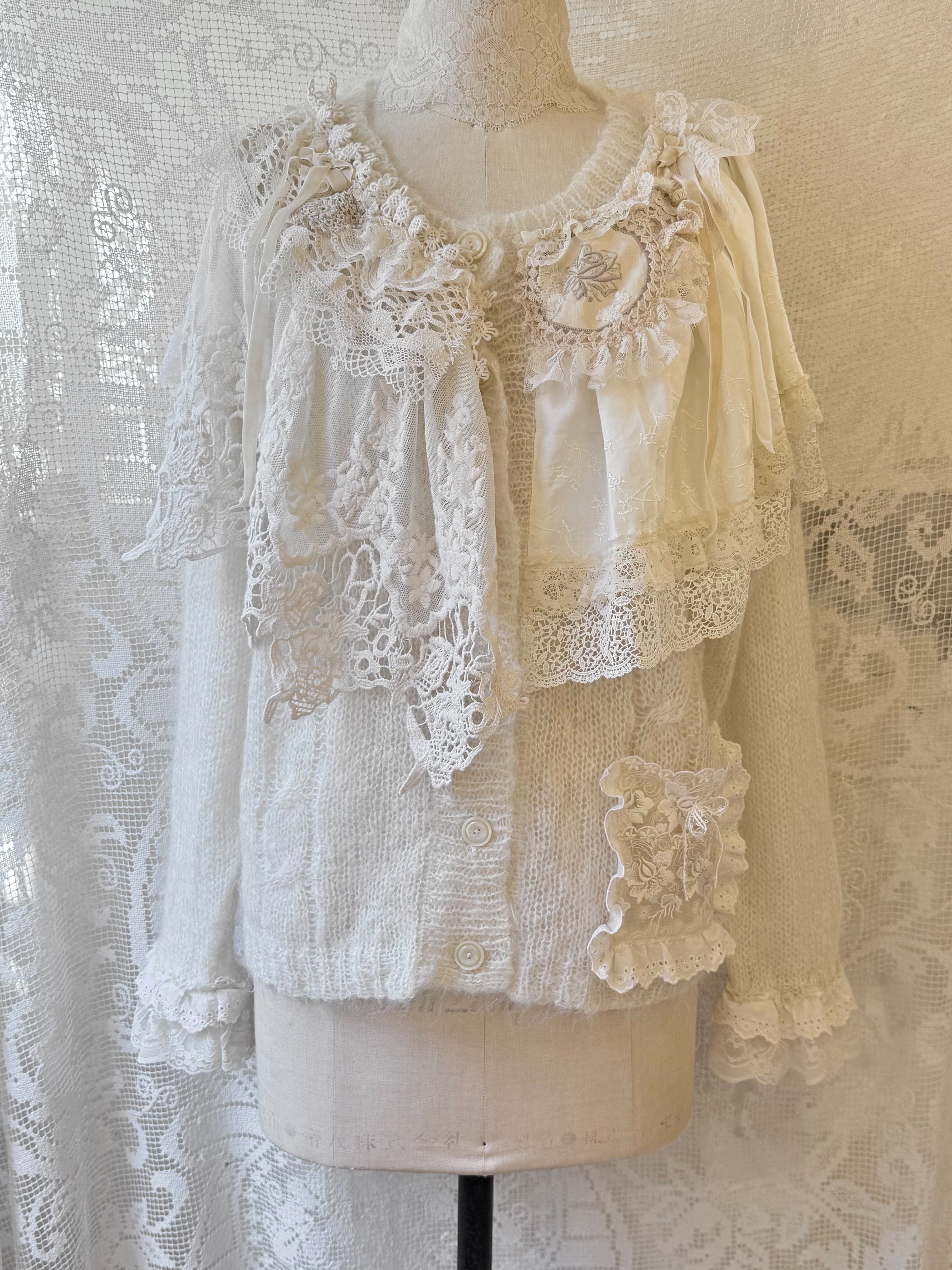 ふわふわ柔らかなvintageのウールニットカーディガンにvintageのレースや古着のかけら等をたっぷり装飾したリメイクアイテム。前を閉じてセーターのように着用しても可愛いです。