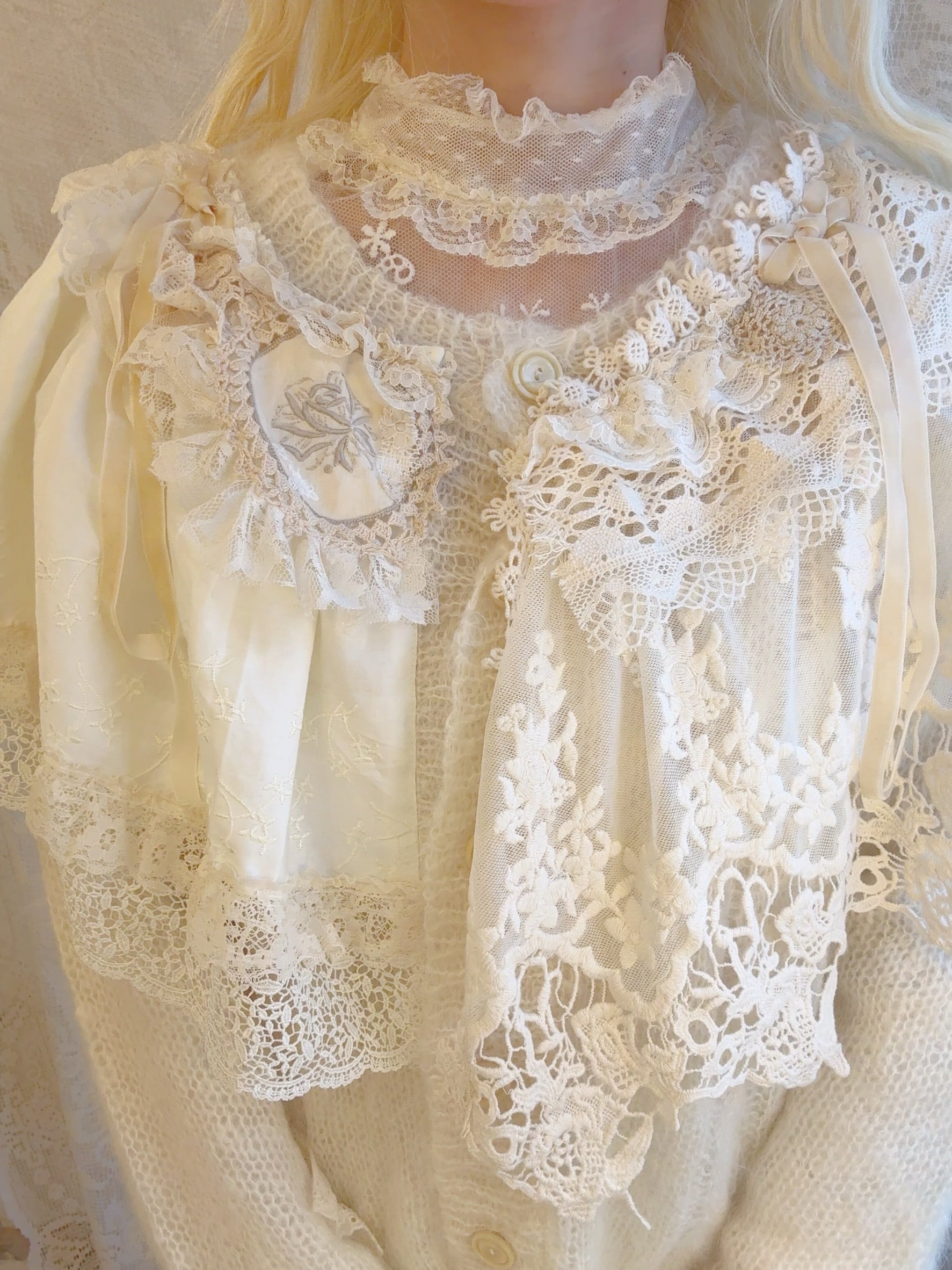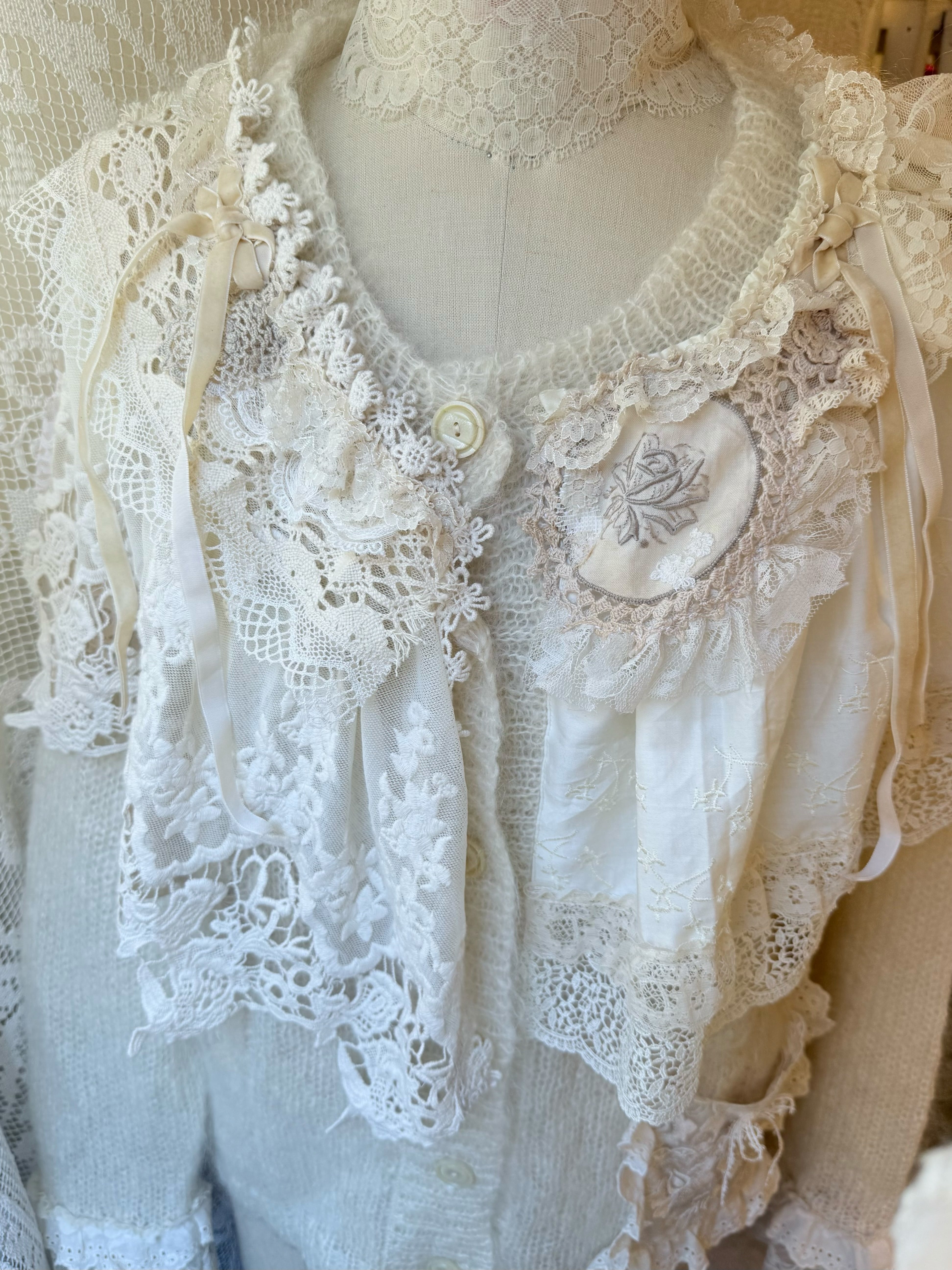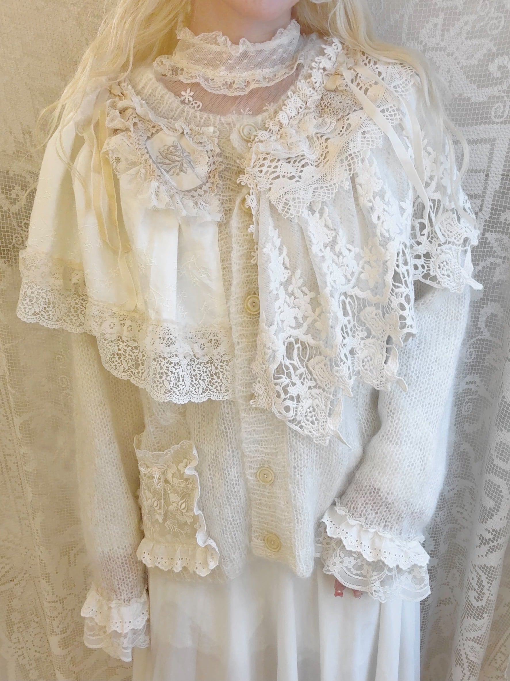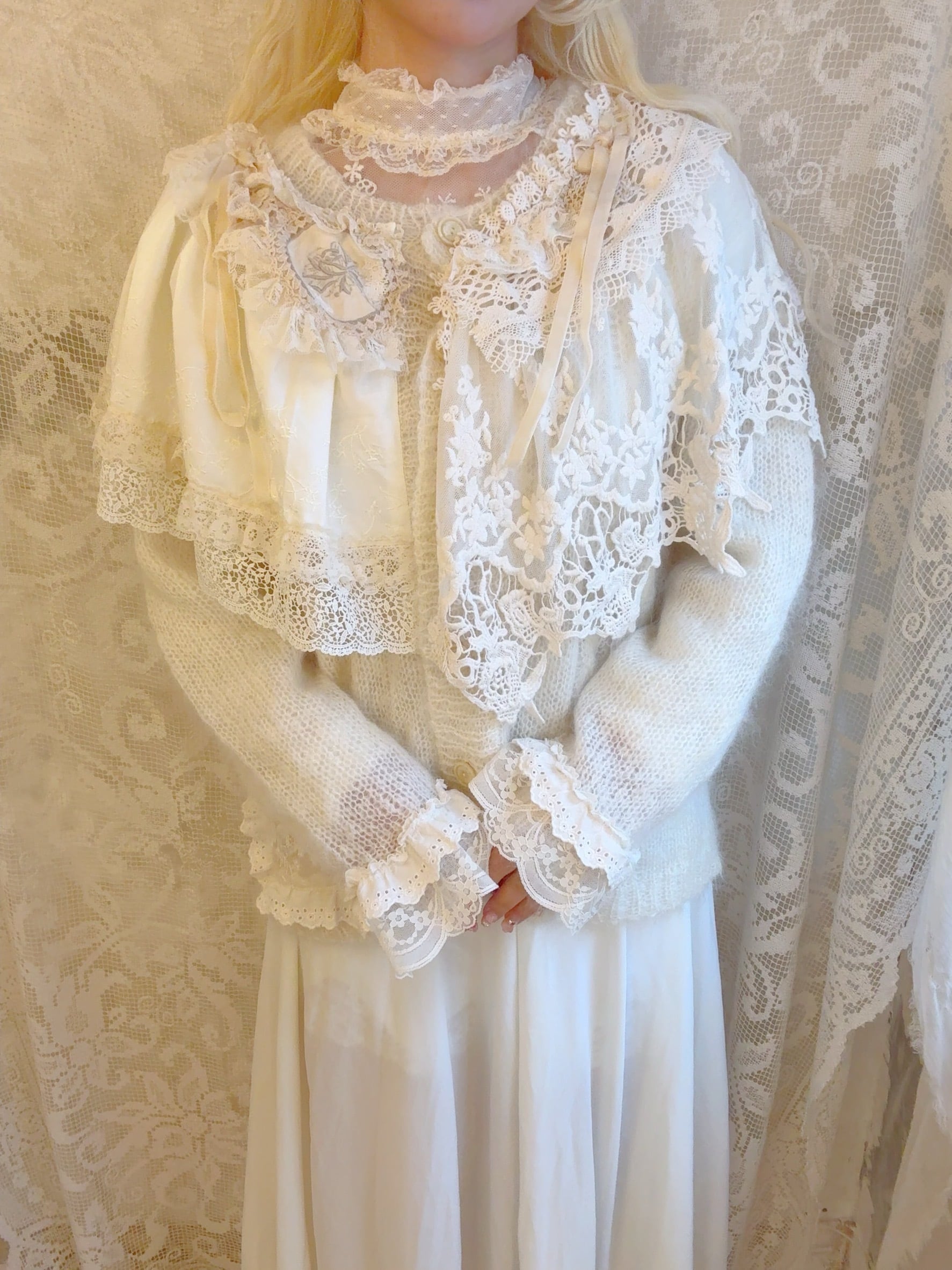 ふわふわ柔らかなvintageのウールニットカーディガンにvintageのレースや古着のかけら等をたっぷり装飾したリメイクアイテム。前を閉じてセーターのように着用しても可愛いです。