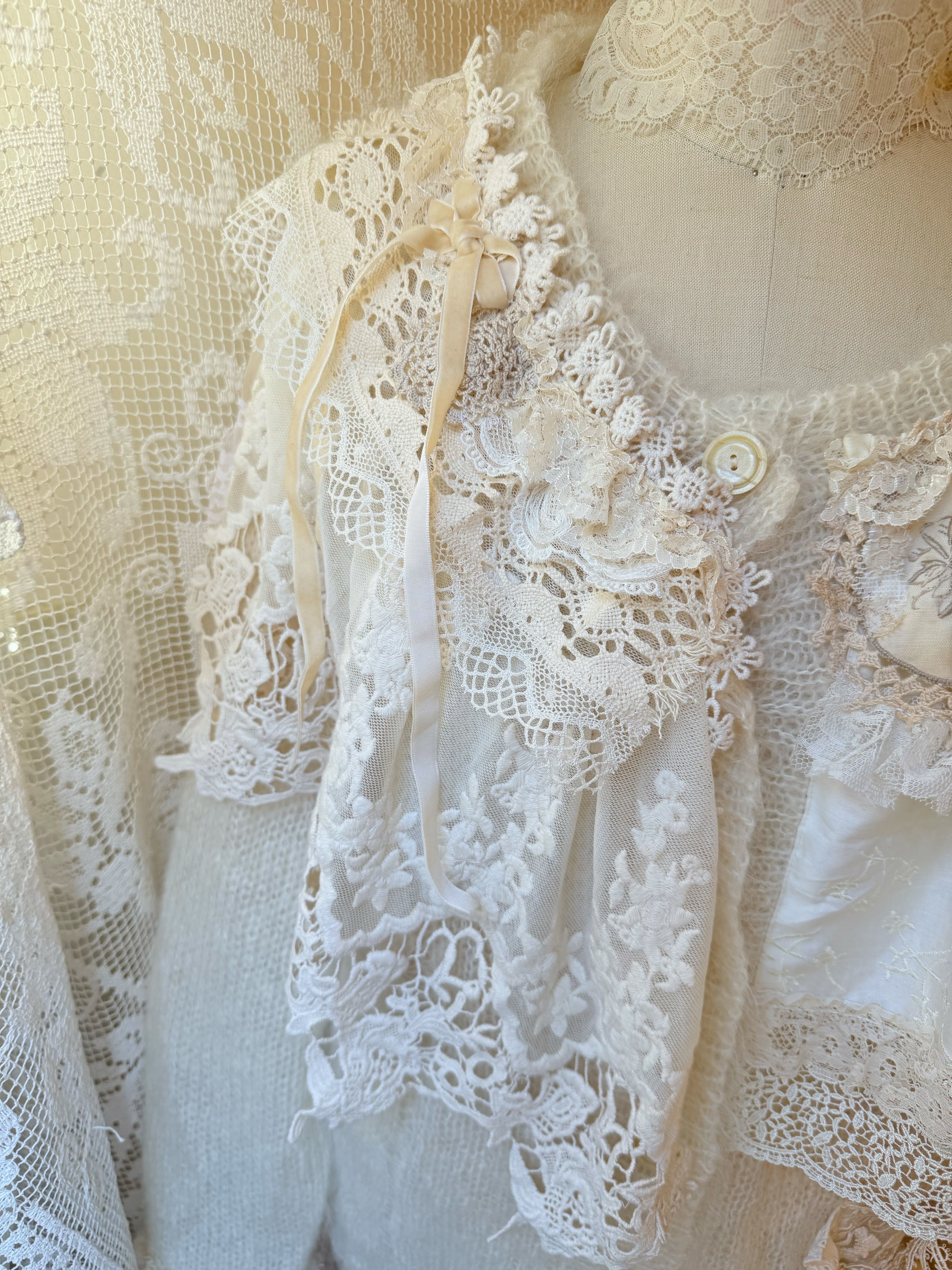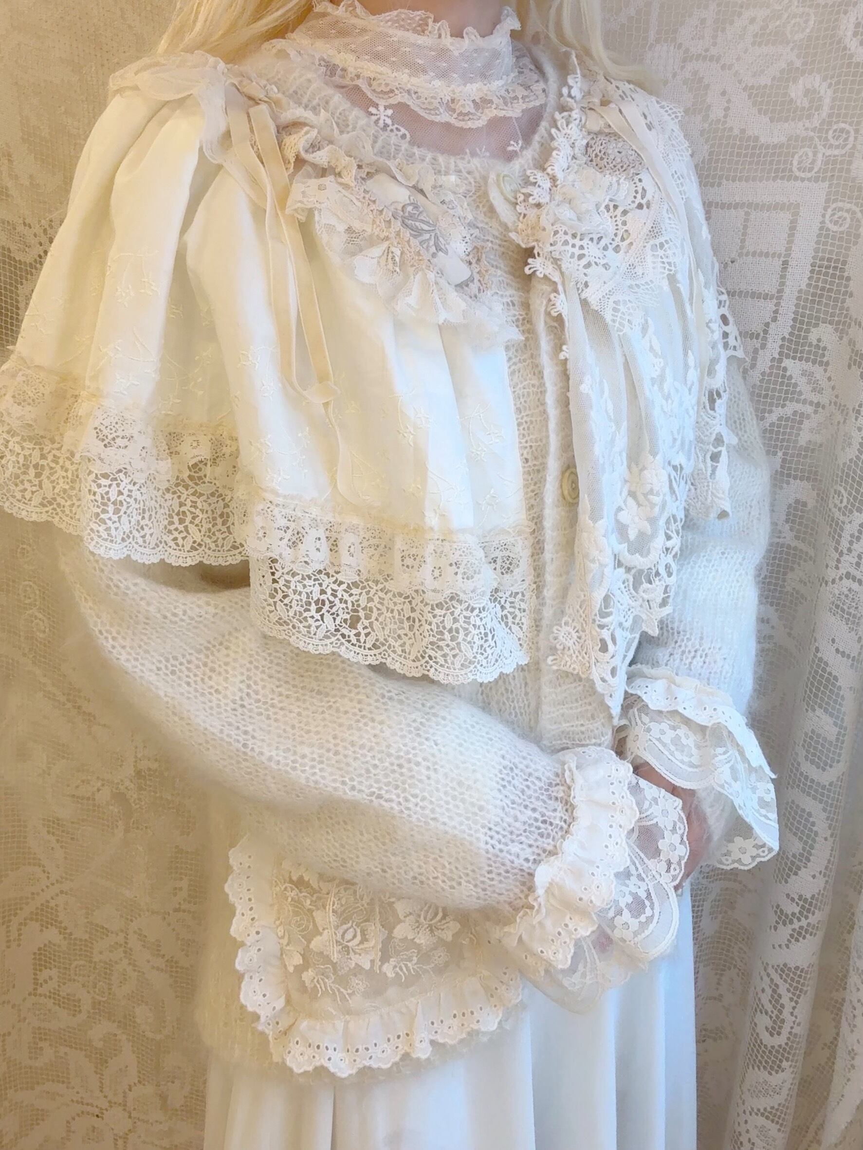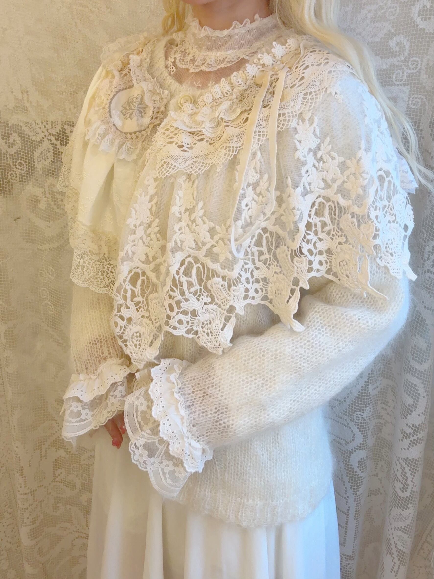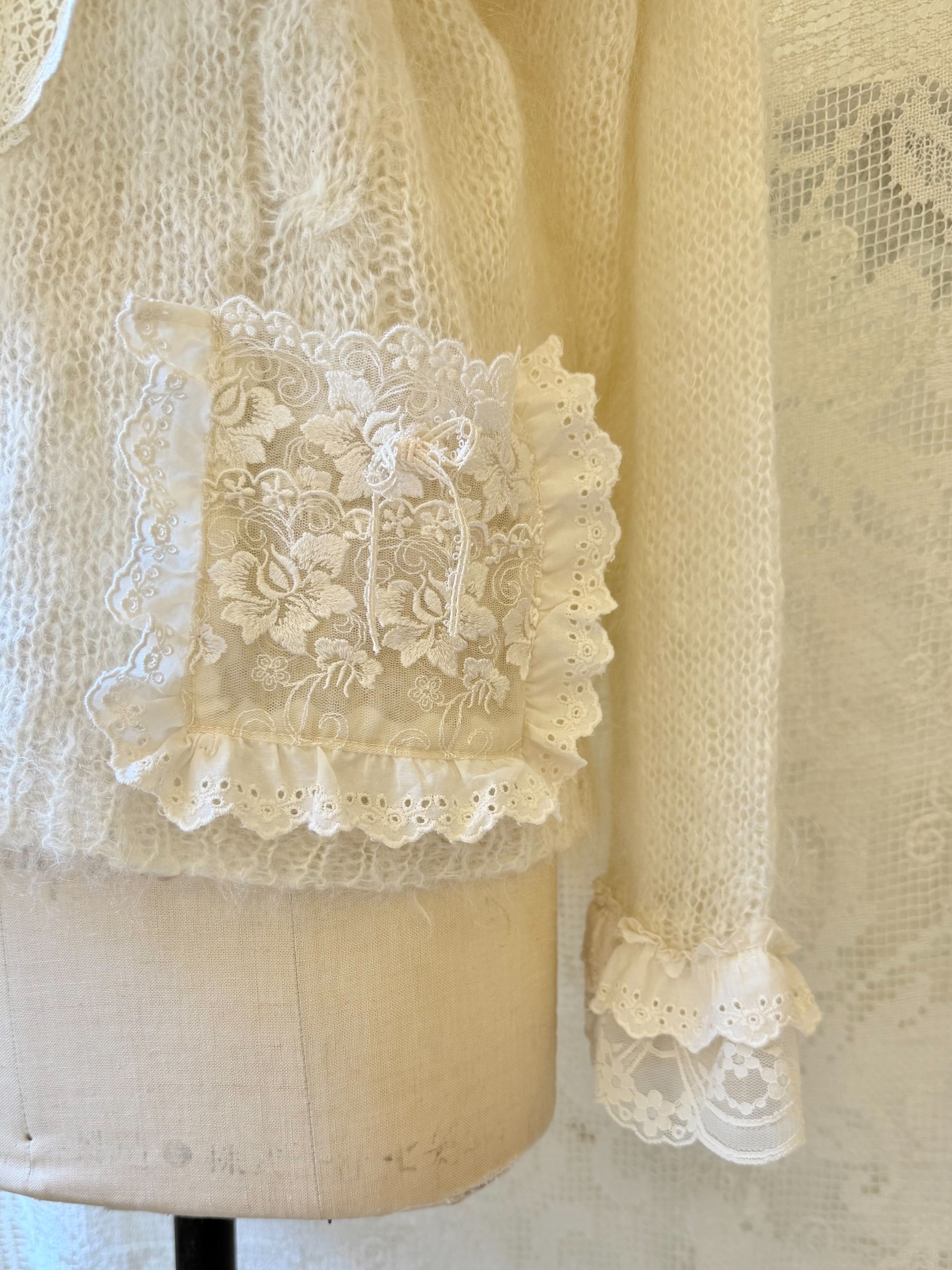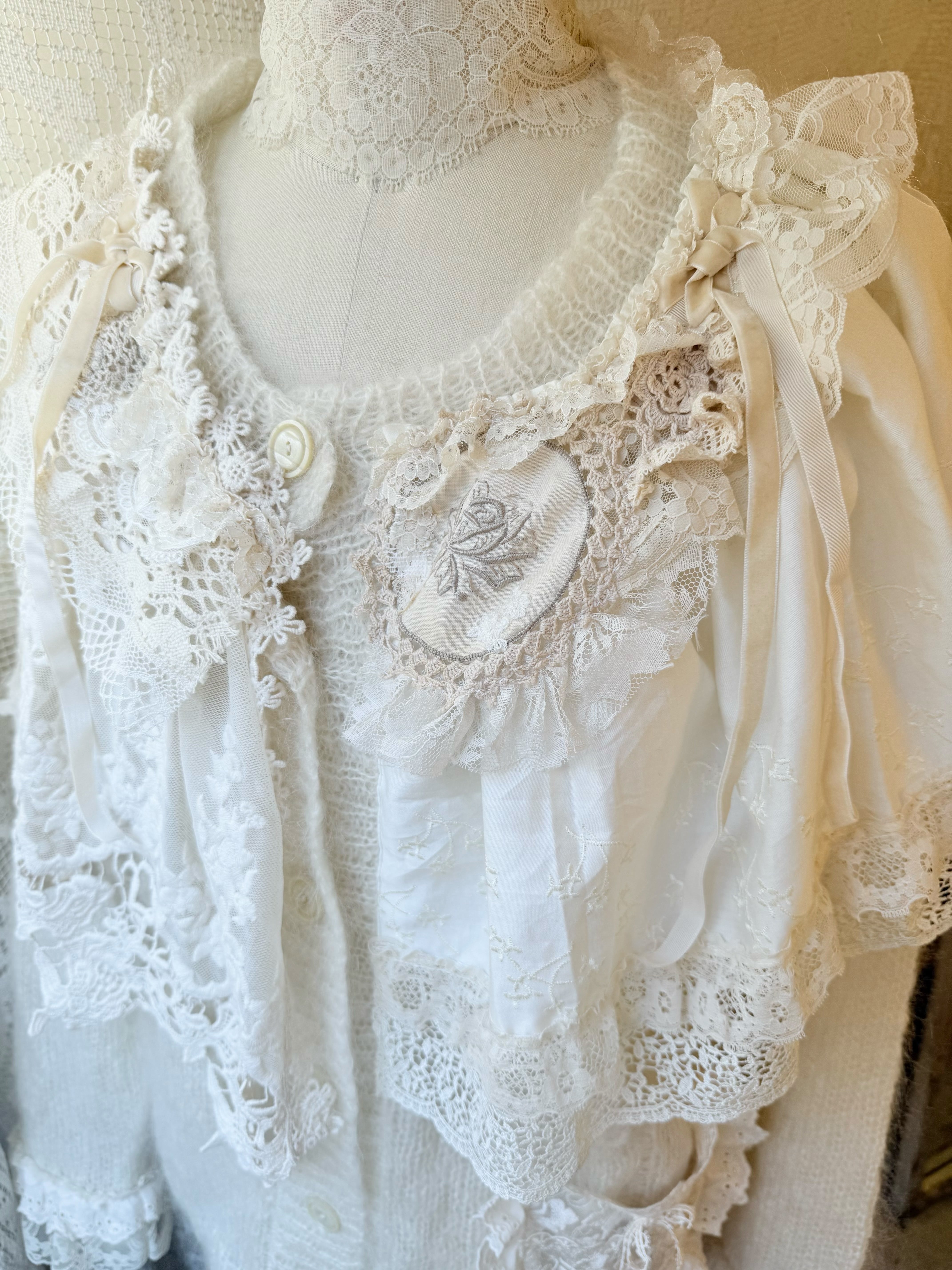 ふわふわ柔らかなvintageのウールニットカーディガンにvintageのレースや古着のかけら等をたっぷり装飾したリメイクアイテム。前を閉じてセーターのように着用しても可愛いです。
