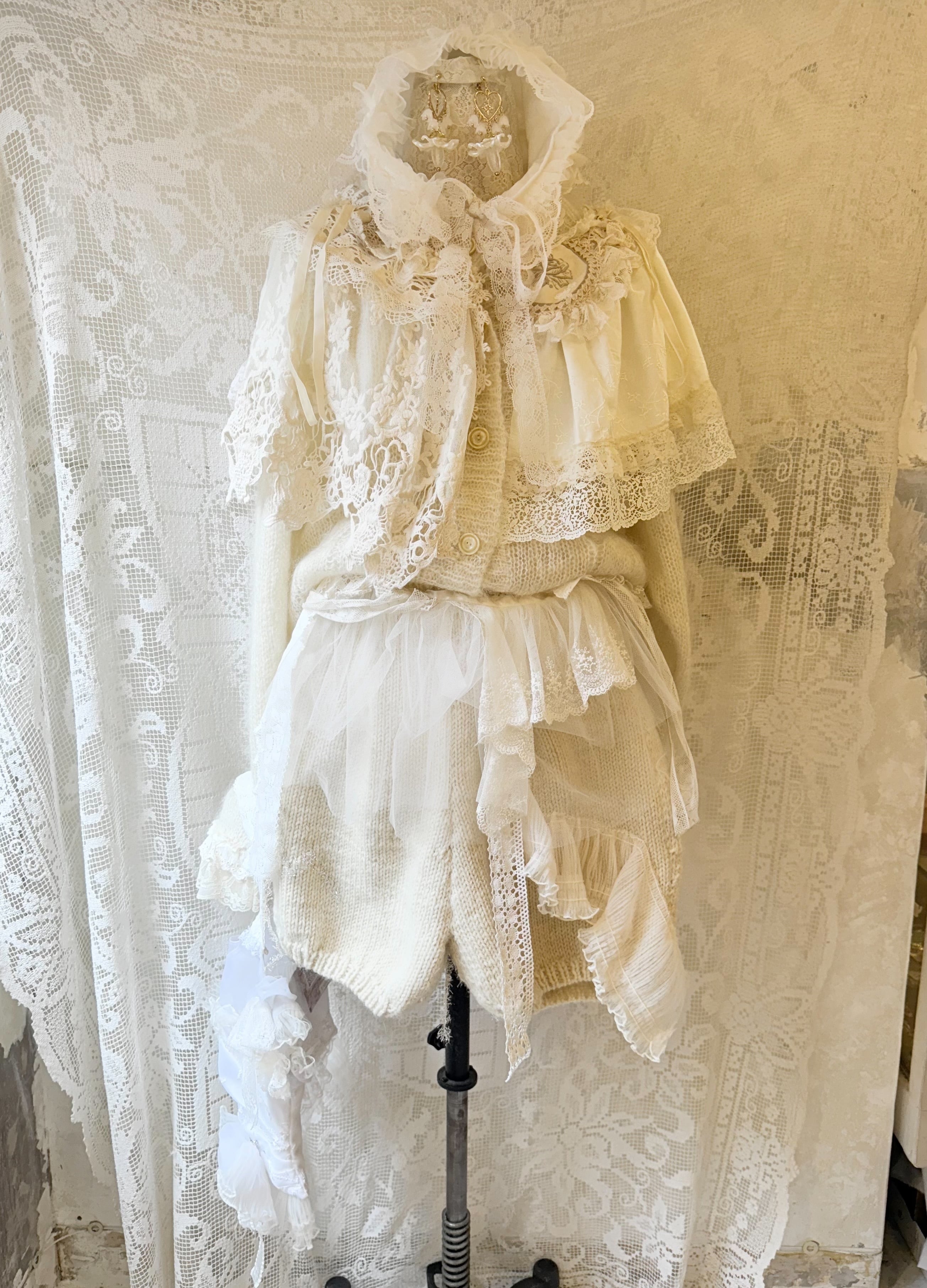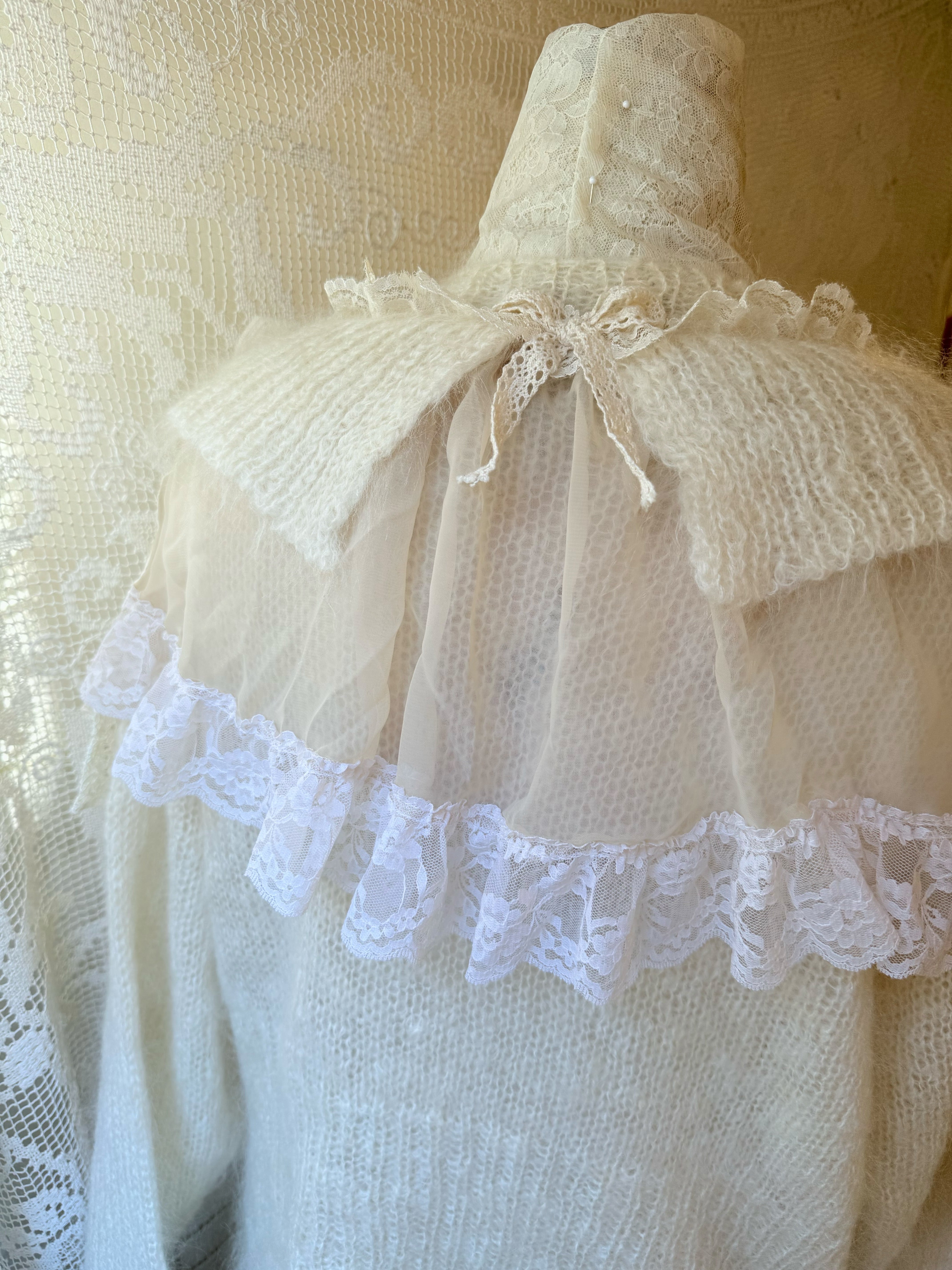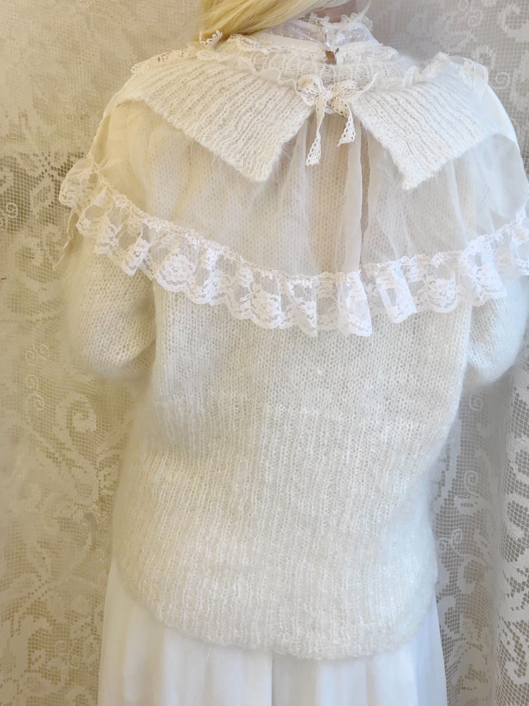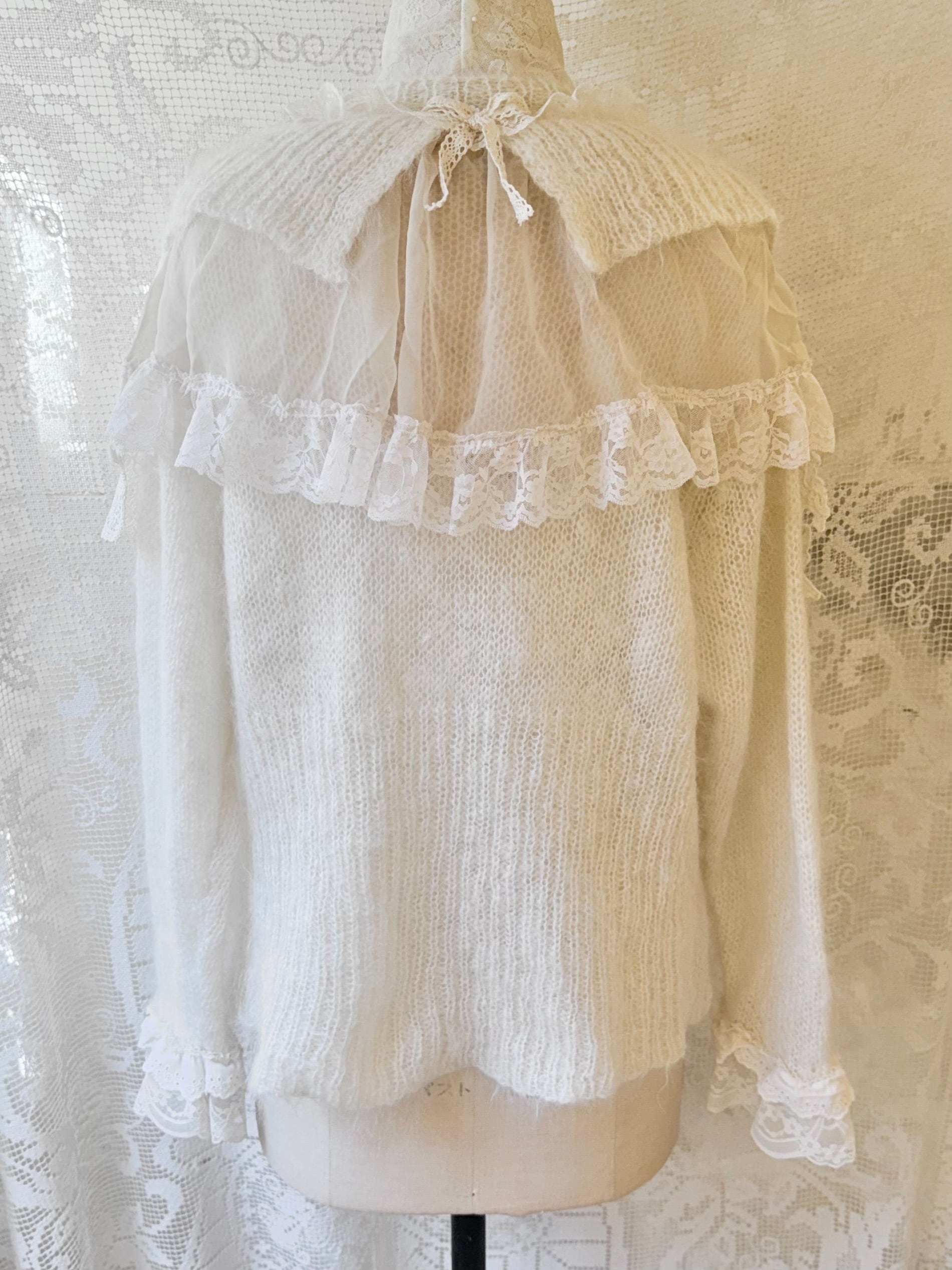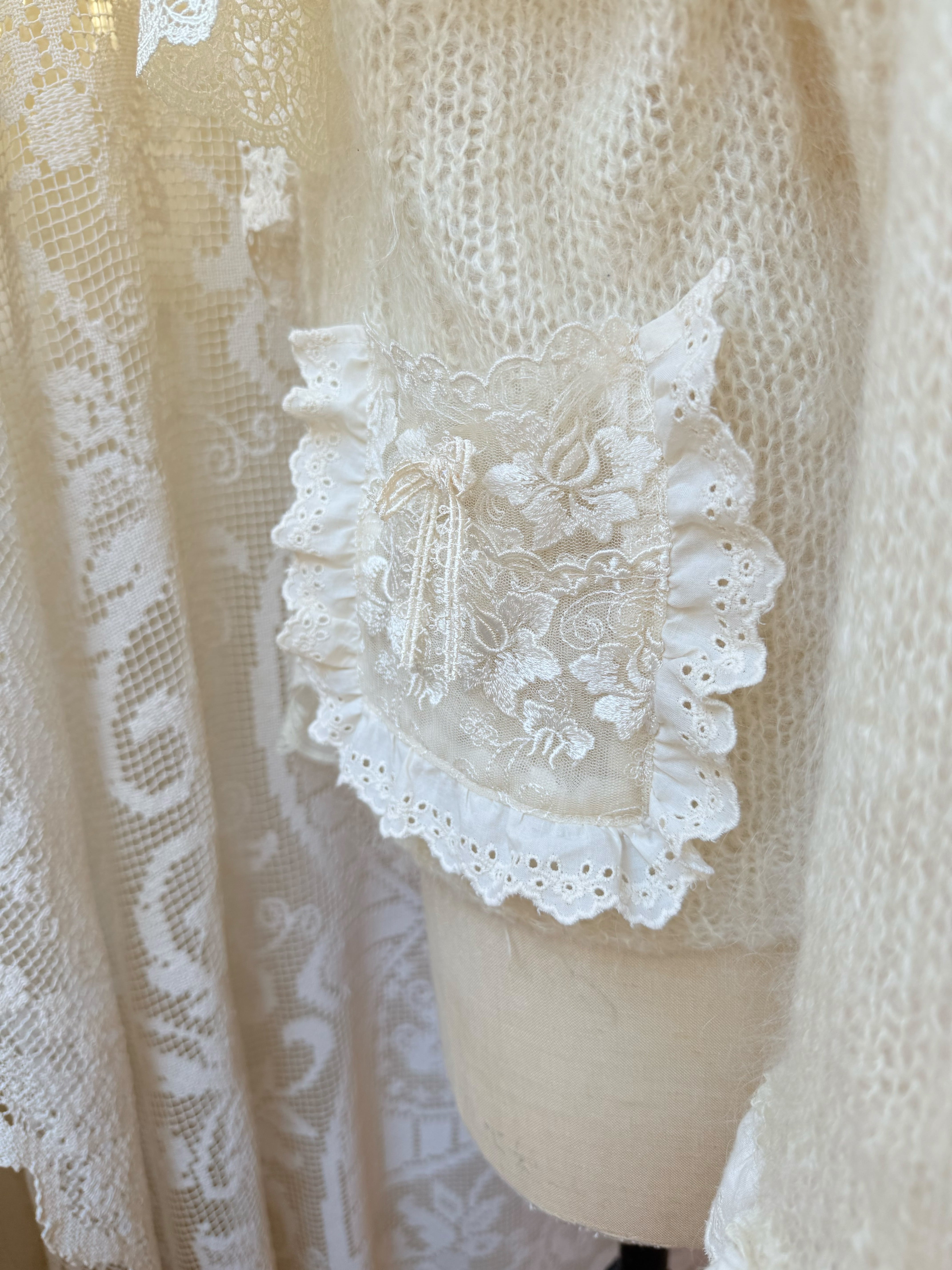 ふわふわ柔らかなvintageのウールニットカーディガンにvintageのレースや古着のかけら等をたっぷり装飾したリメイクアイテム。前を閉じてセーターのように着用しても可愛いです。