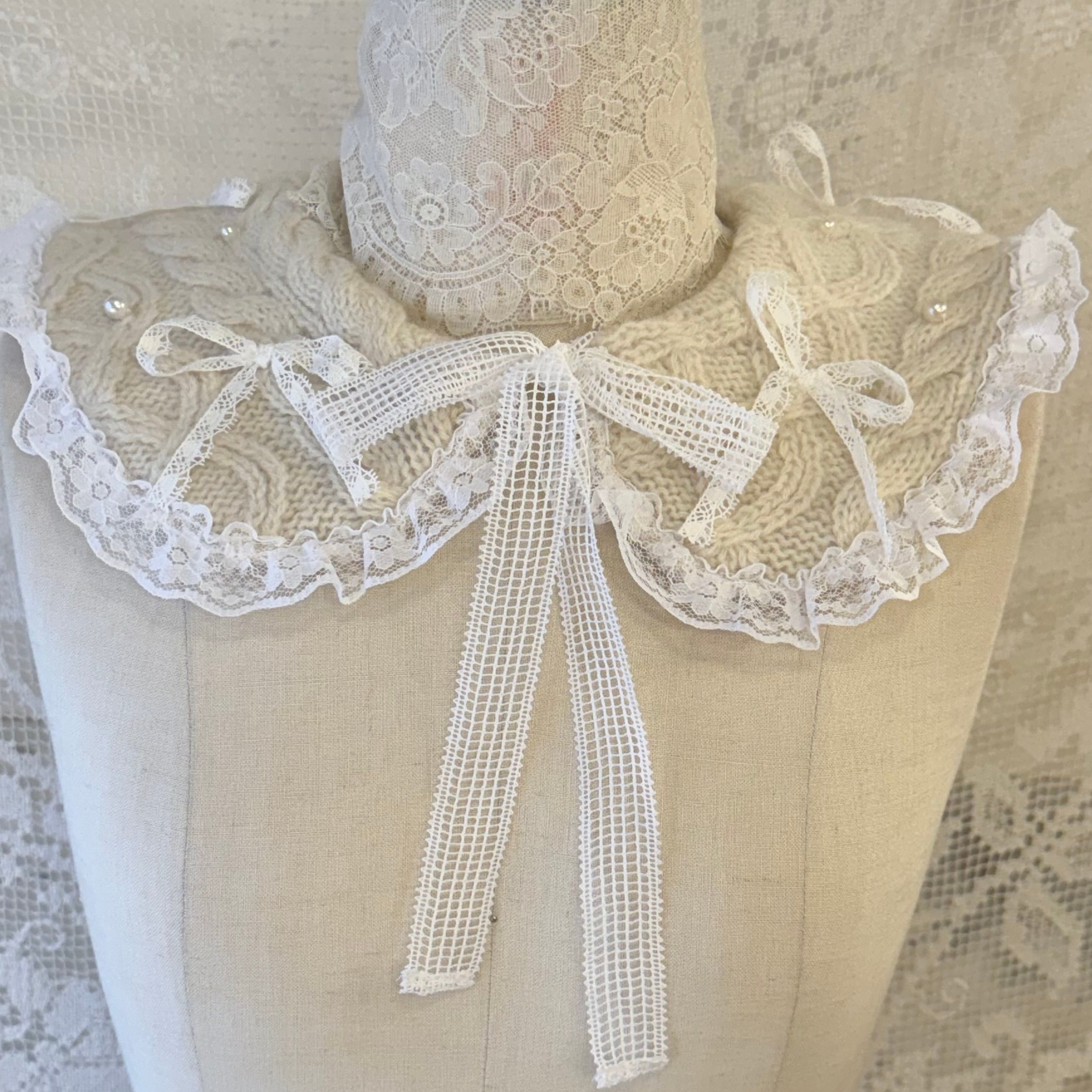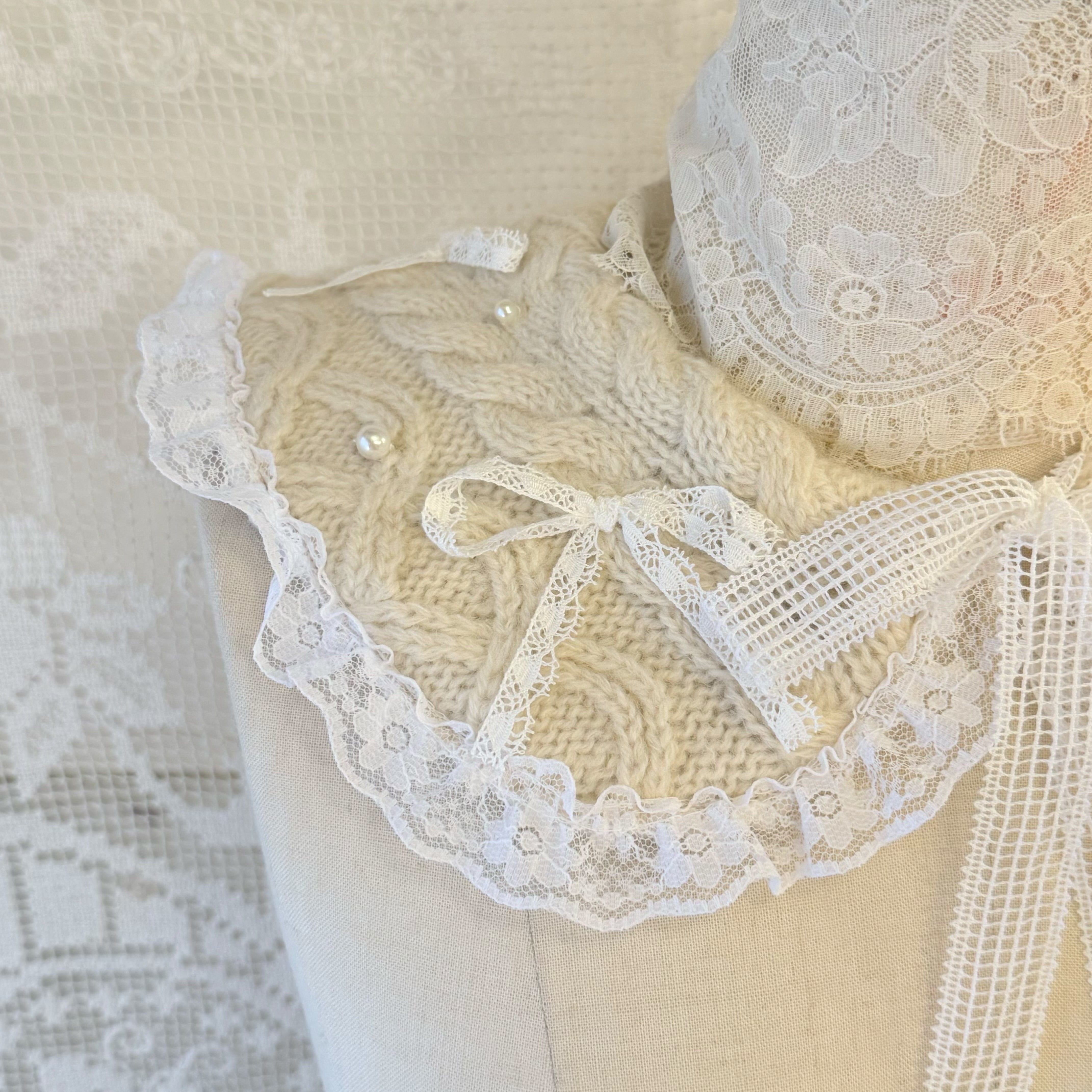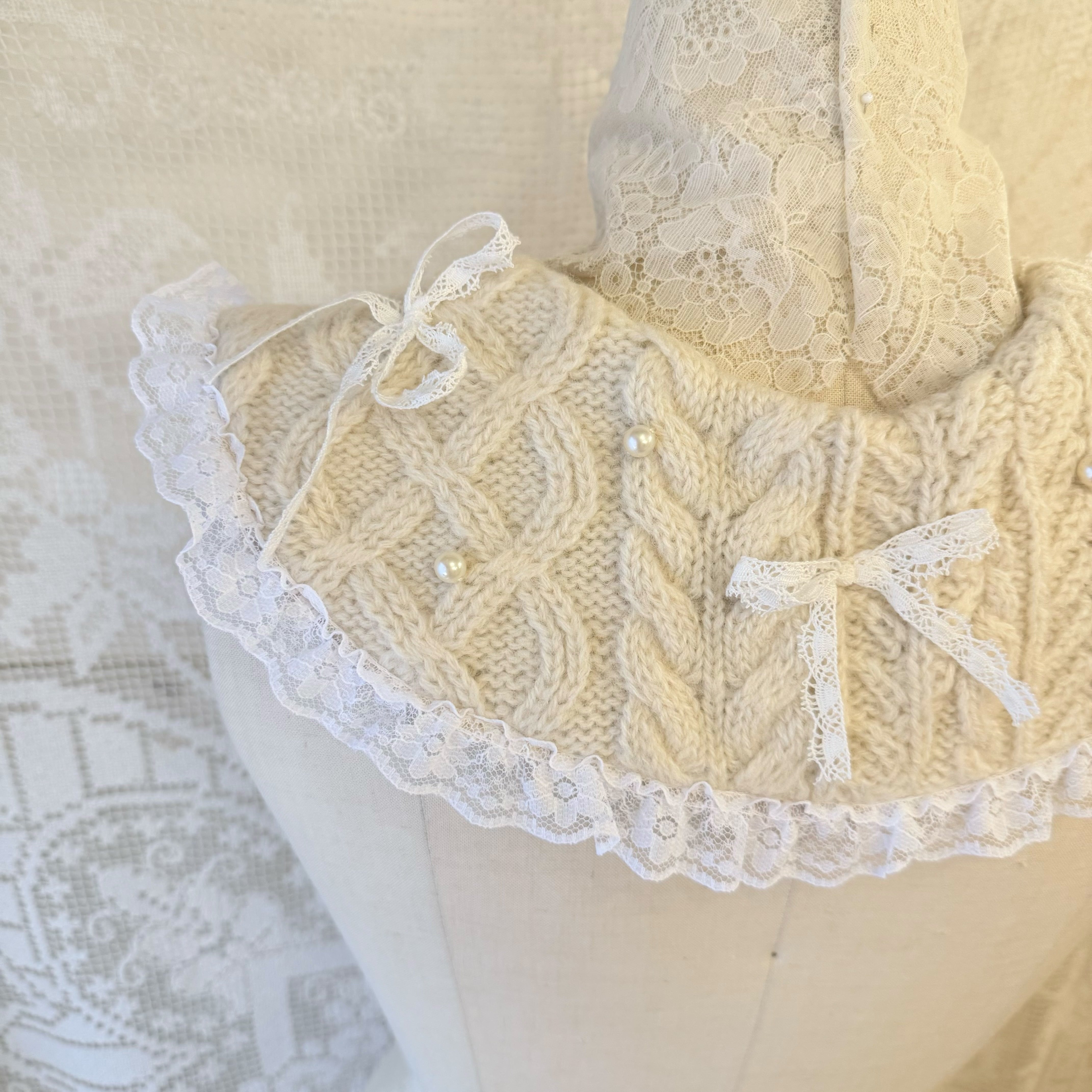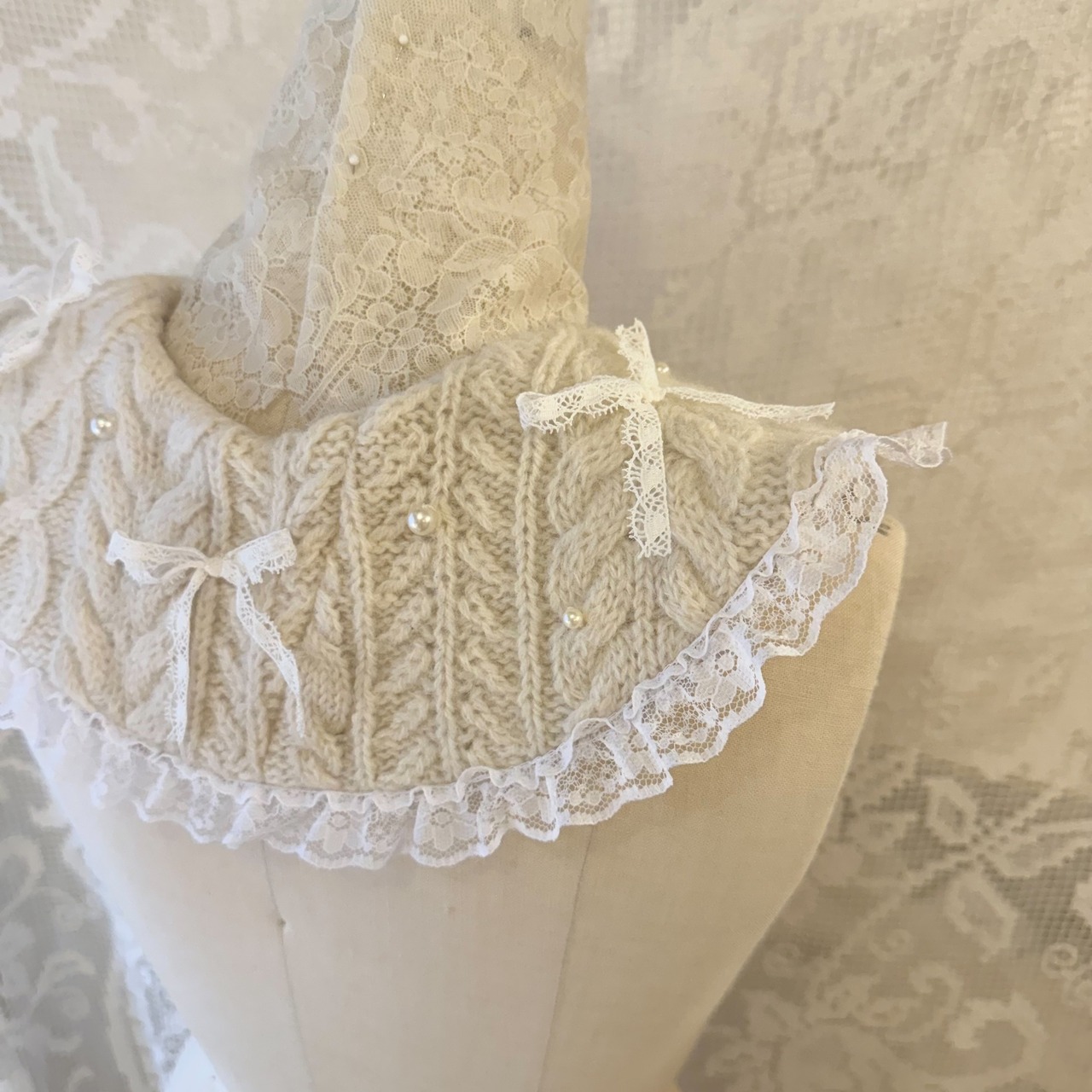 アランニットを解体して制作したつけ襟にレースのリボンやパールを散らしたキュートなデザインです♡