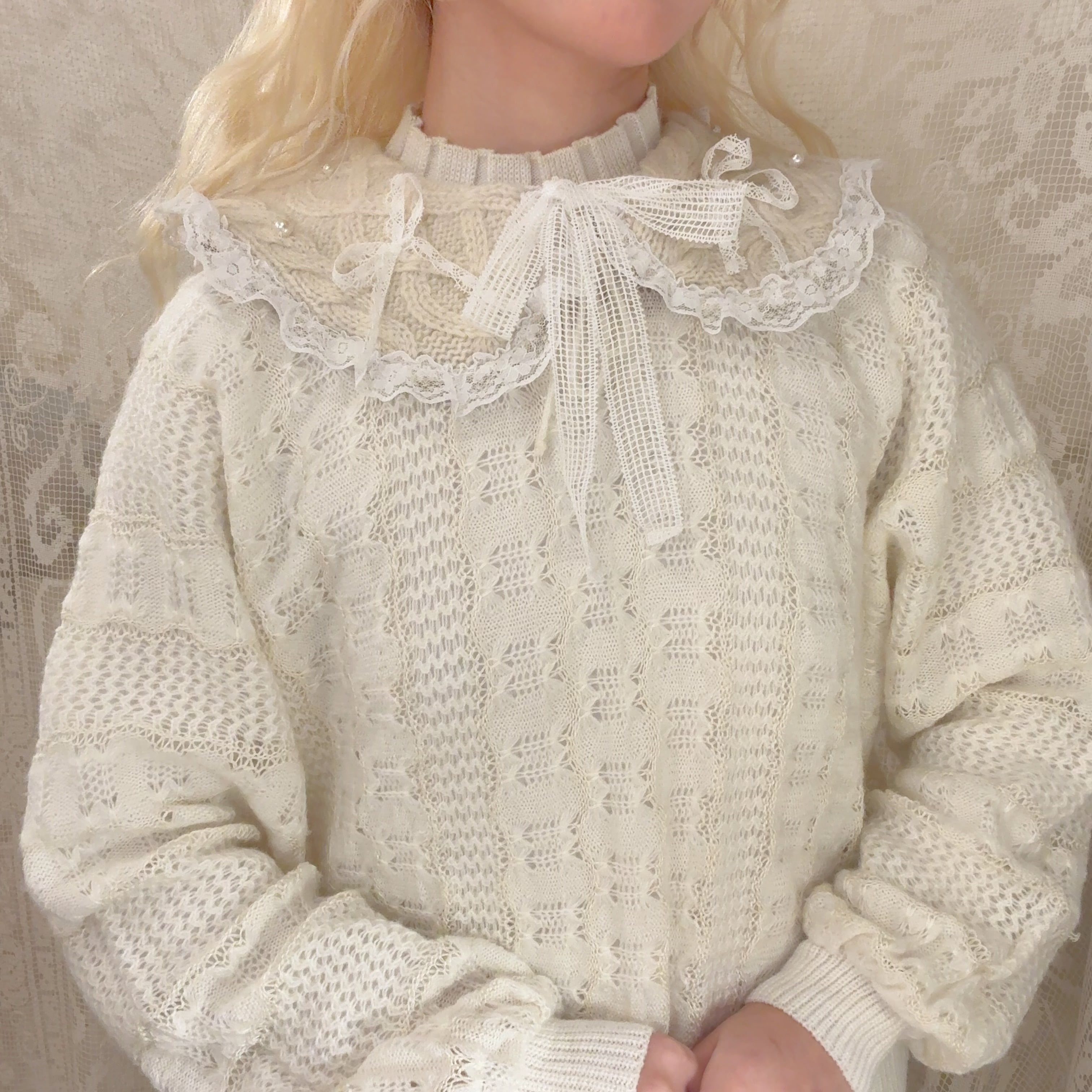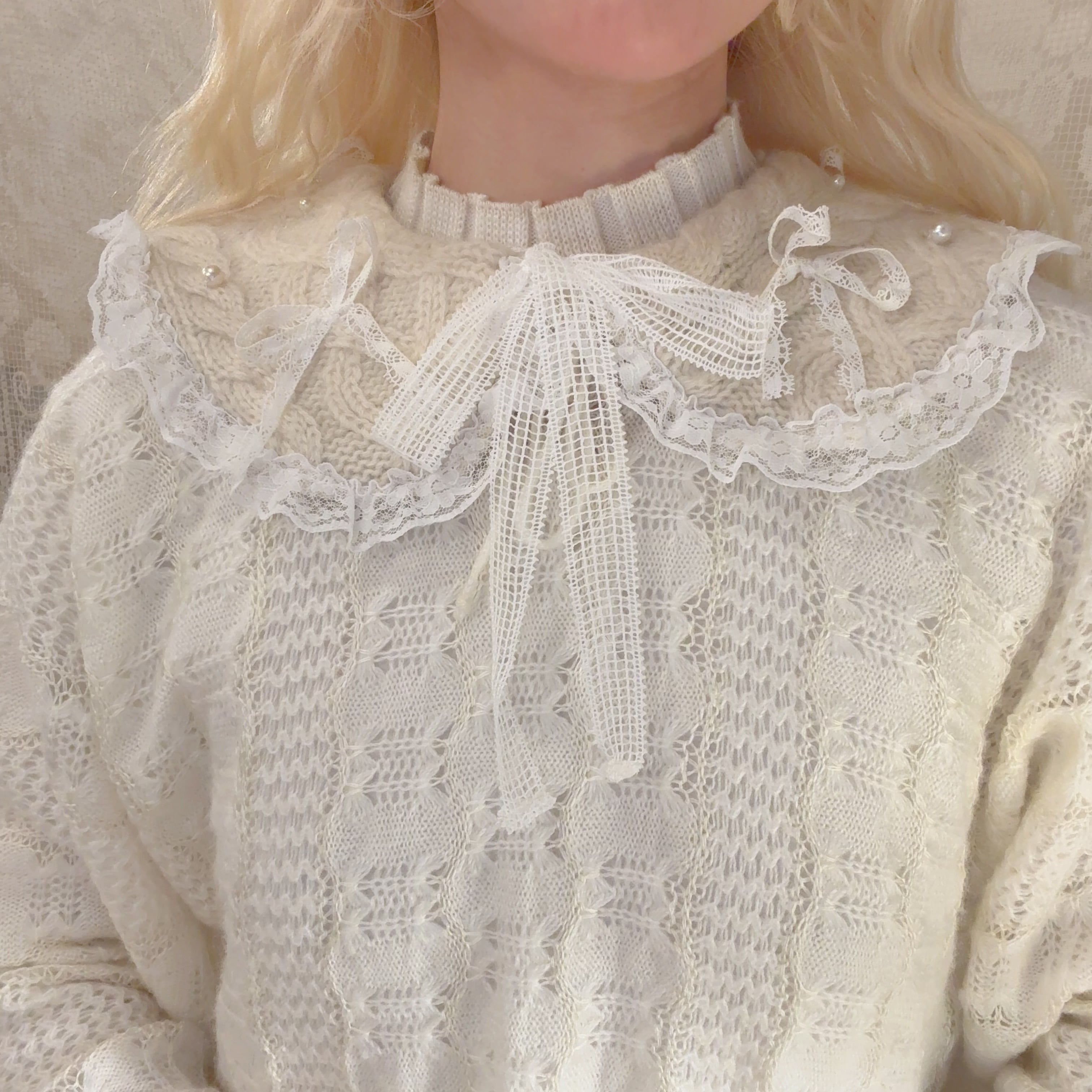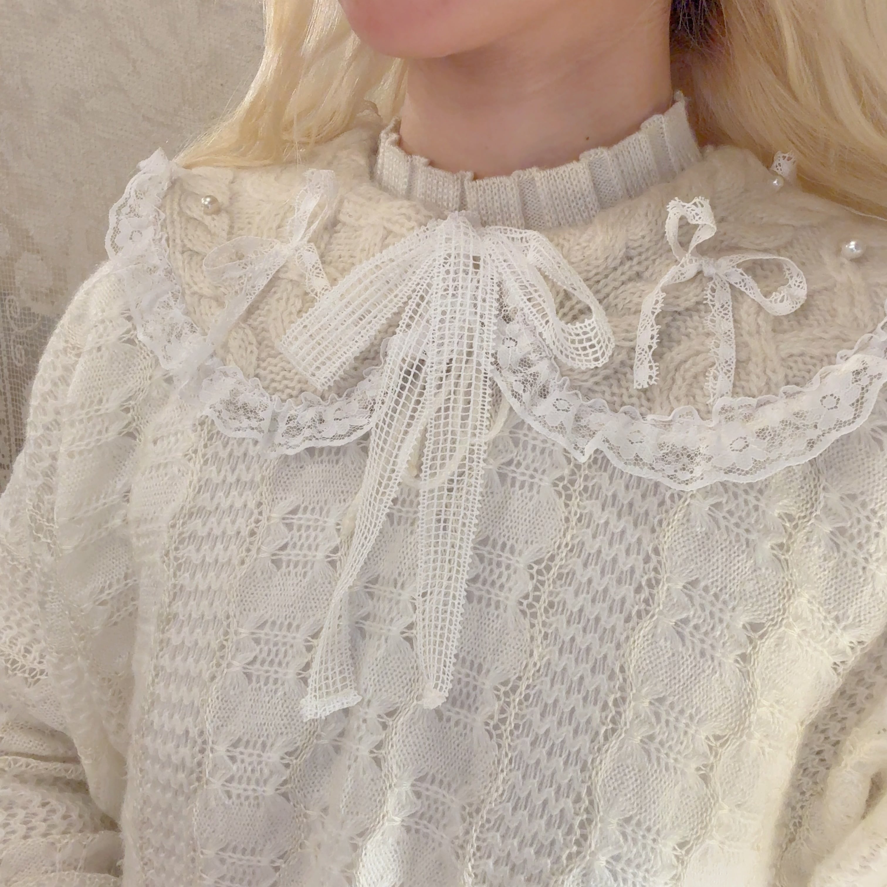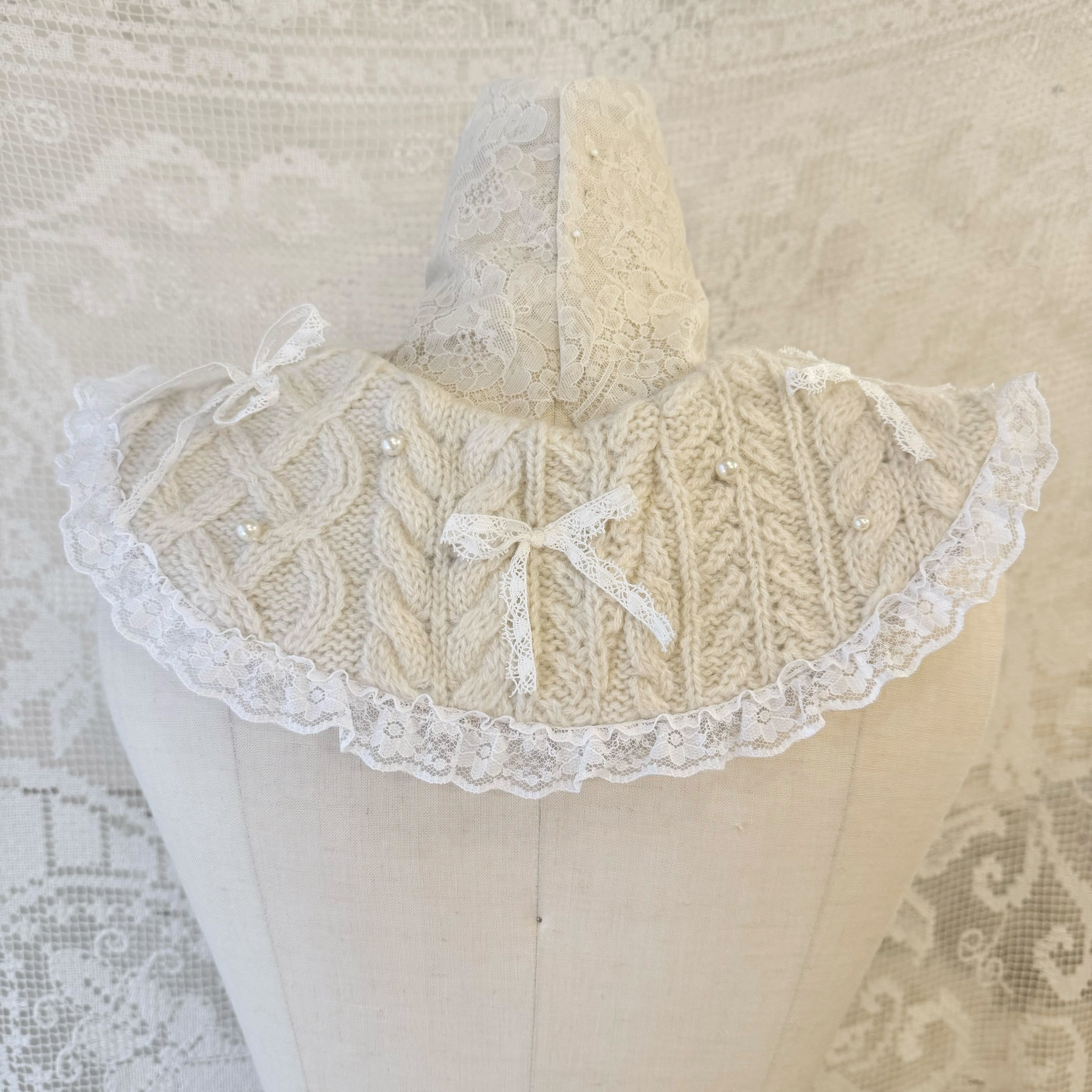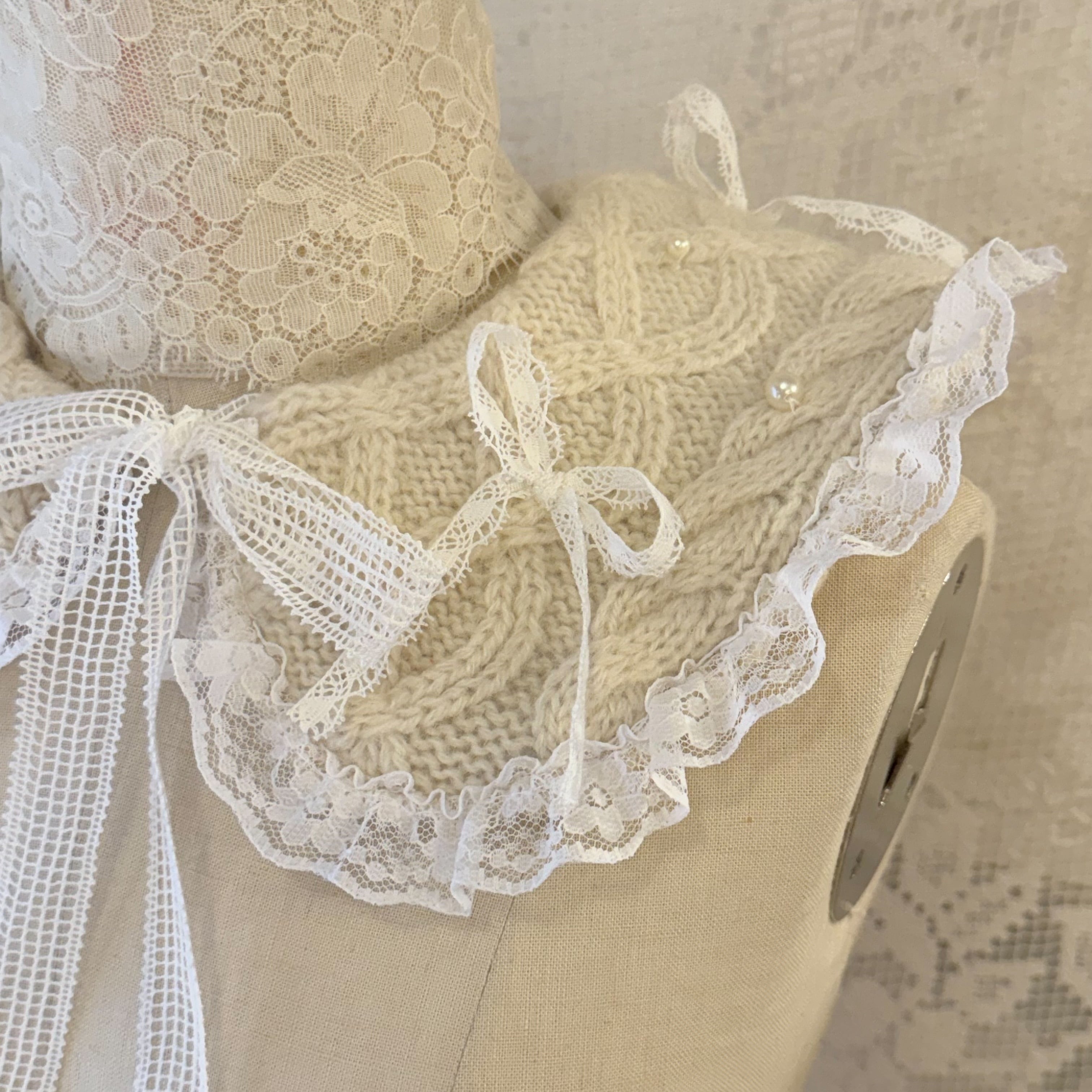アランニットを解体して制作したつけ襟にレースのリボンやパールを散らしたキュートなデザインです♡