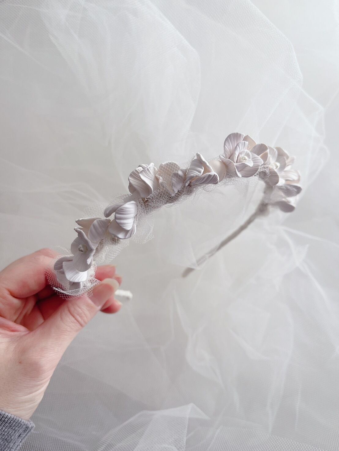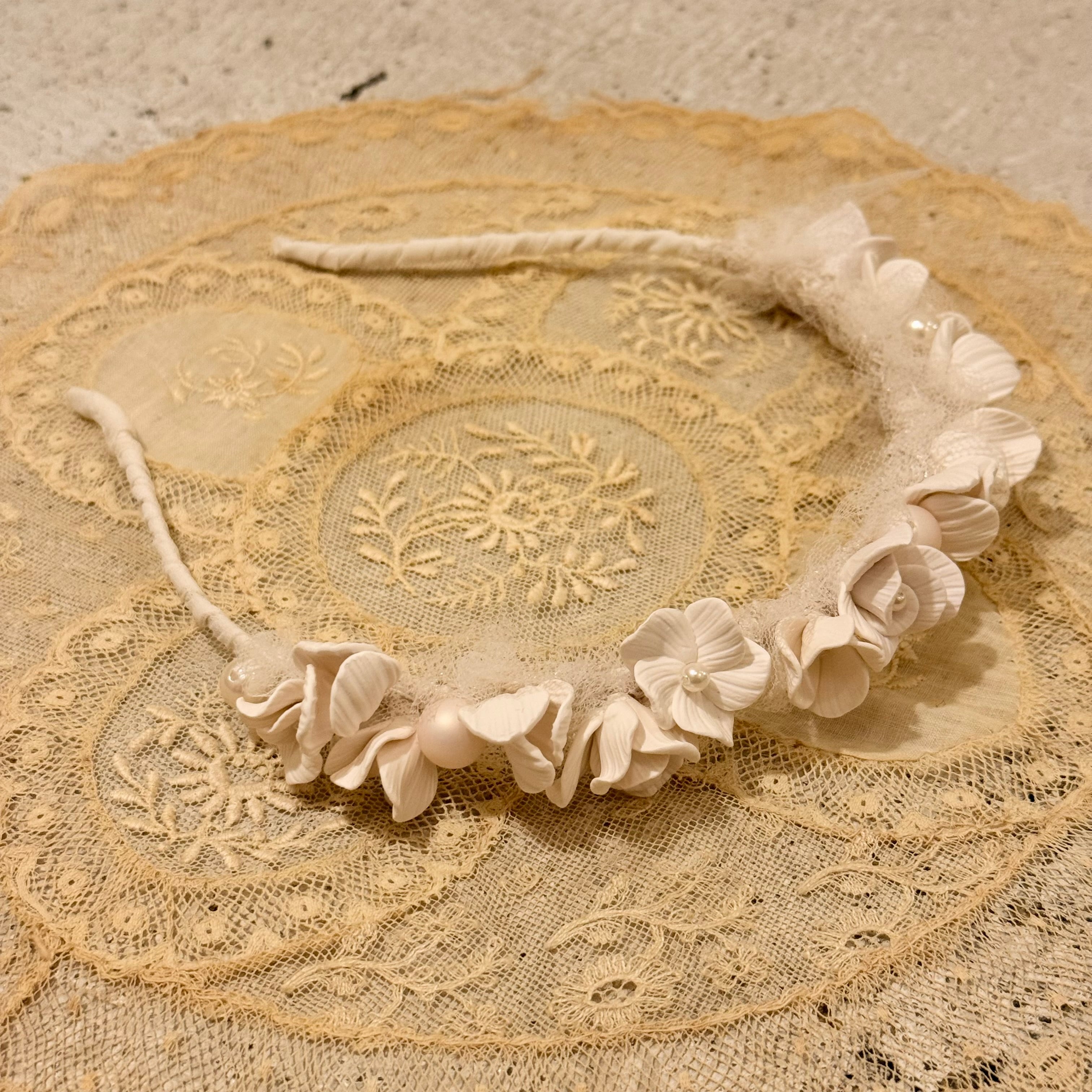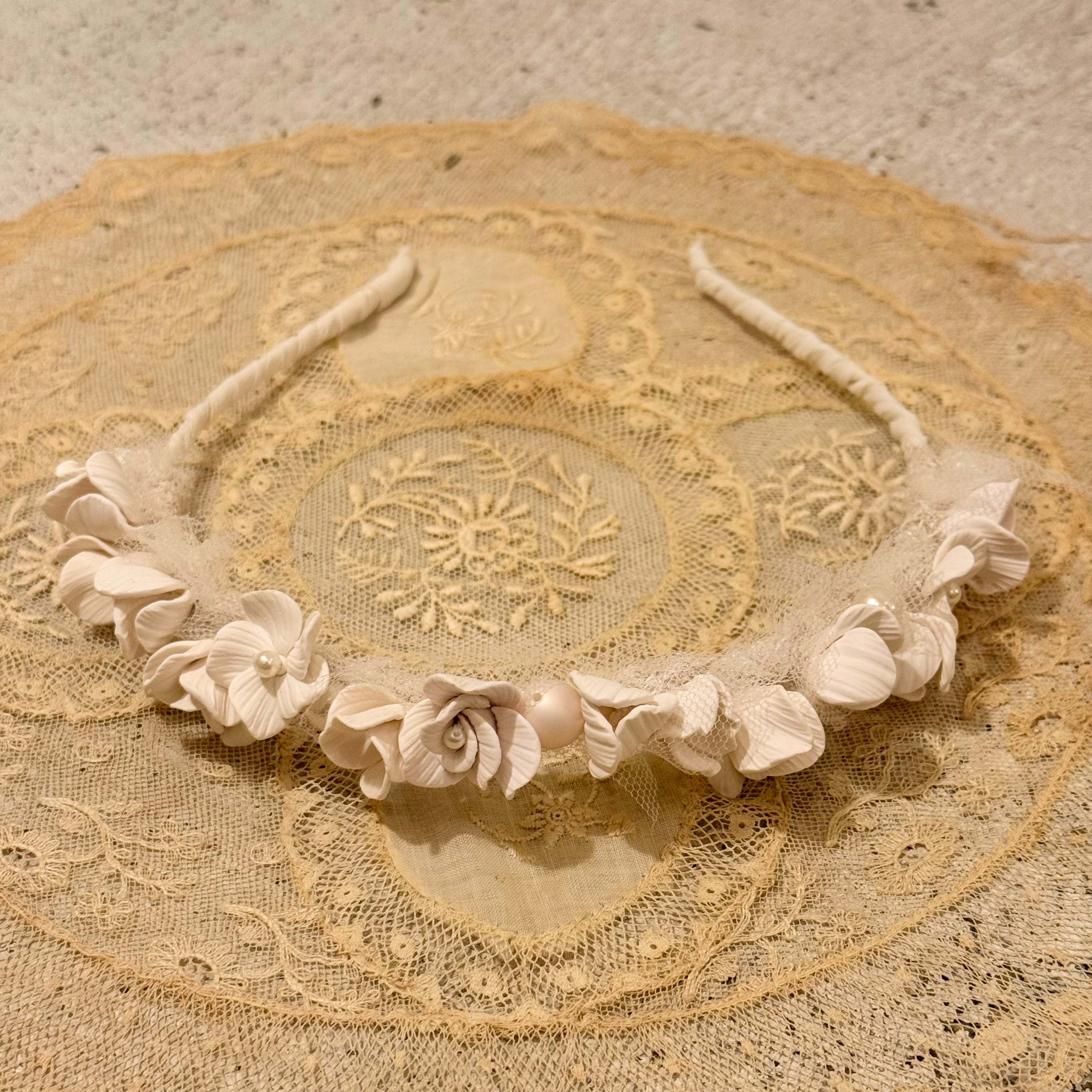 花びら一枚一枚のパーツからハンドメイドで制作した繊細なデザインのカチューシャ。