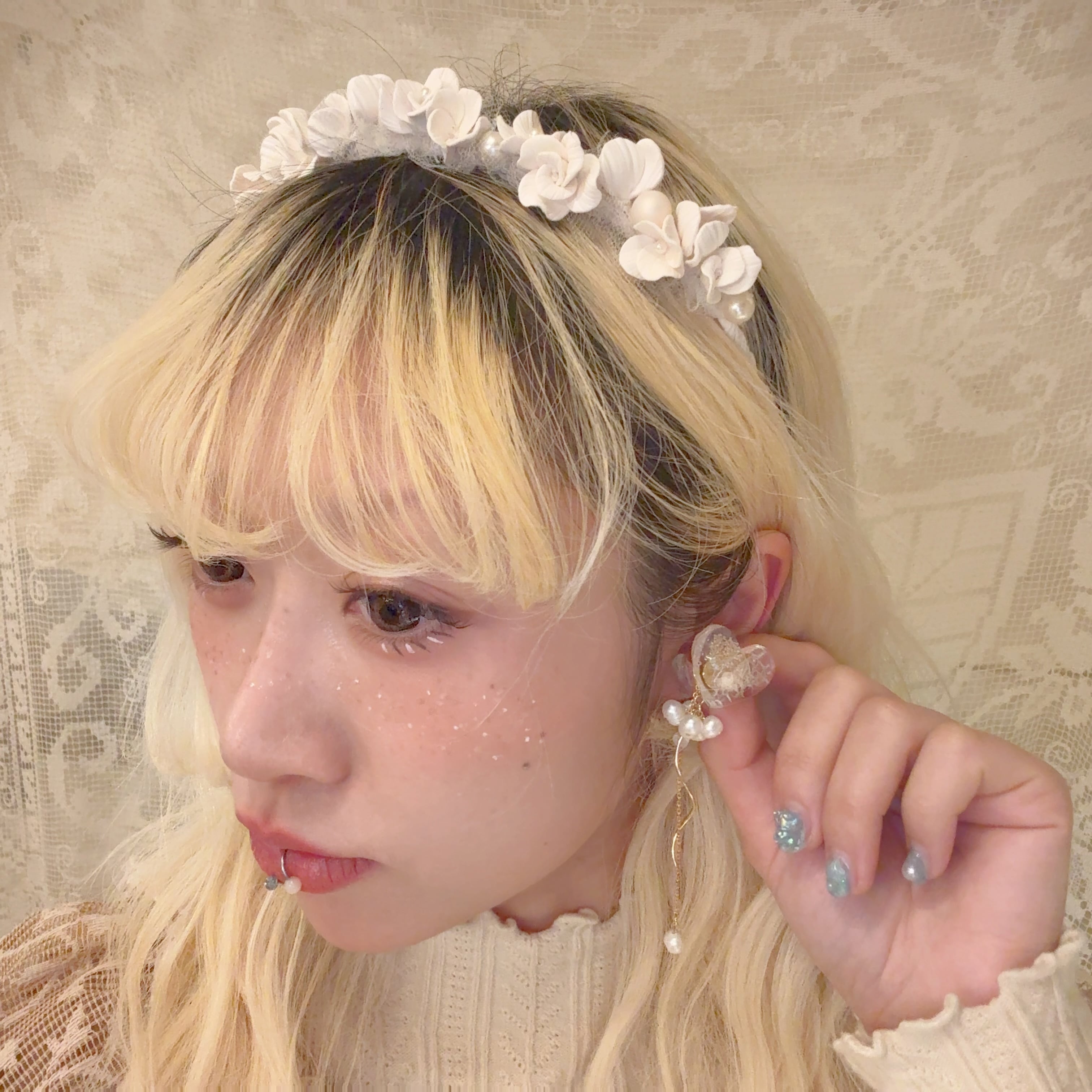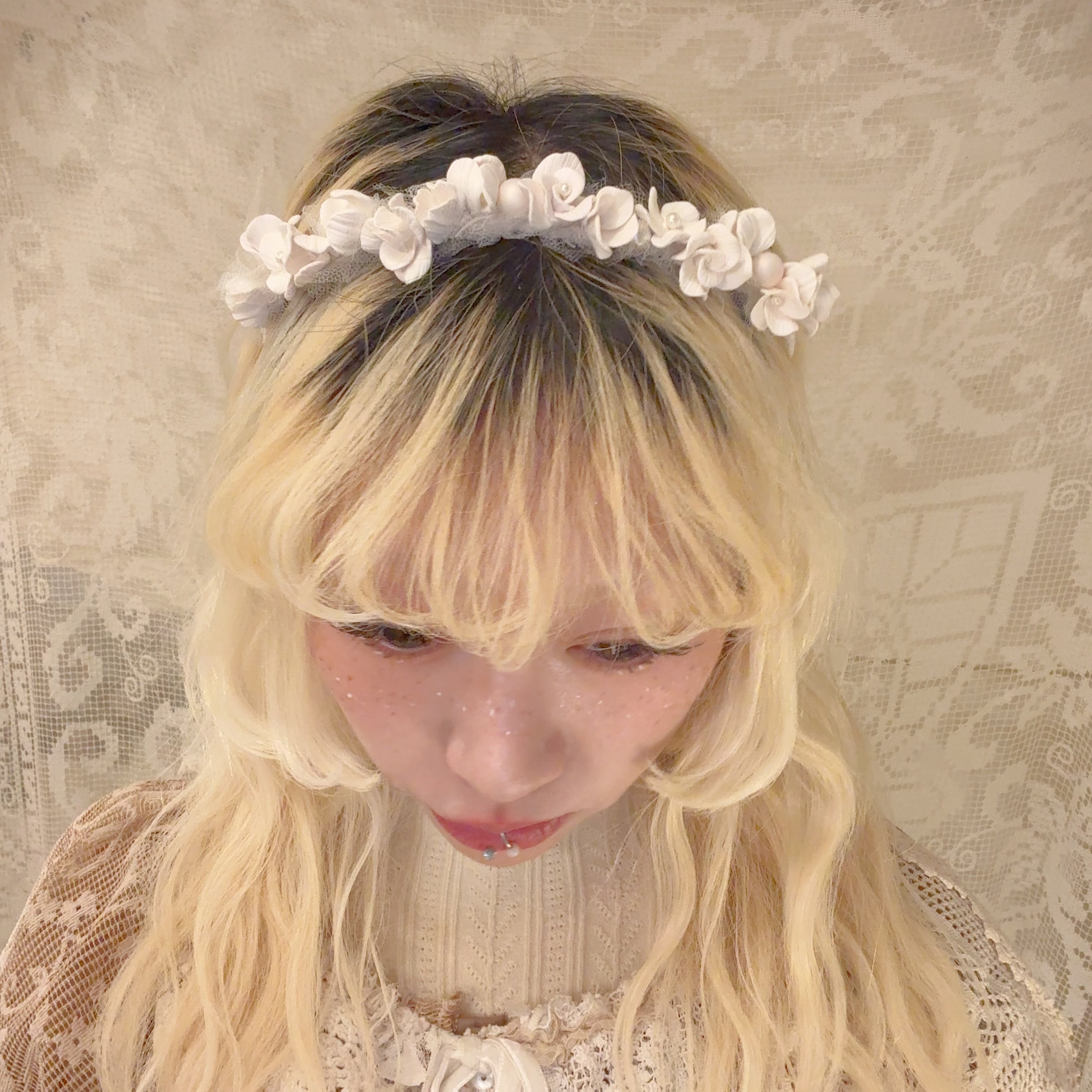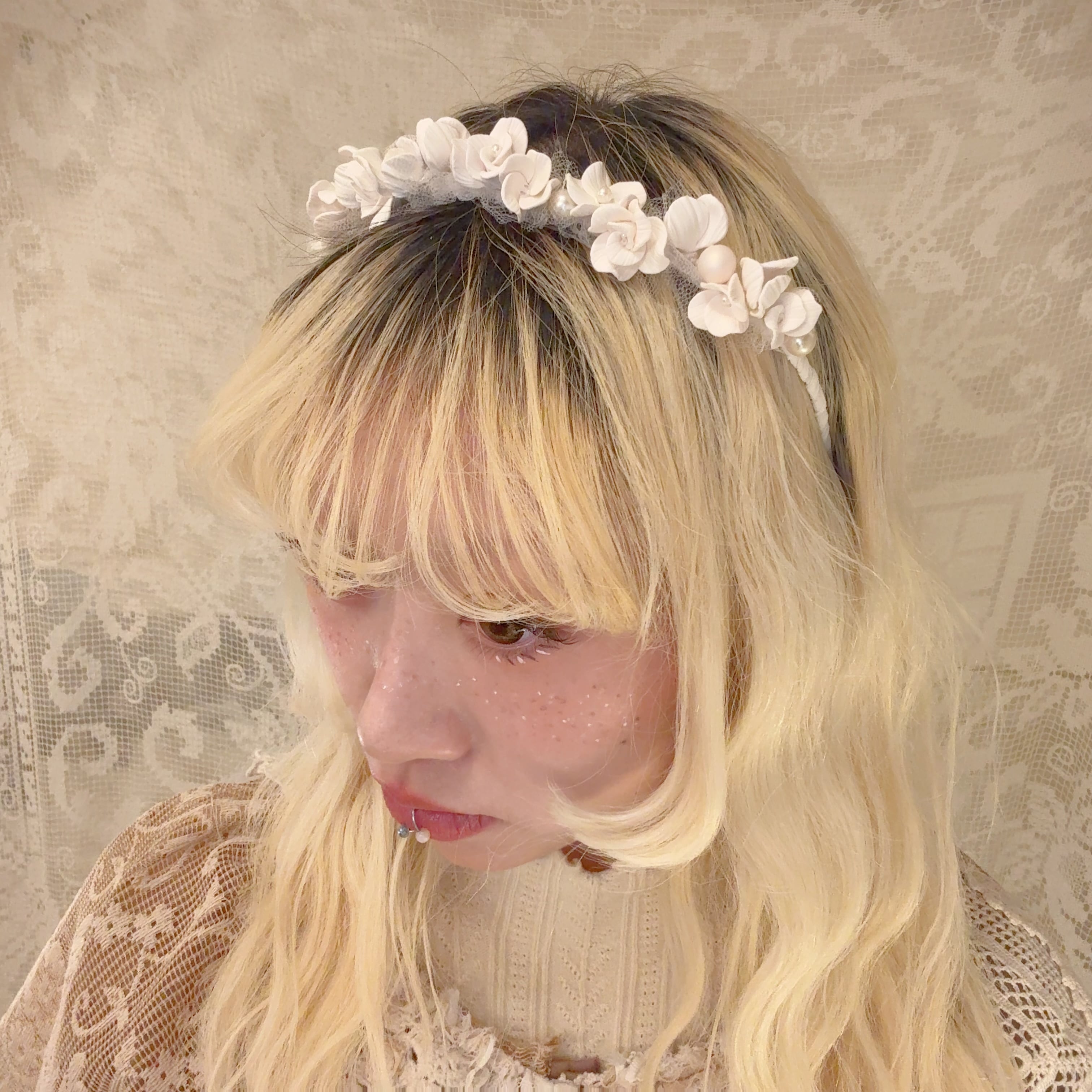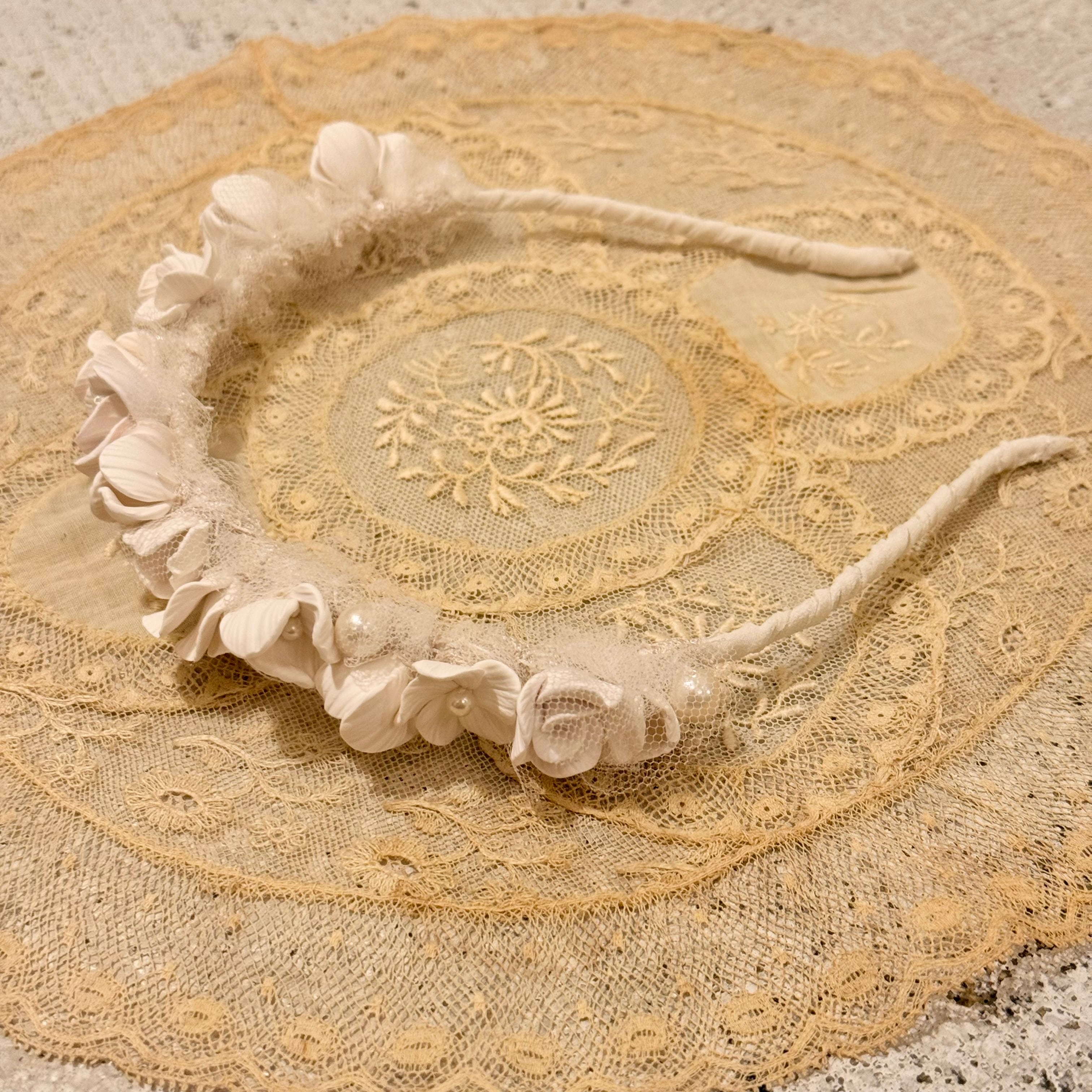 花びら一枚一枚のパーツからハンドメイドで制作した繊細なデザインのカチューシャ。