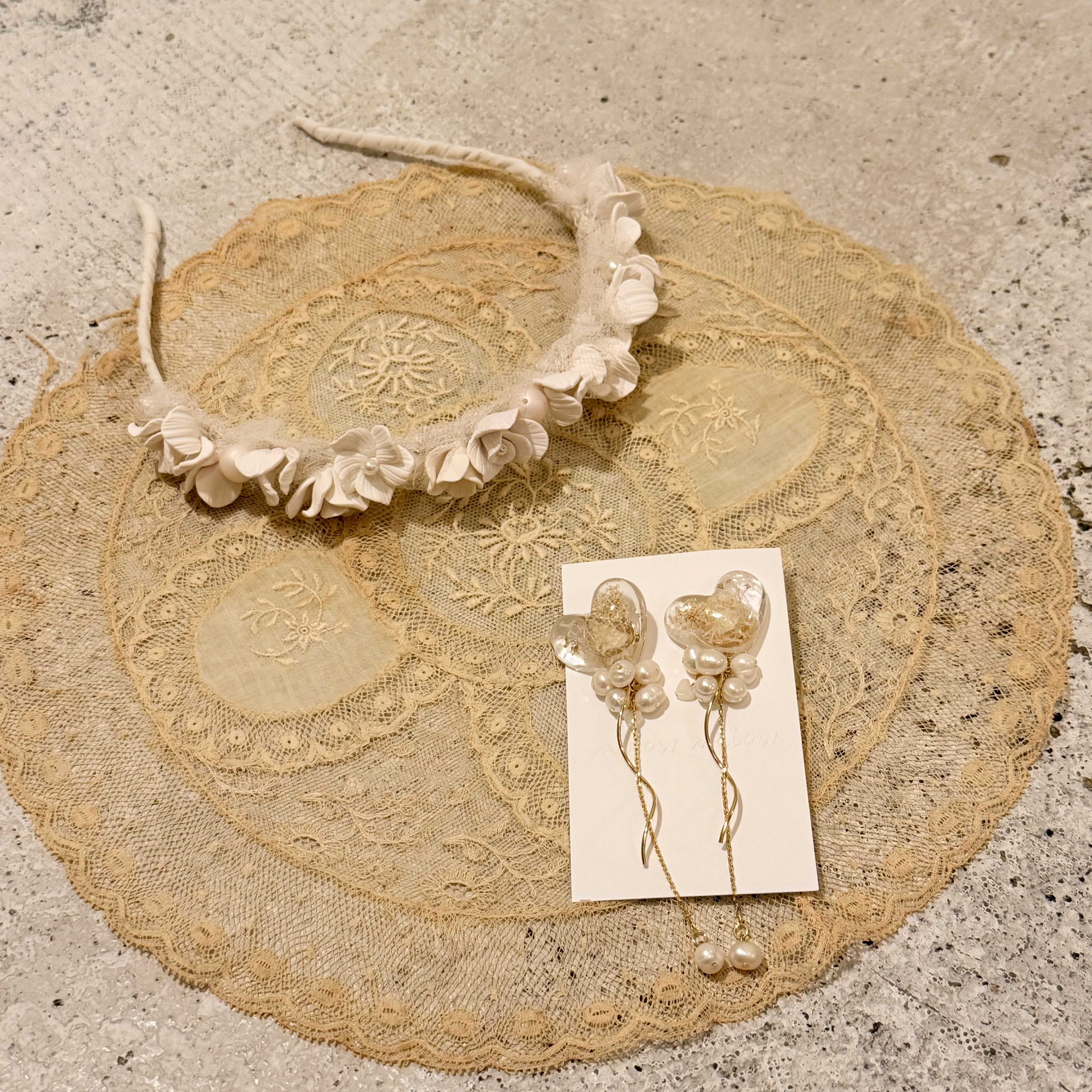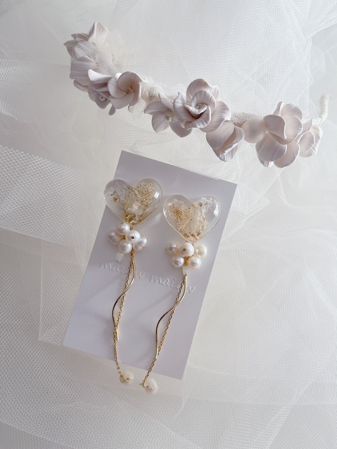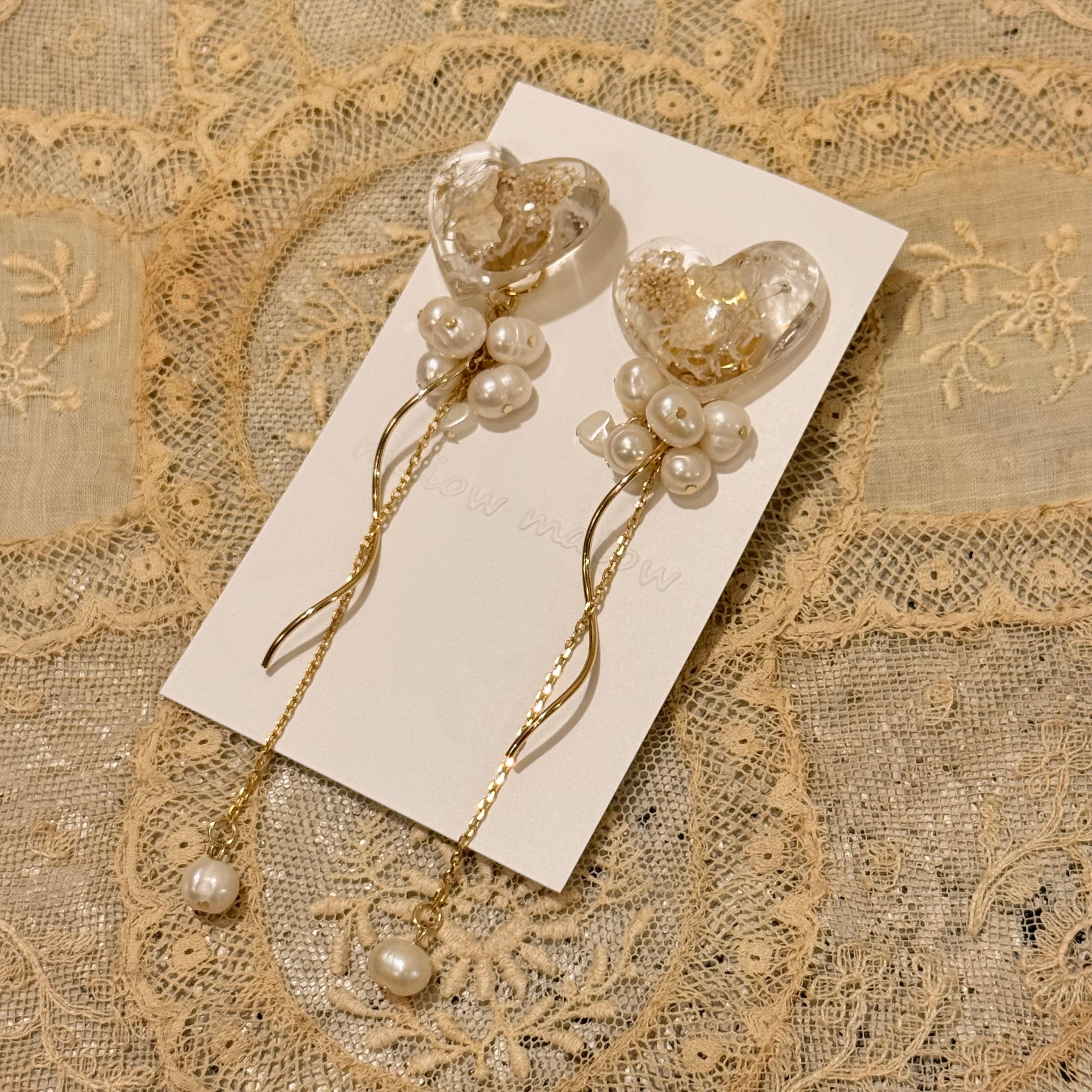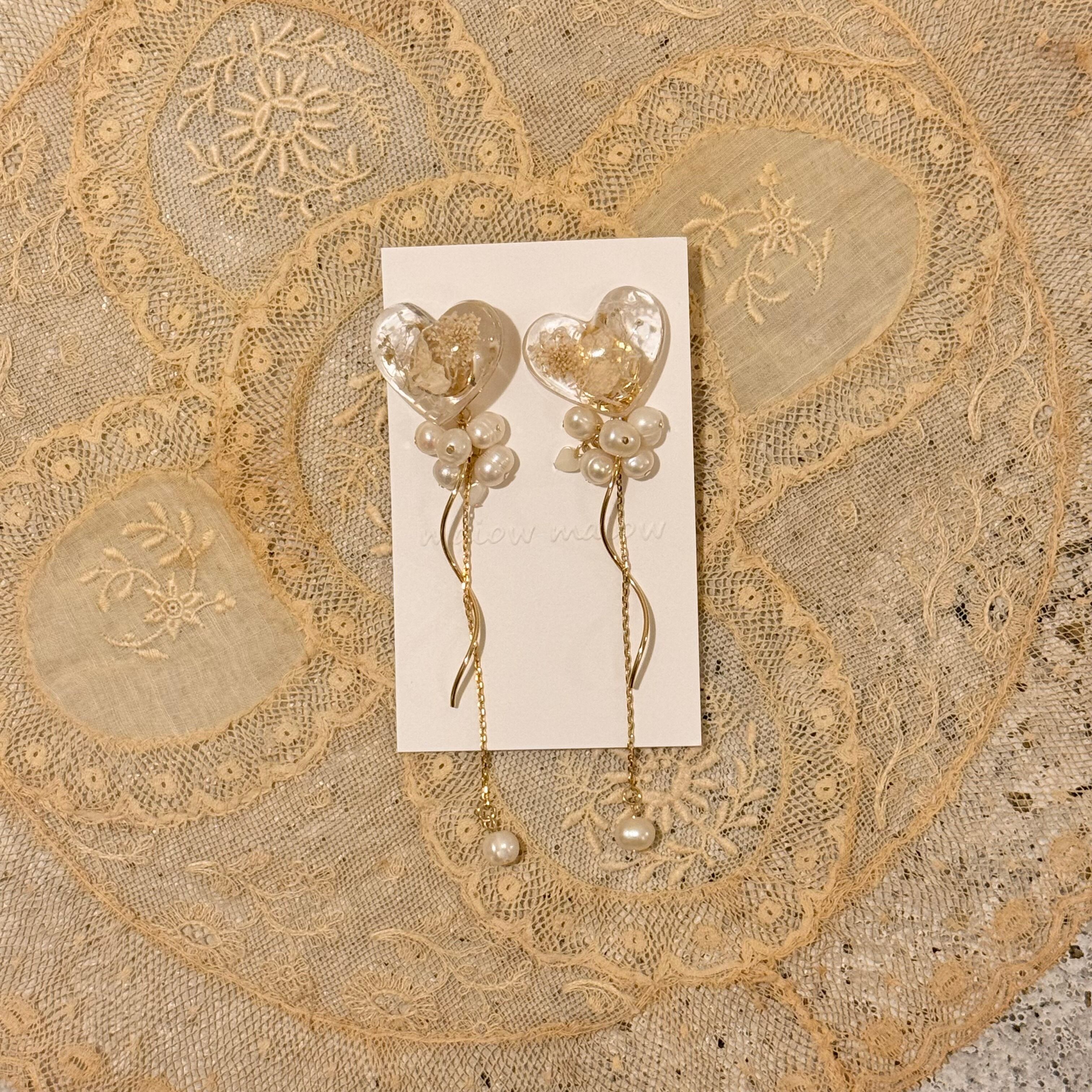 生成り系のカラーのドライフラワーを閉じ込めたハートと繊細なゴールドチェーンやパールの組み合わせが美しいです。
