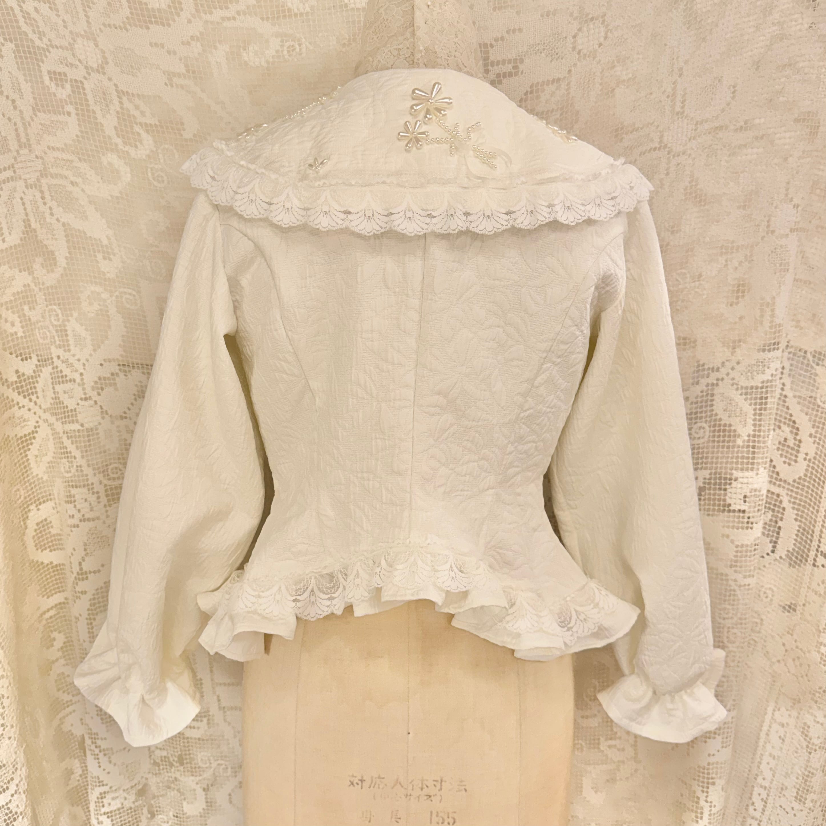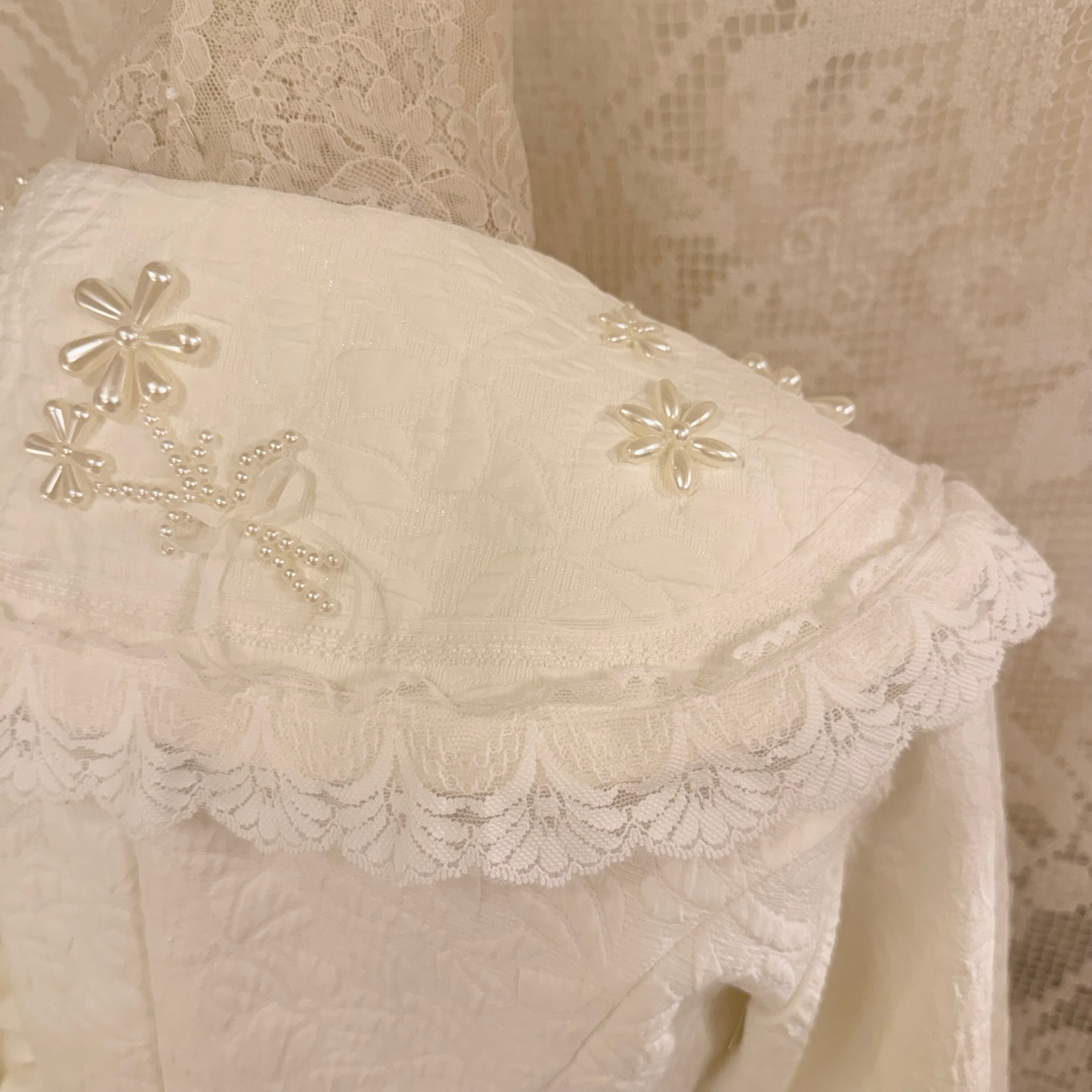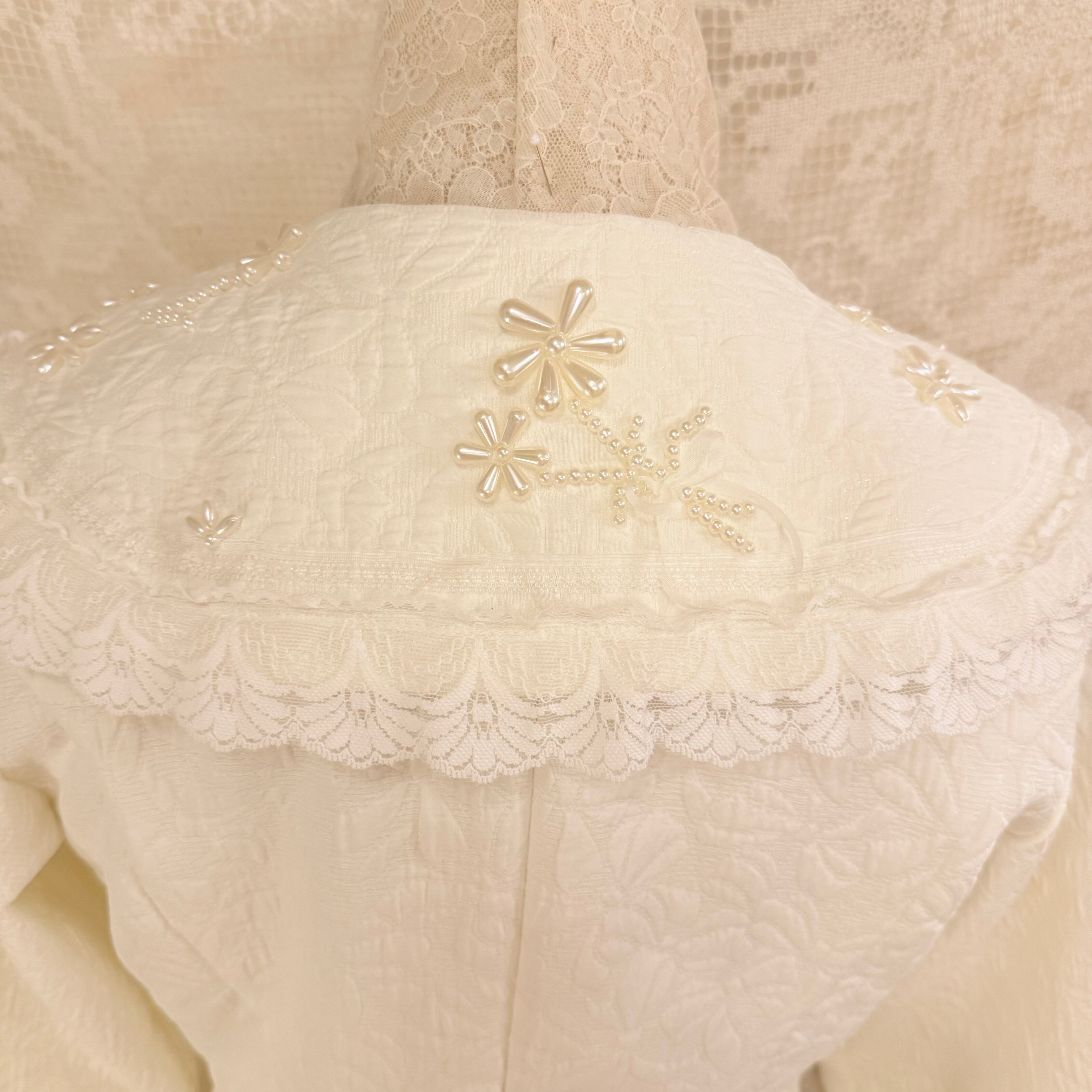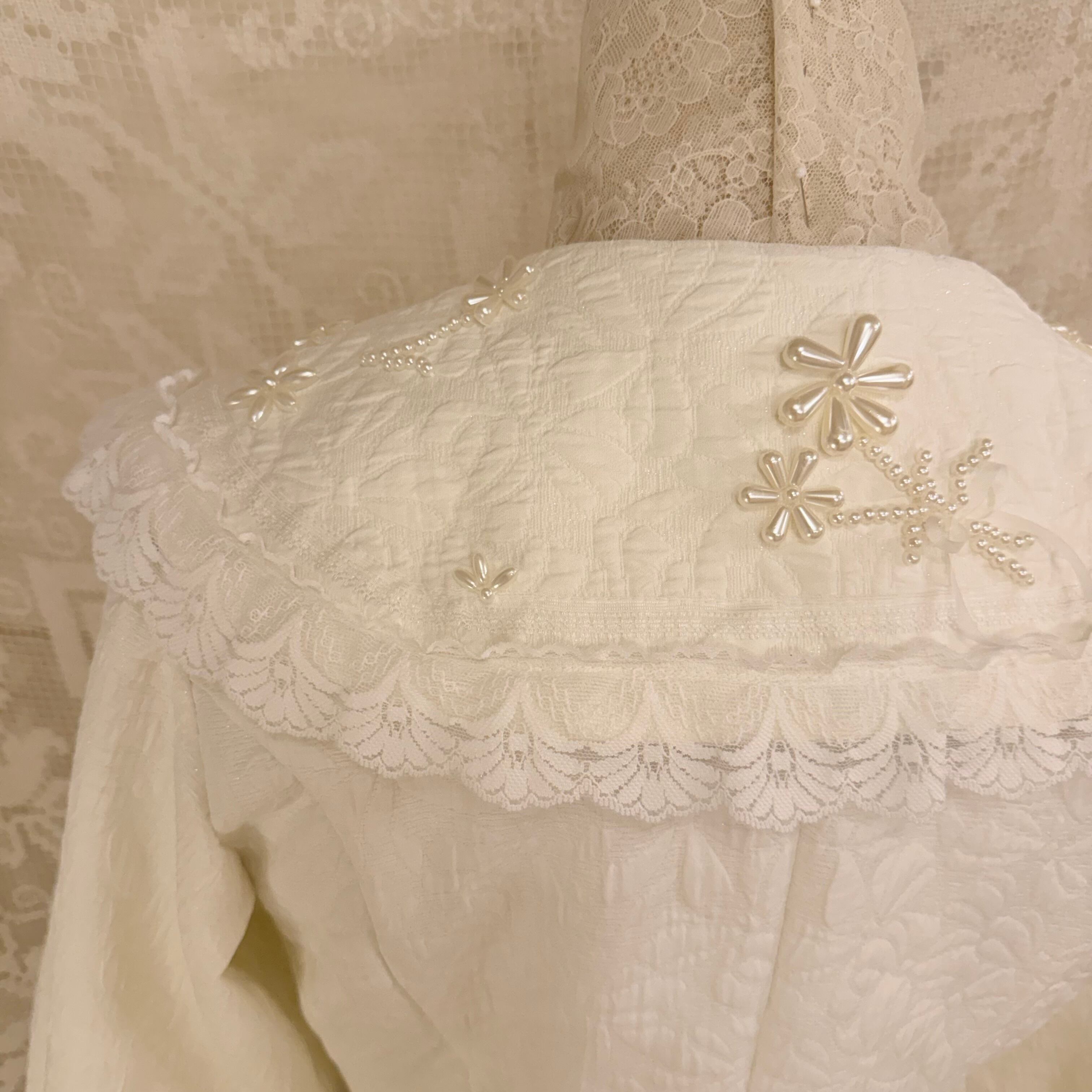 大きな襟には手刺繍でパールのお花が装飾してあり、クリアなお花ボタンがついていたり細部までとても美しいデザインになっています。