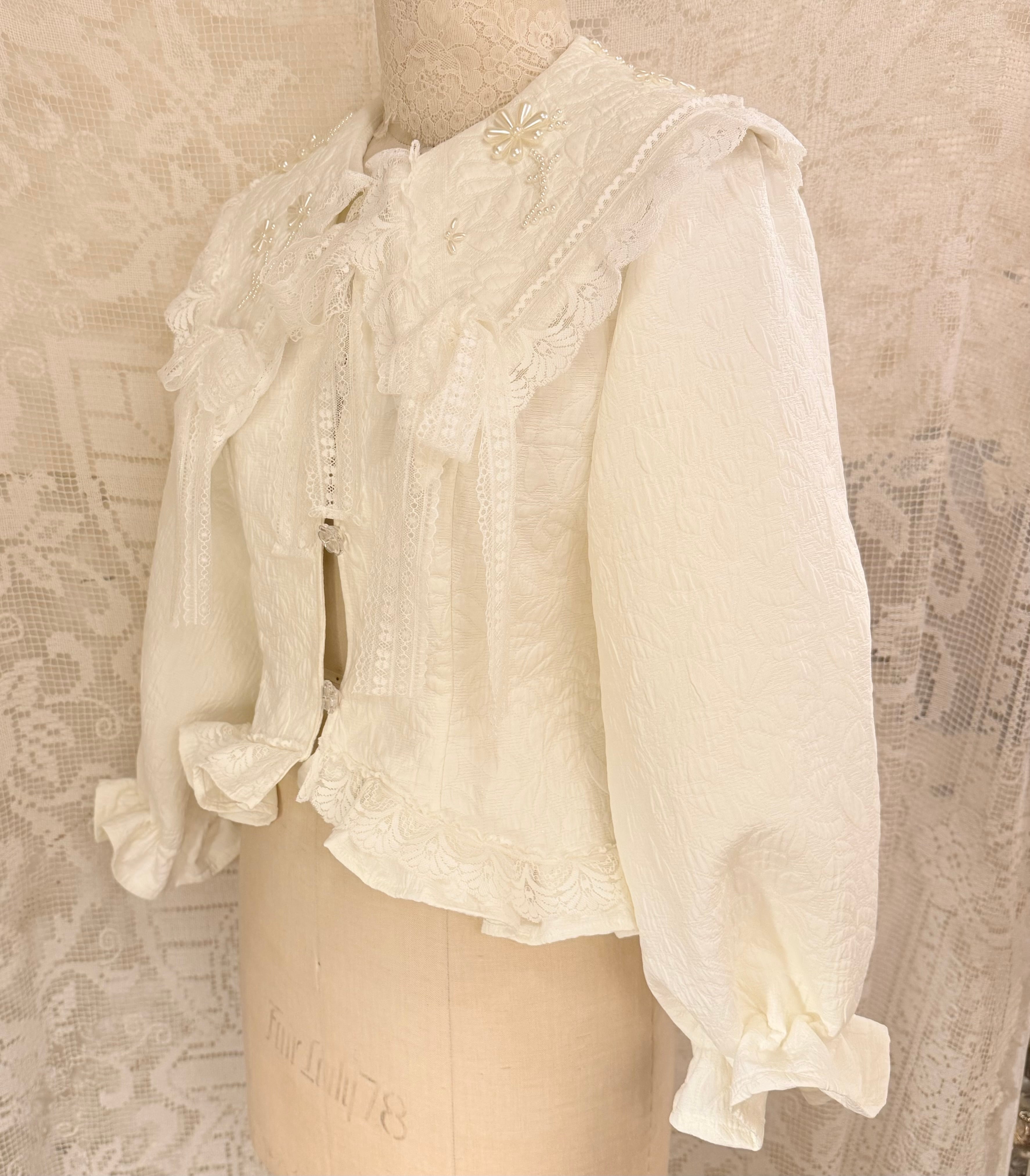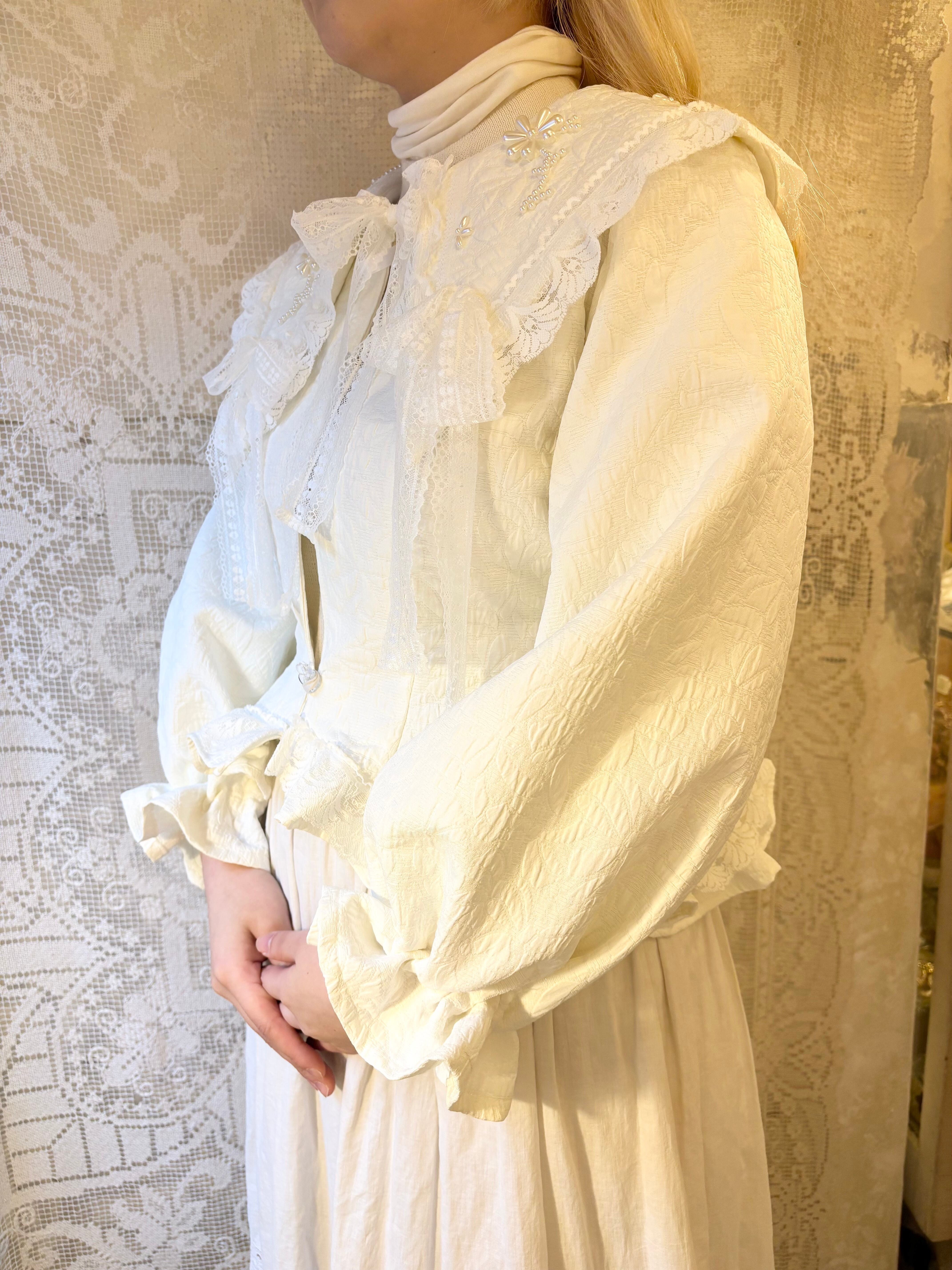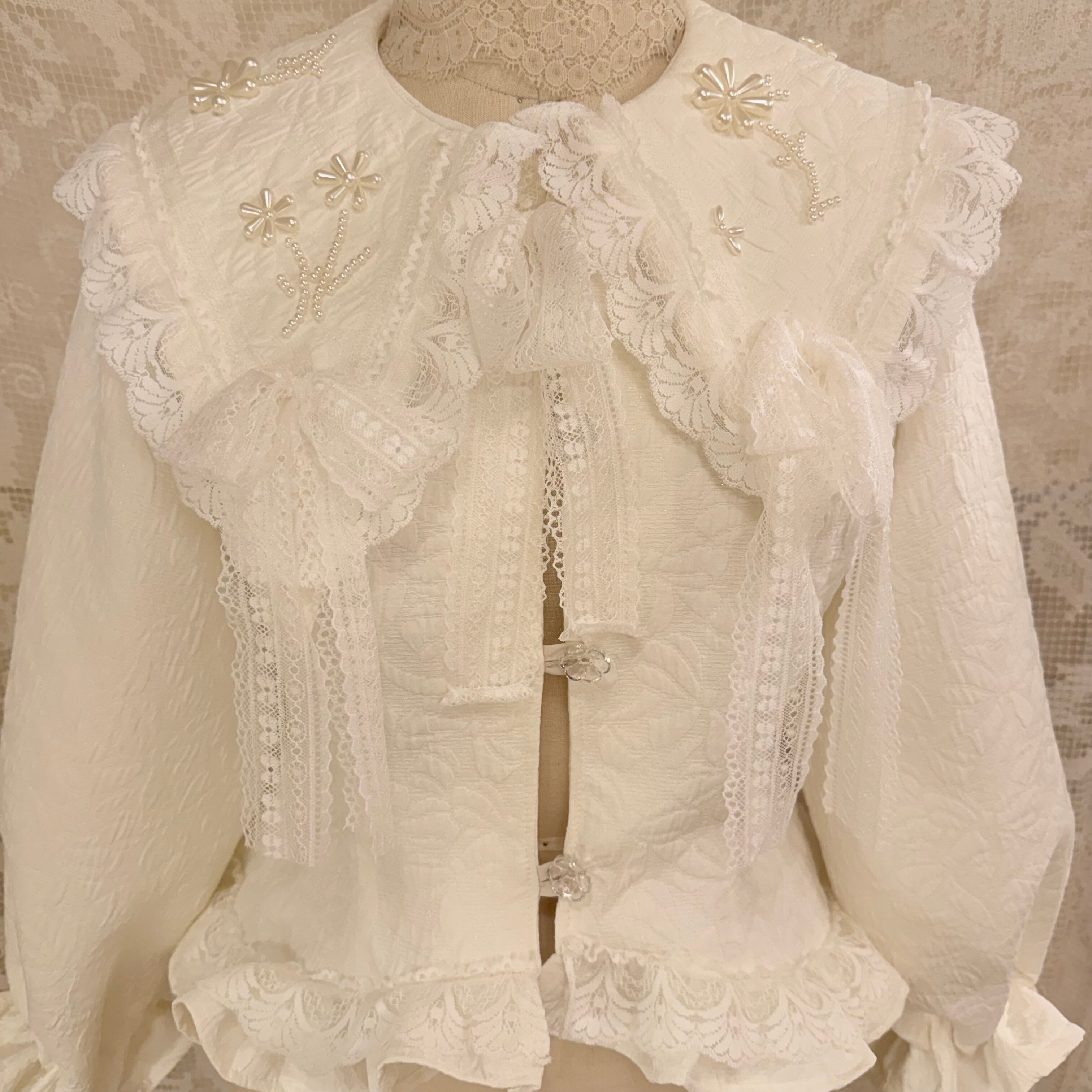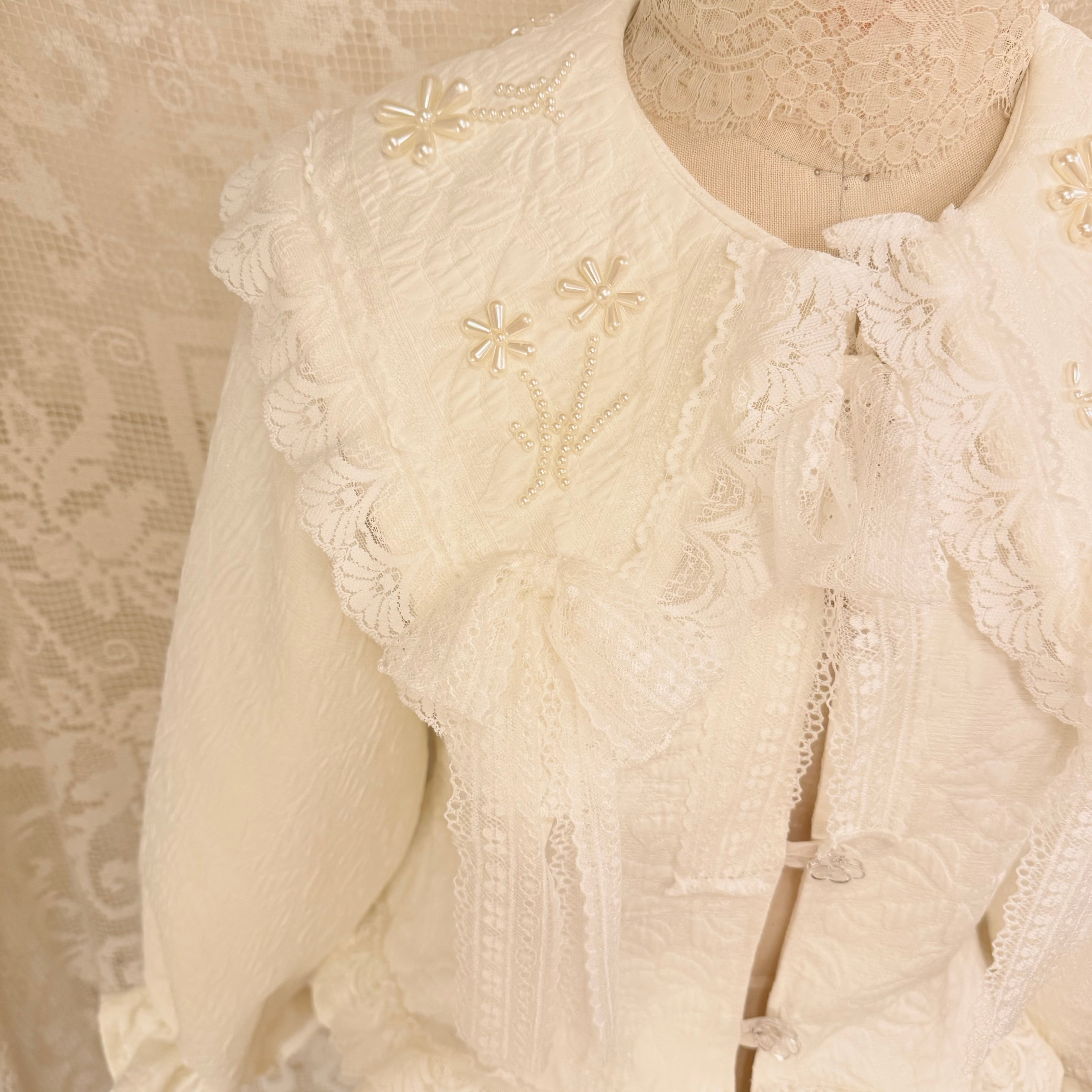 大きな襟には手刺繍でパールのお花が装飾してあり、クリアなお花ボタンがついていたり細部までとても美しいデザインになっています。