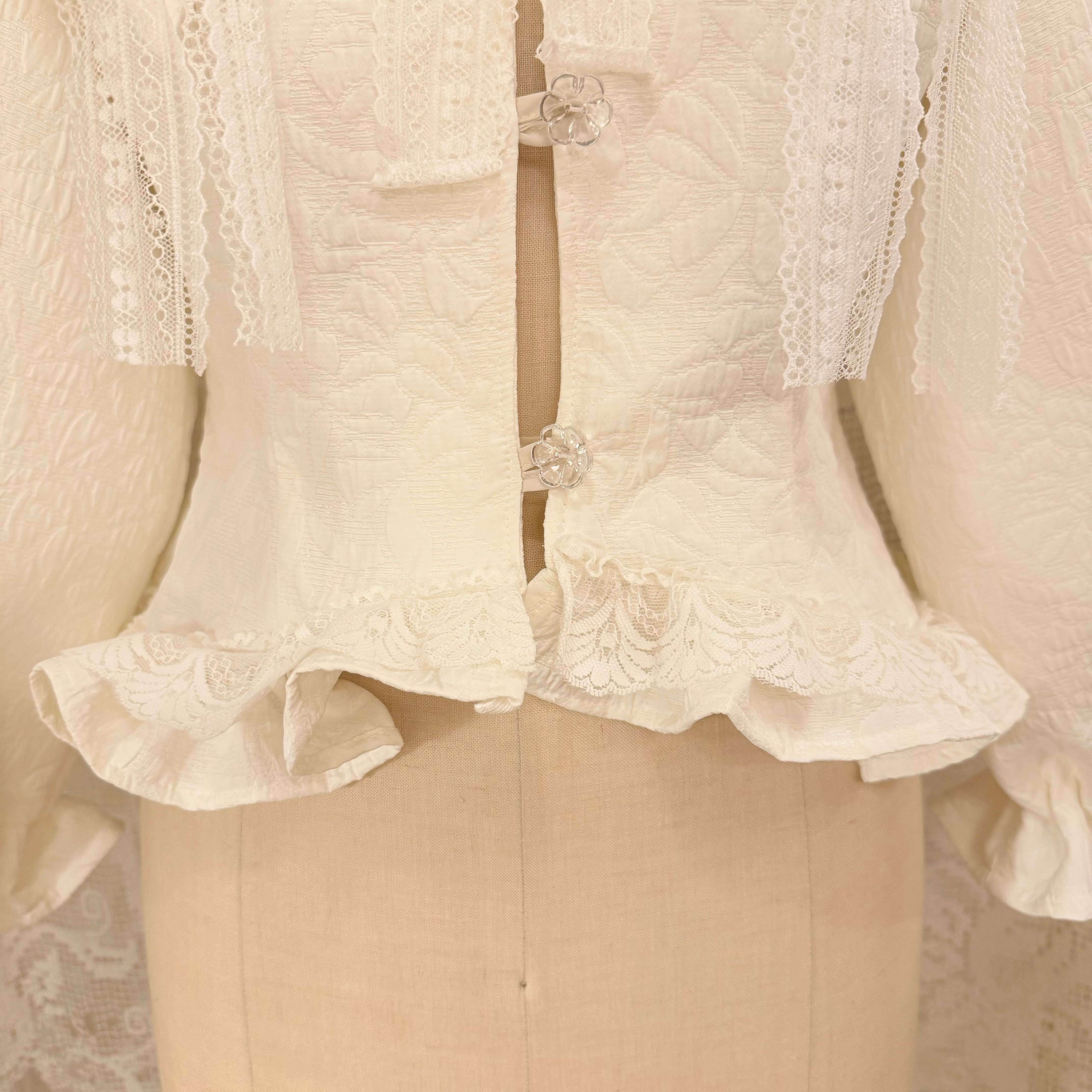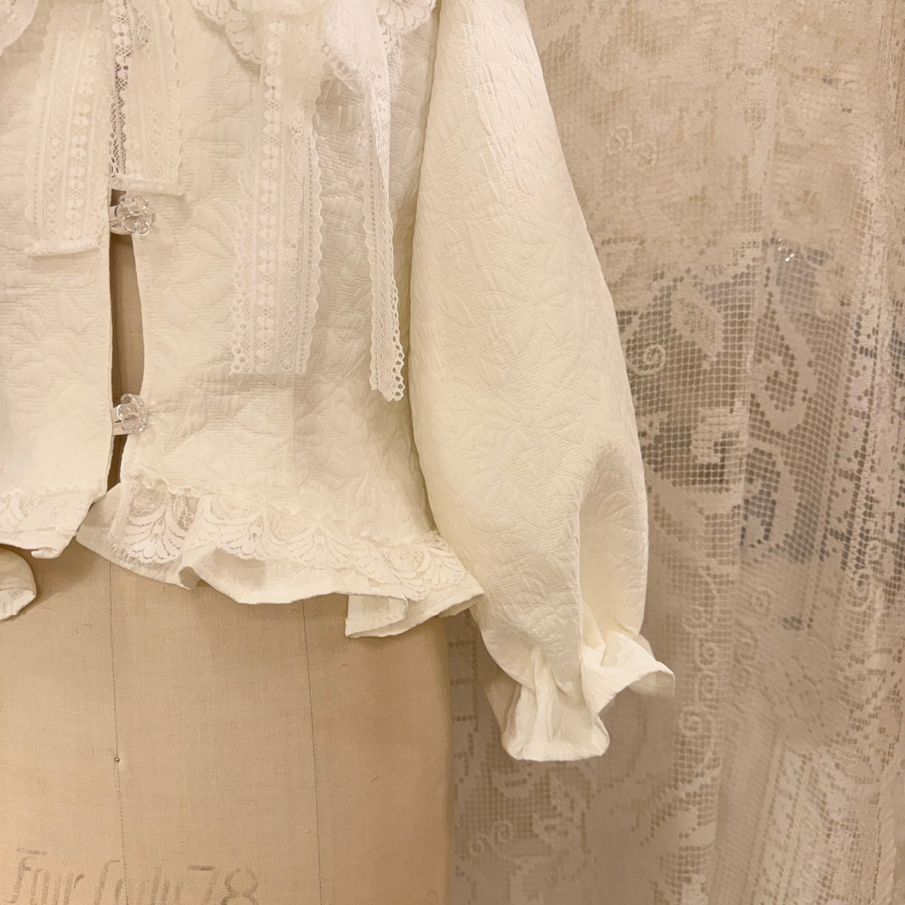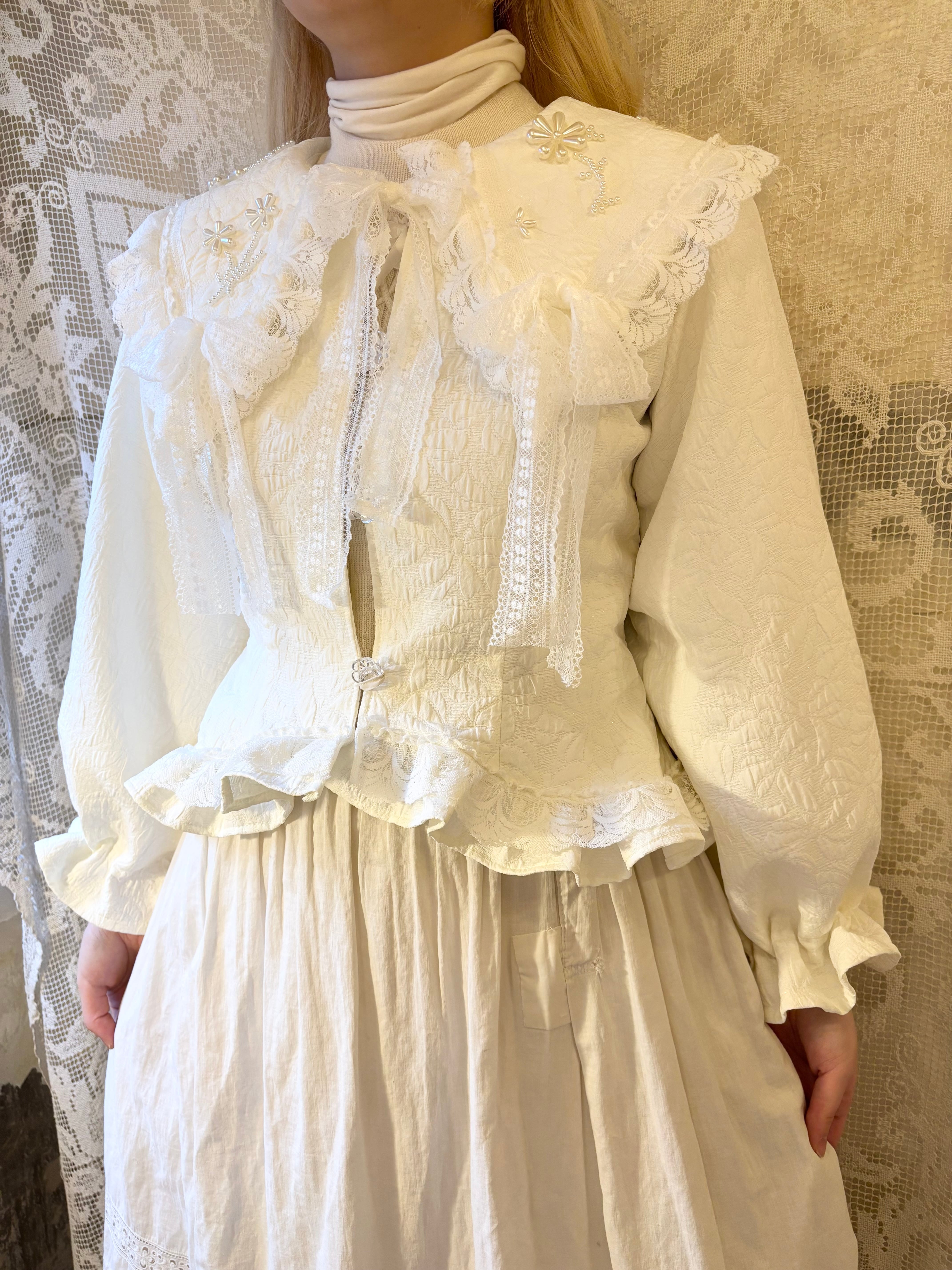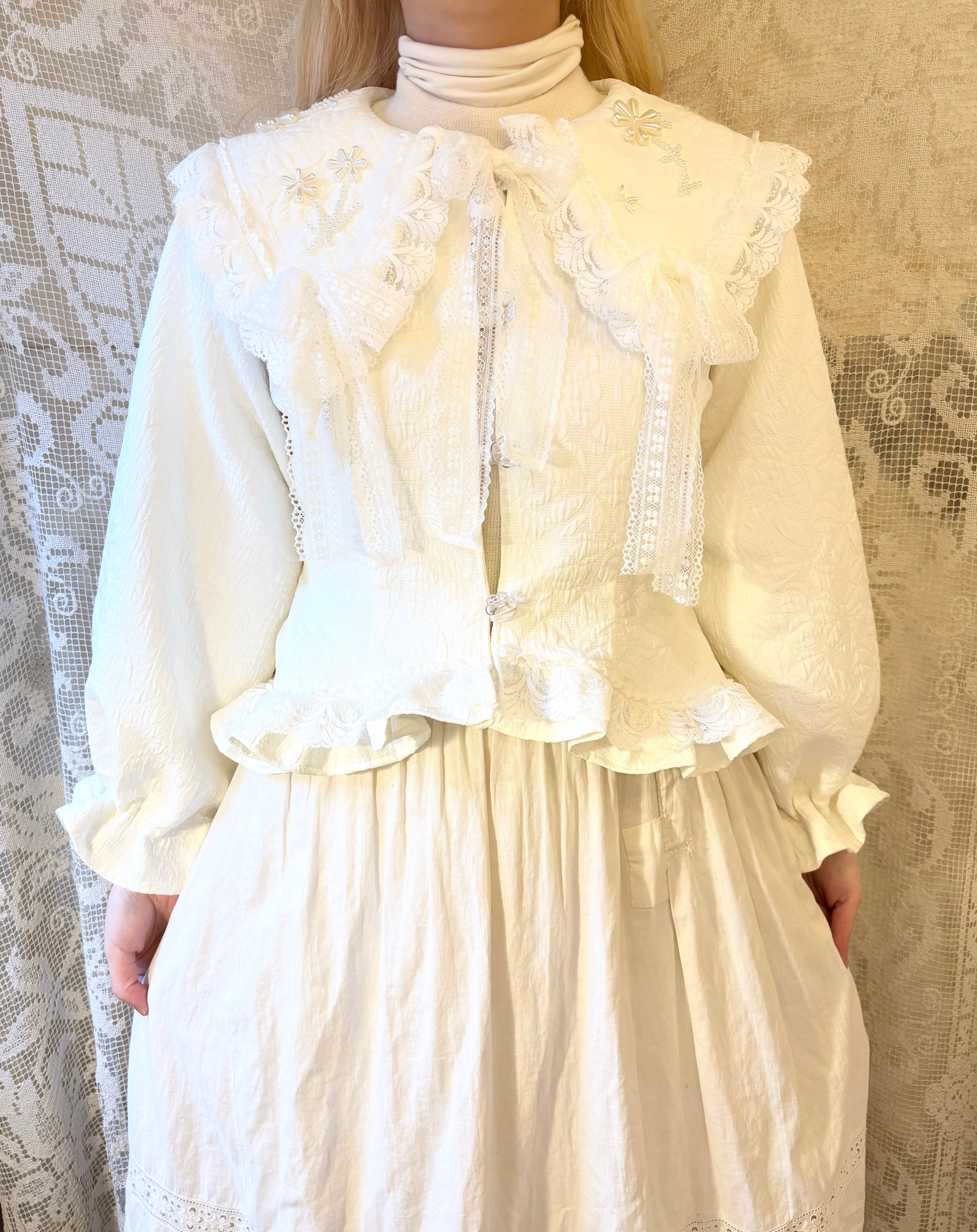 大きな襟には手刺繍でパールのお花が装飾してあり、クリアなお花ボタンがついていたり細部までとても美しいデザインになっています。