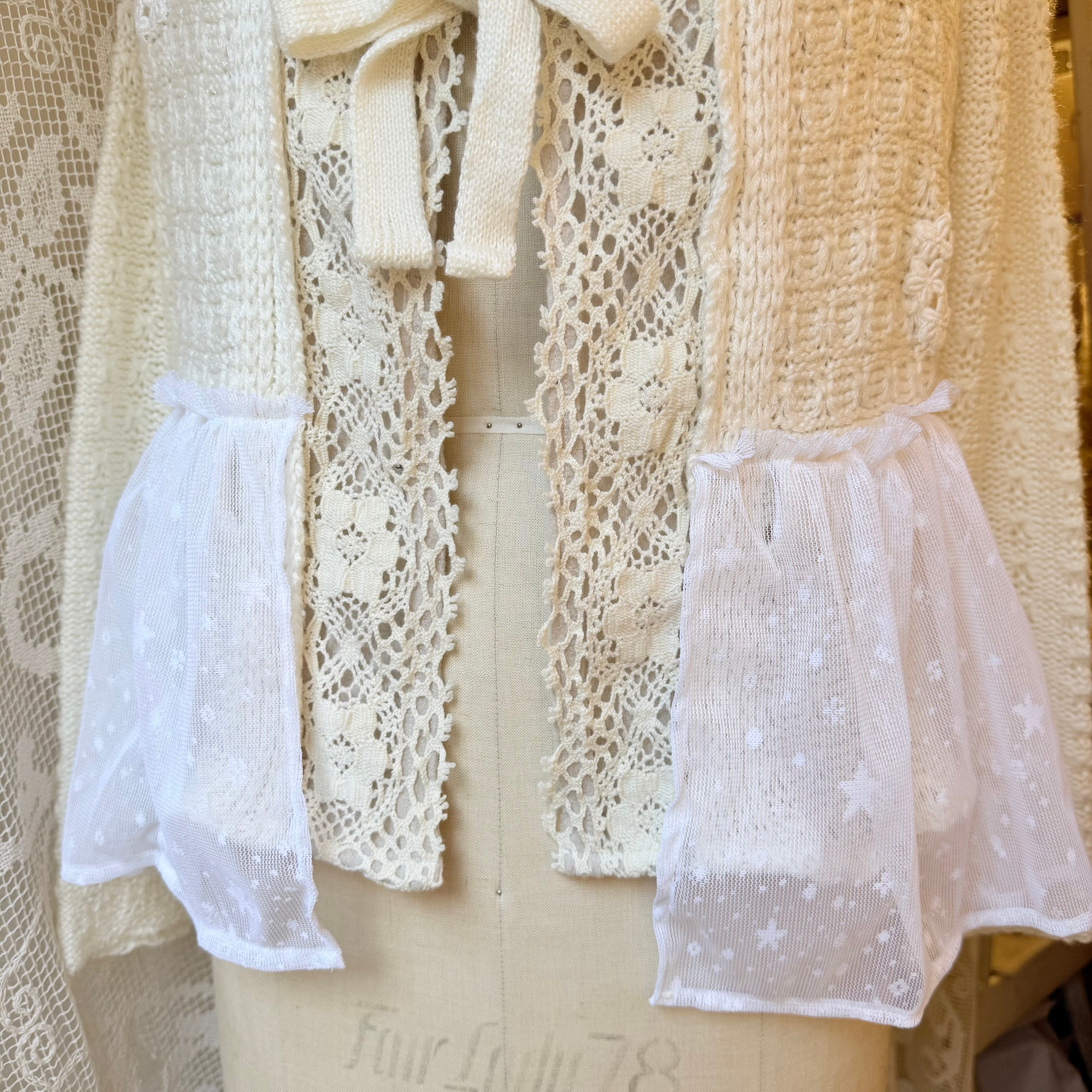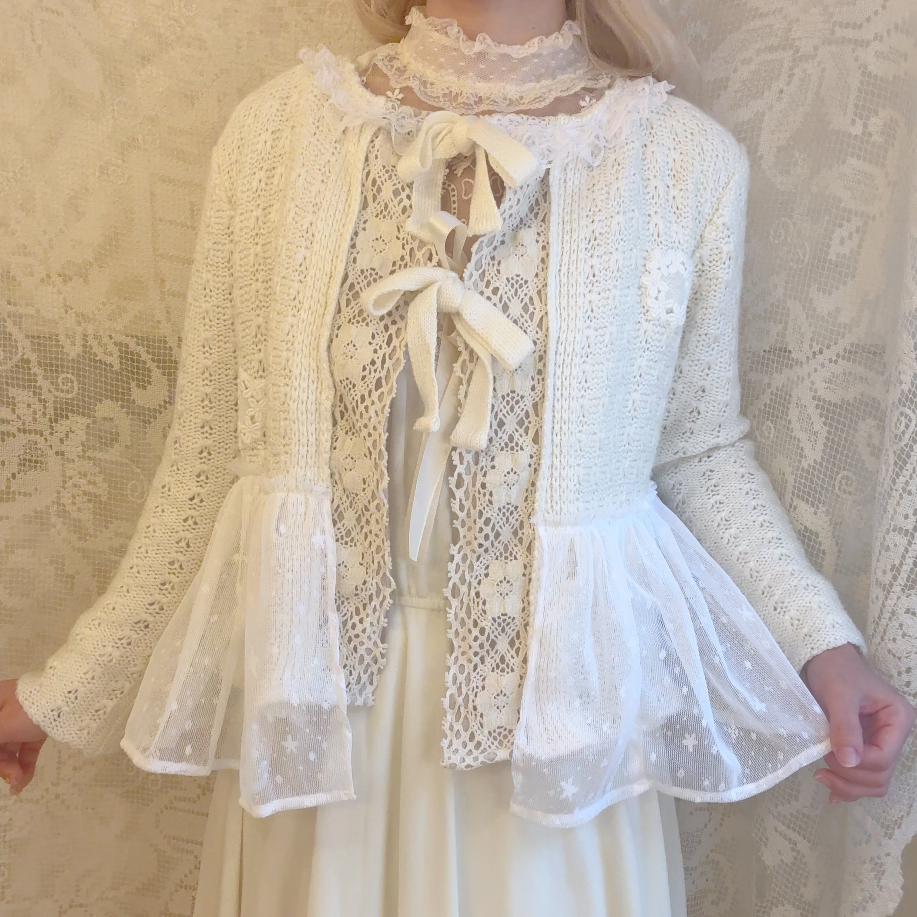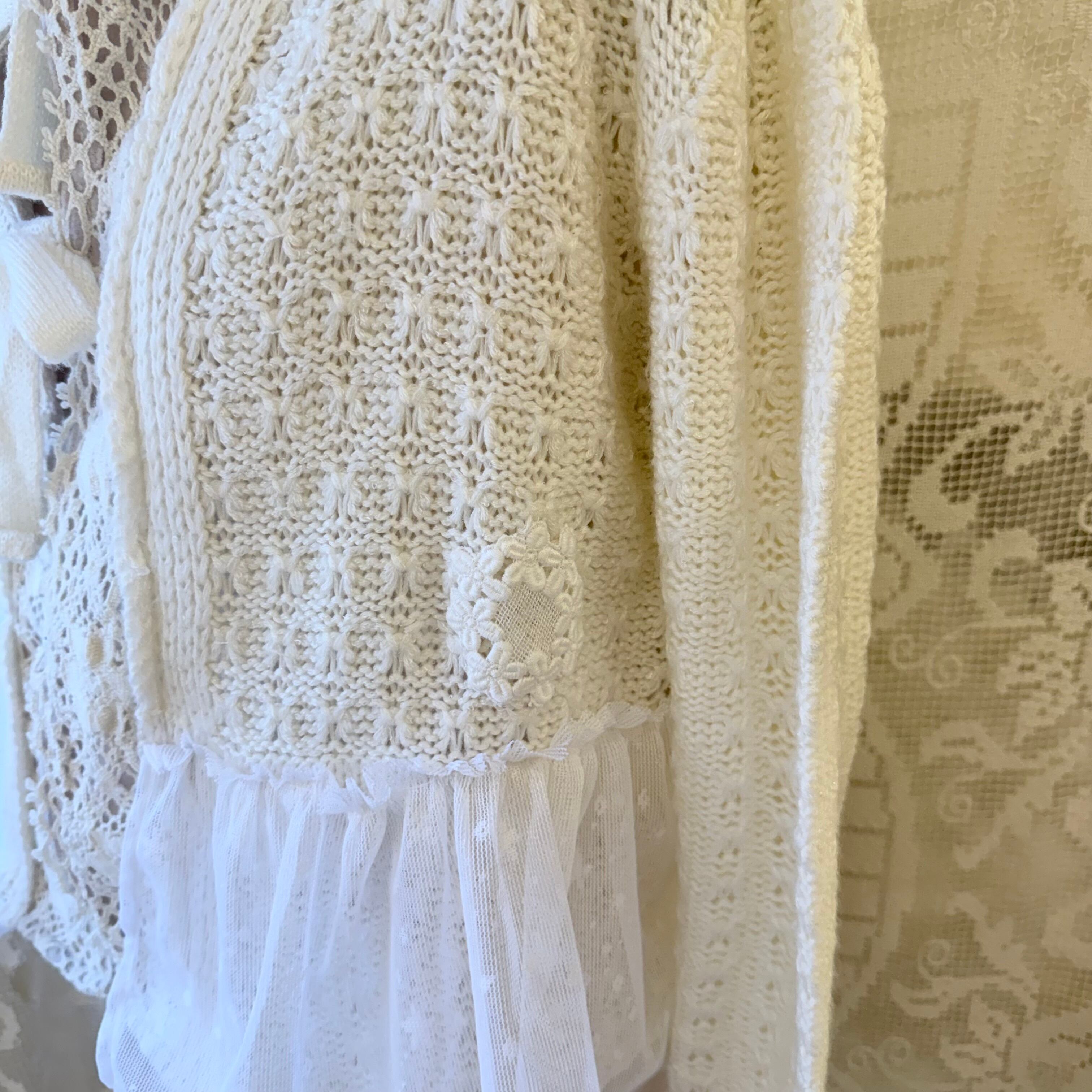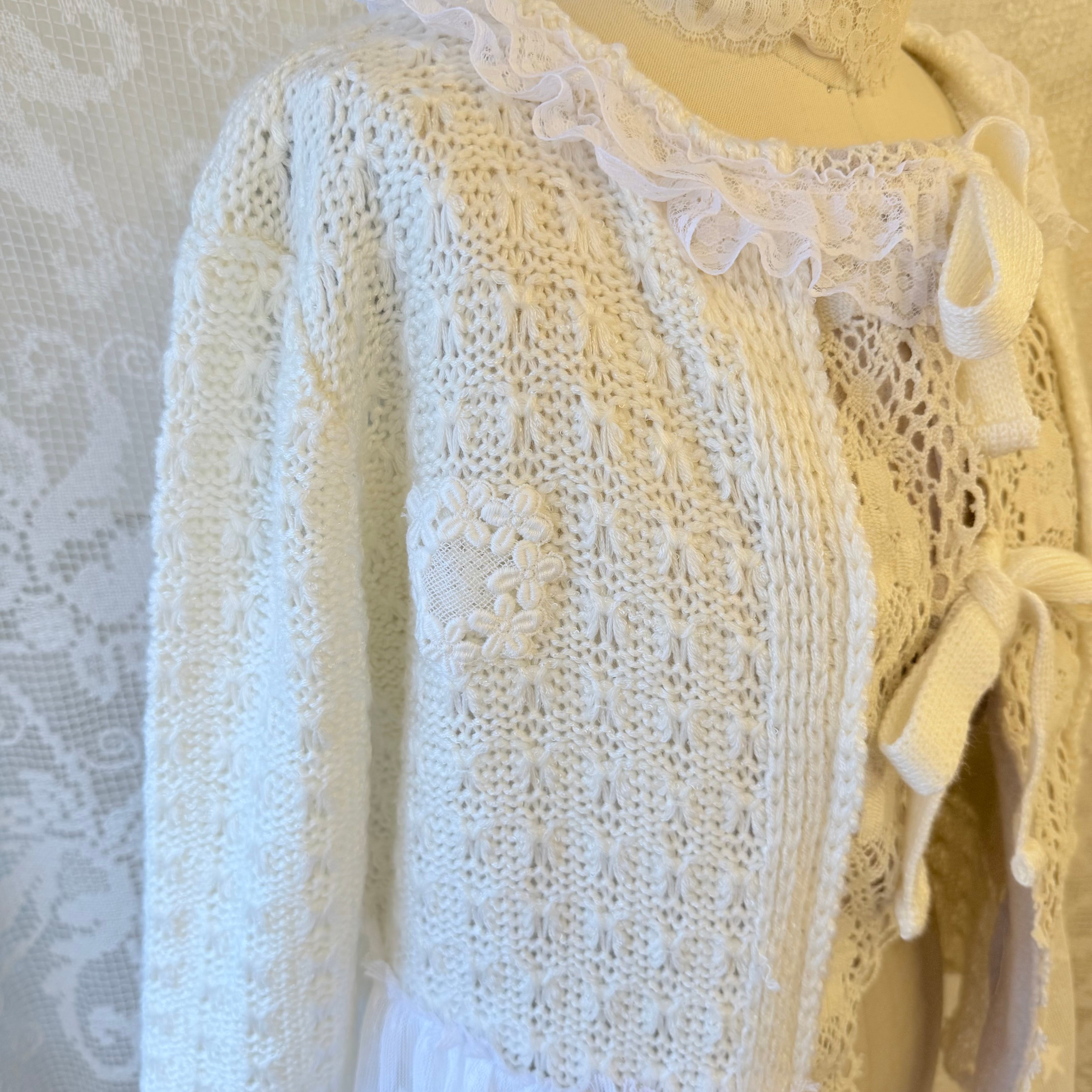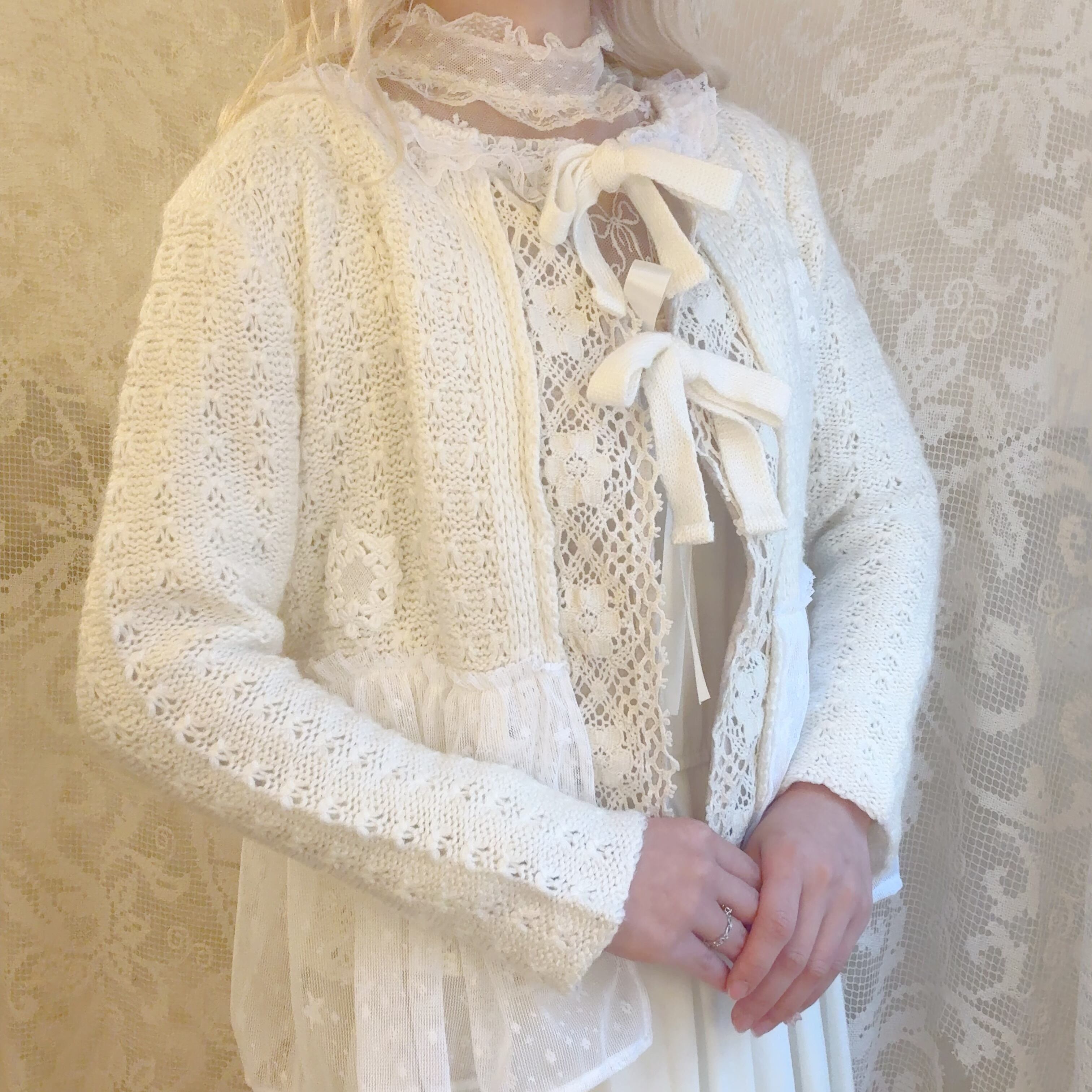 usedの春ニットにvintageレース等を装飾したリメイクカーディガン。