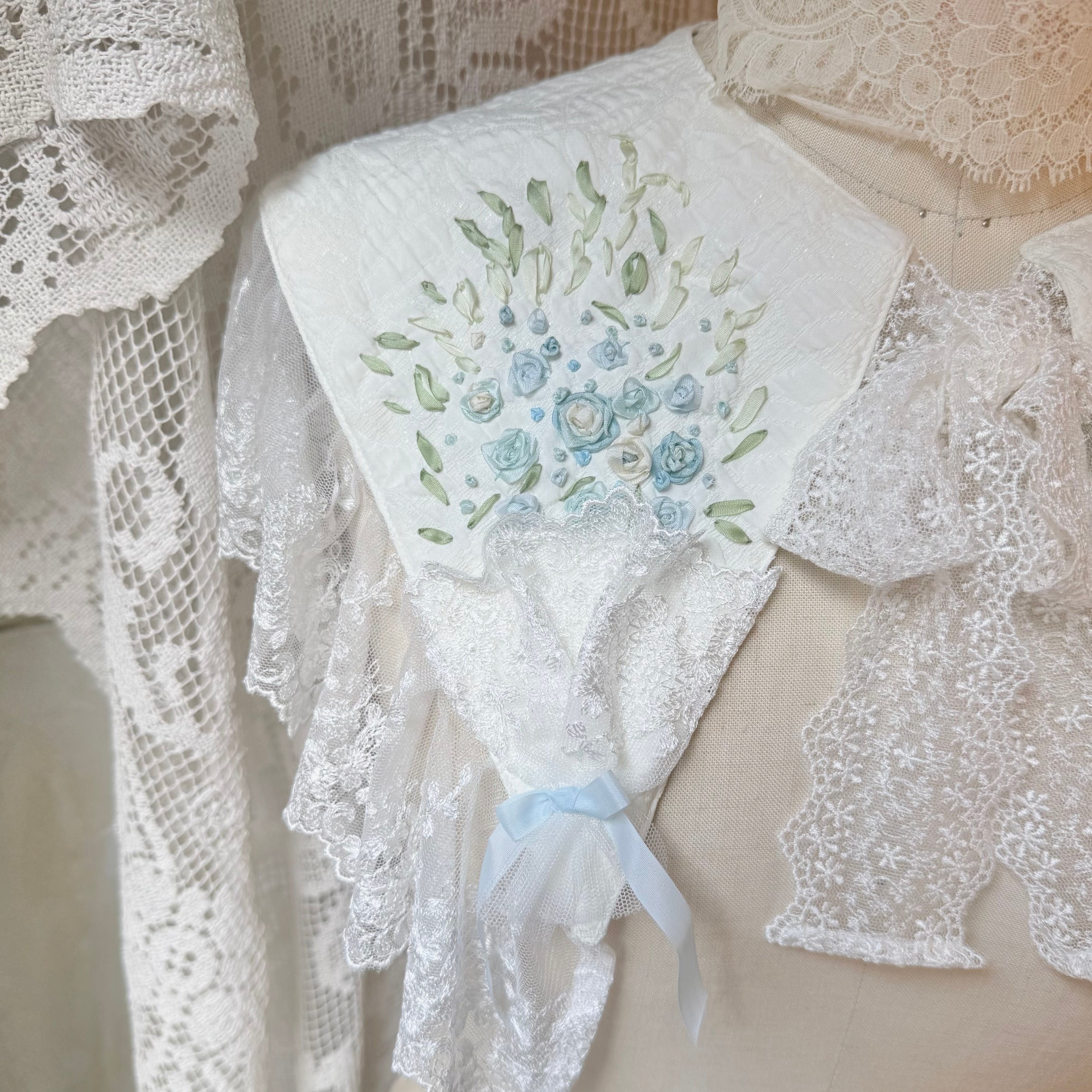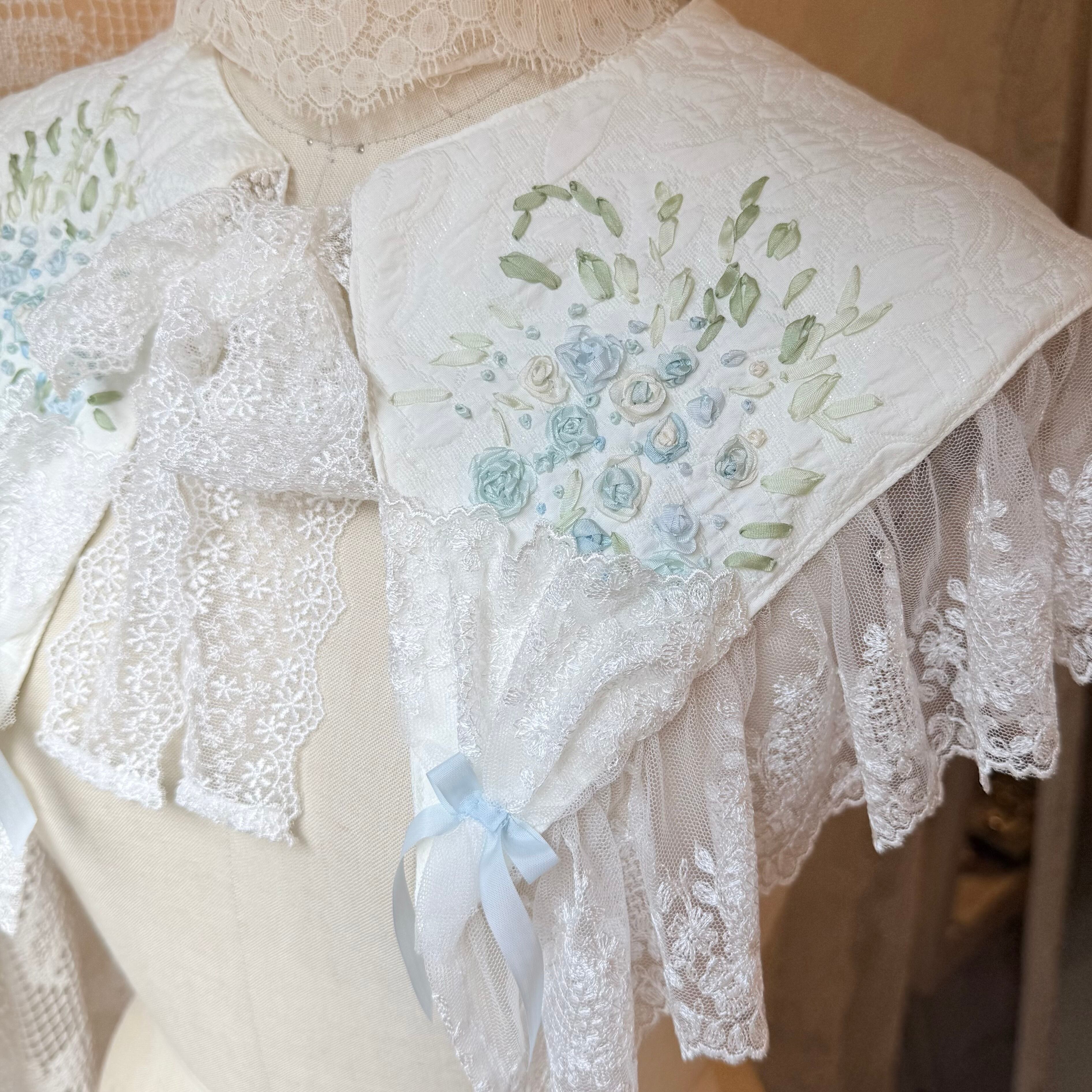 手刺繍の水色の薔薇の装飾がとても美しいです。