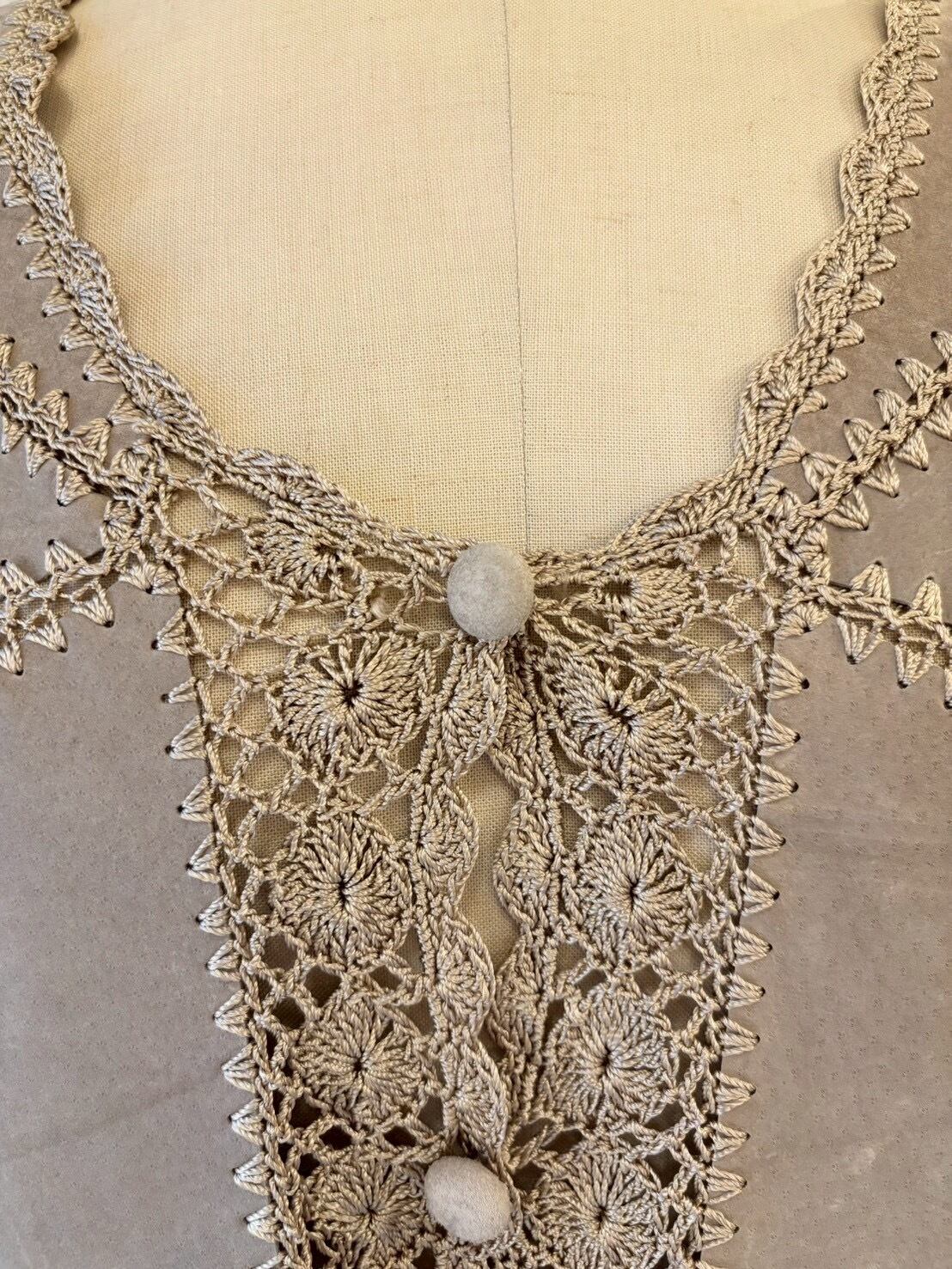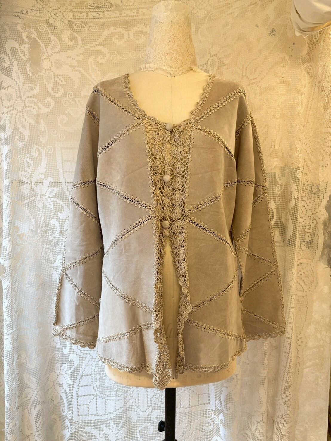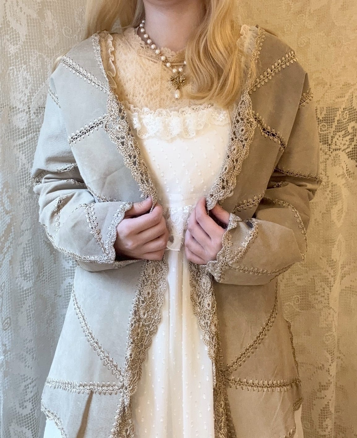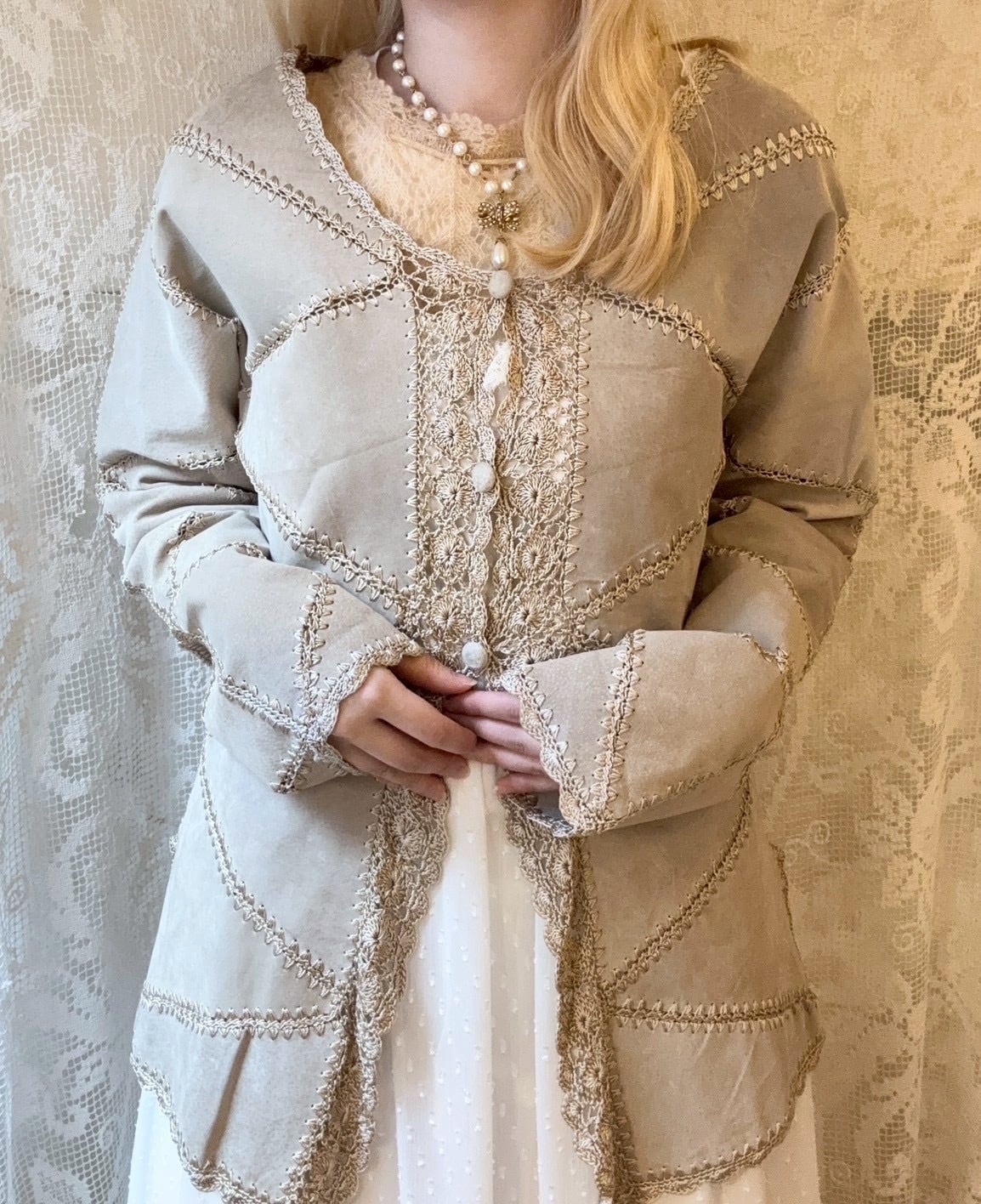レース編みのパッチワークデザインがとても可愛く、レザーを柔らかい印象に見せてくれます♡