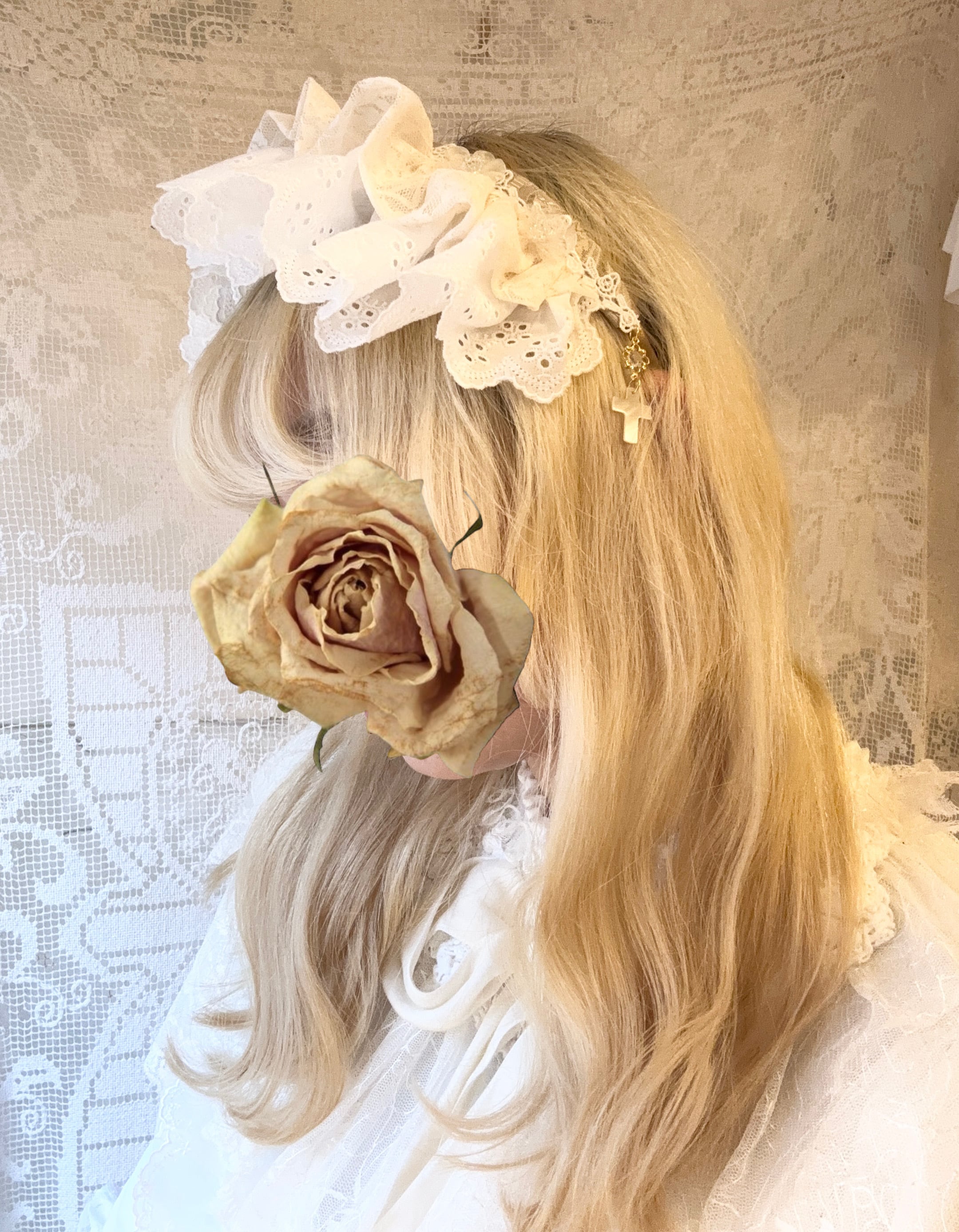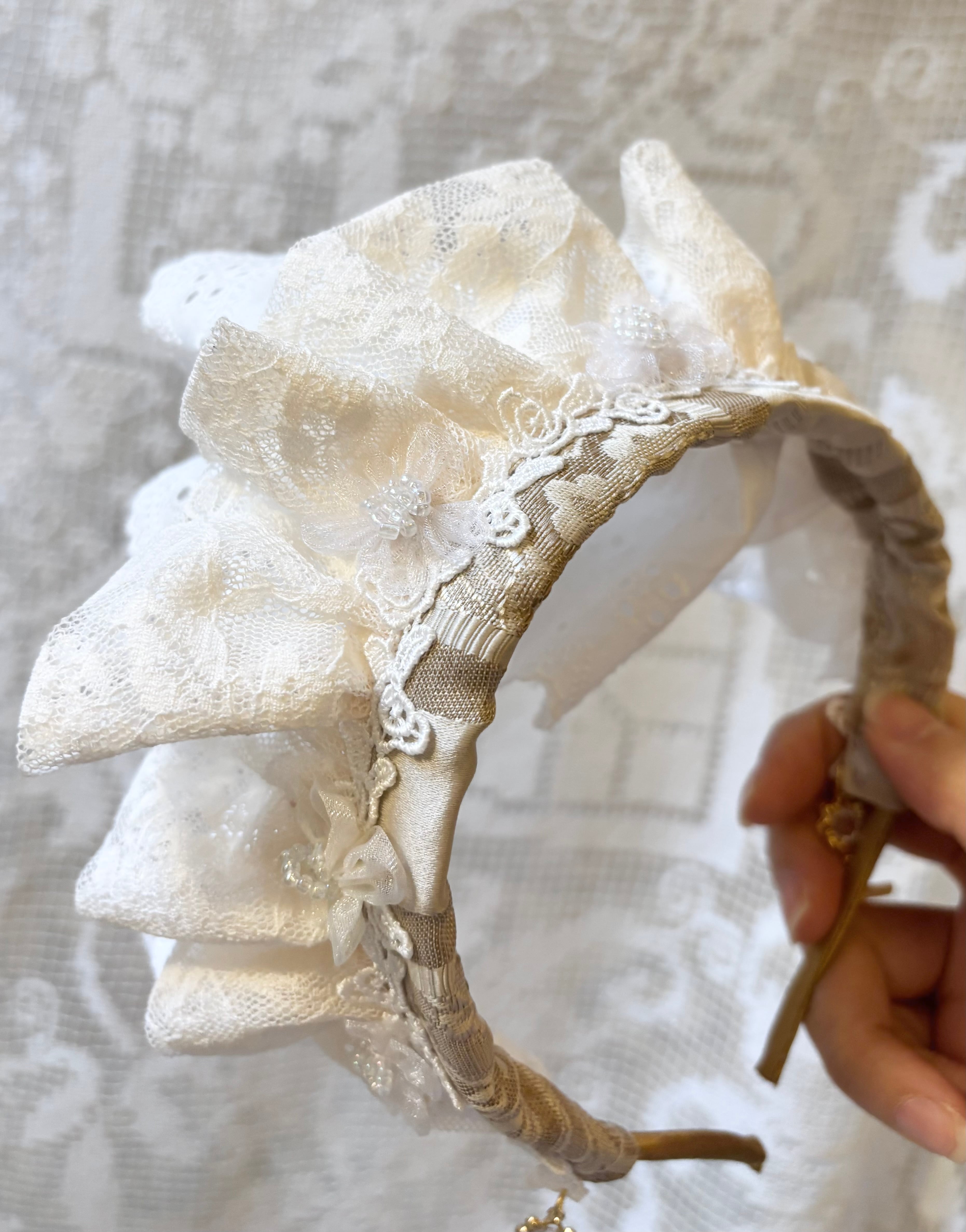 レースディティールとCrossチャームが可愛いヘッドドレス。