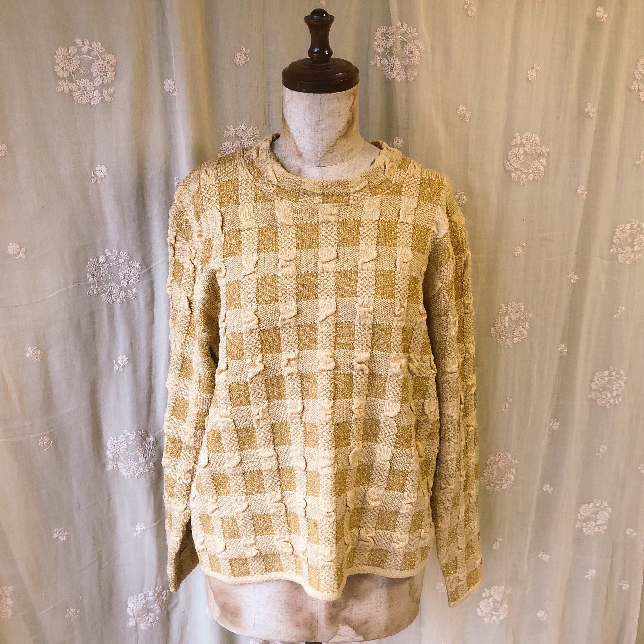 黄色とキャラメル色を混ぜたような美味しそうなカラー。ラメが編まれたニットでホイップみたいな少し立体的な模様でチェックになっていてとっても可愛いです。