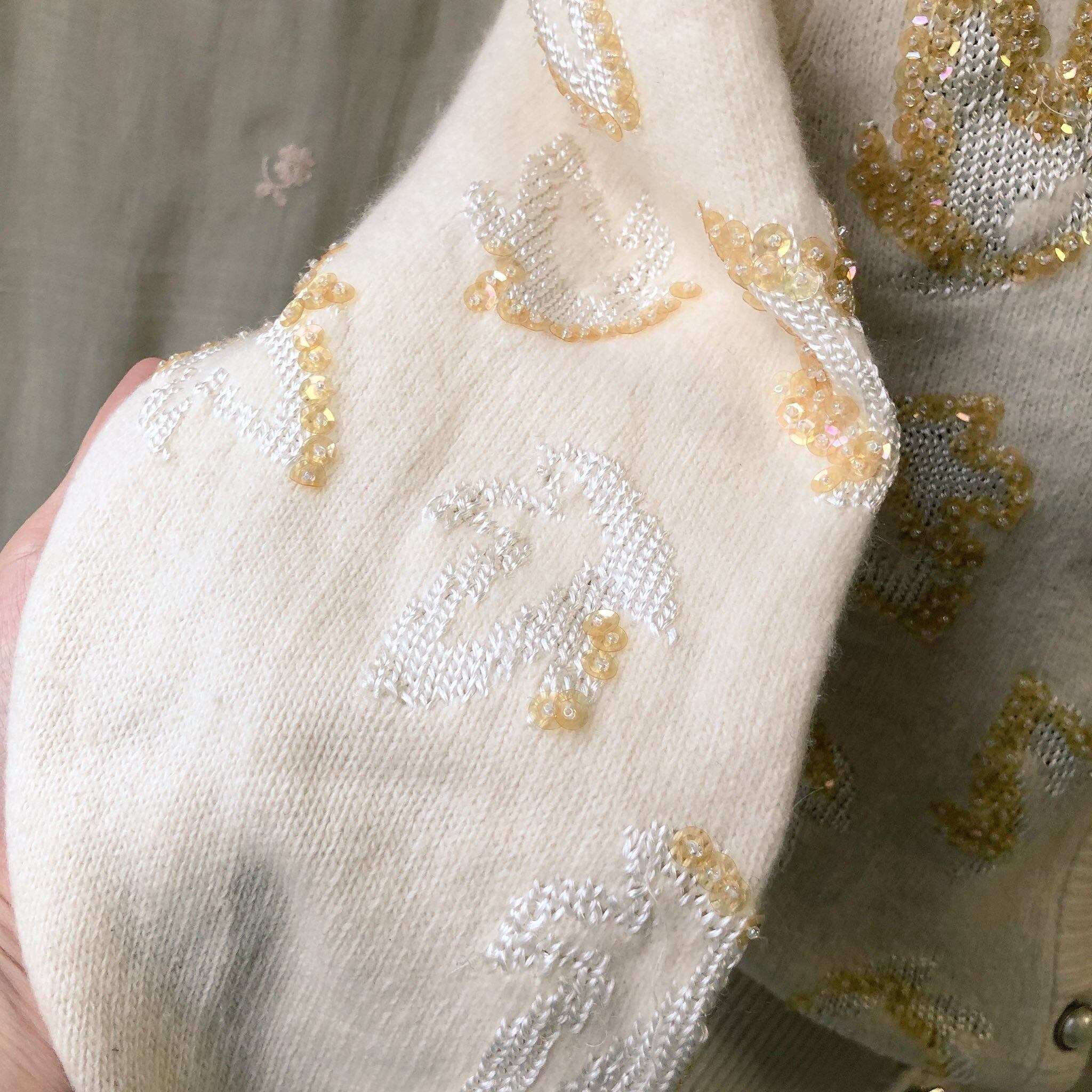 アイボリーニットに淡い黄色系のスパンコールがついたカーディガンです。