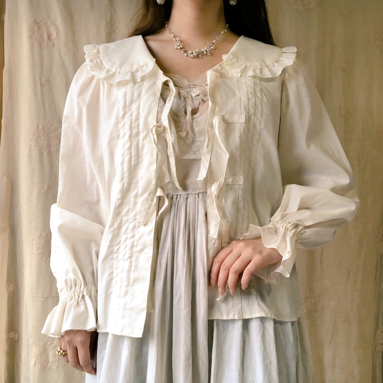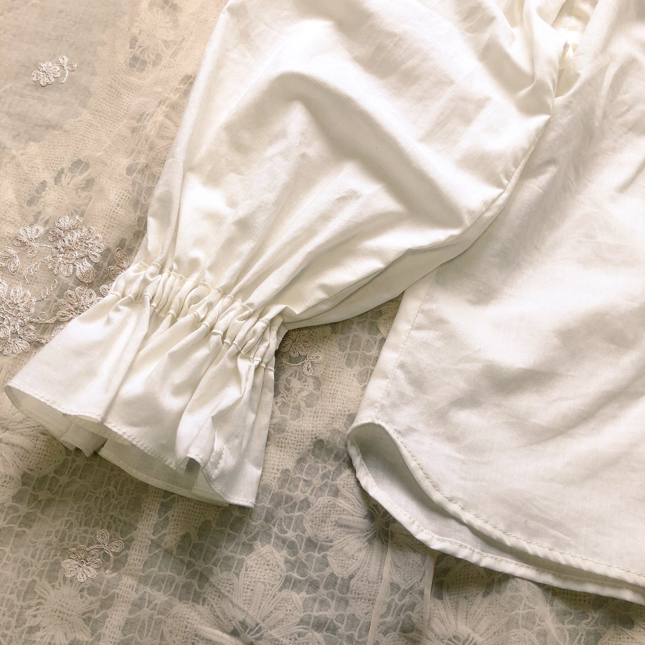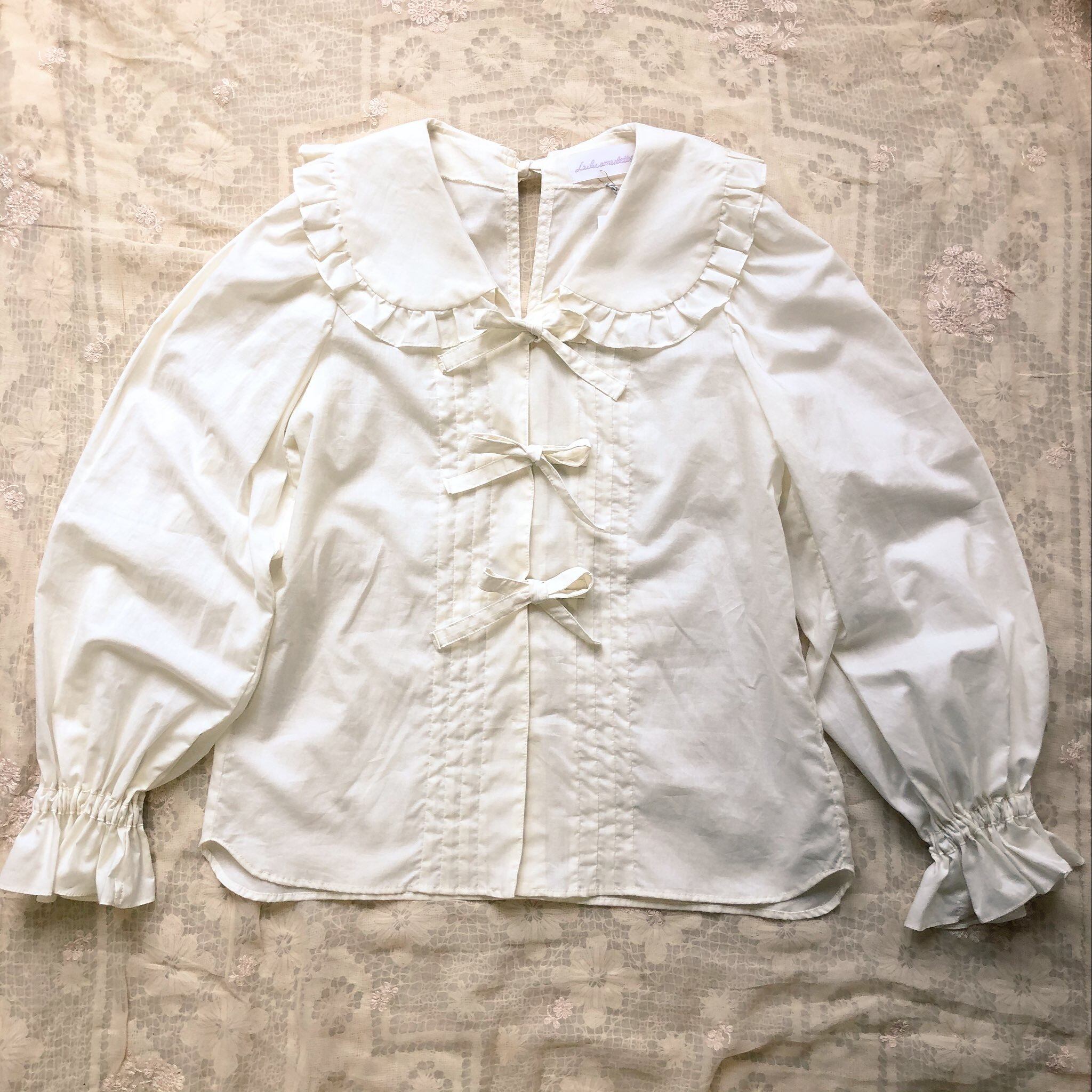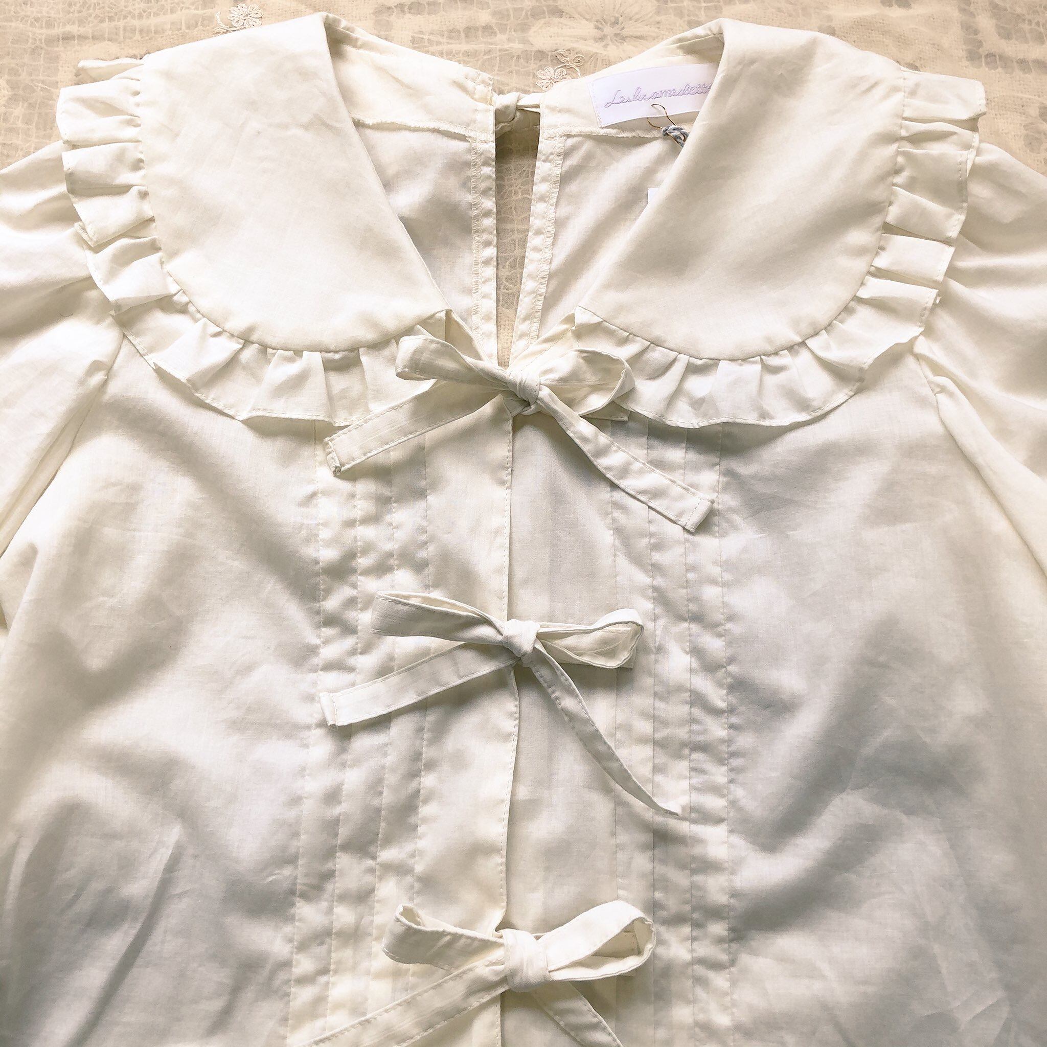 大きなフリルたっぷりの襟、ふんわりお袖、前に3つ、後ろに一つ結んだおリボン、絶妙なバランスで可愛いです。
