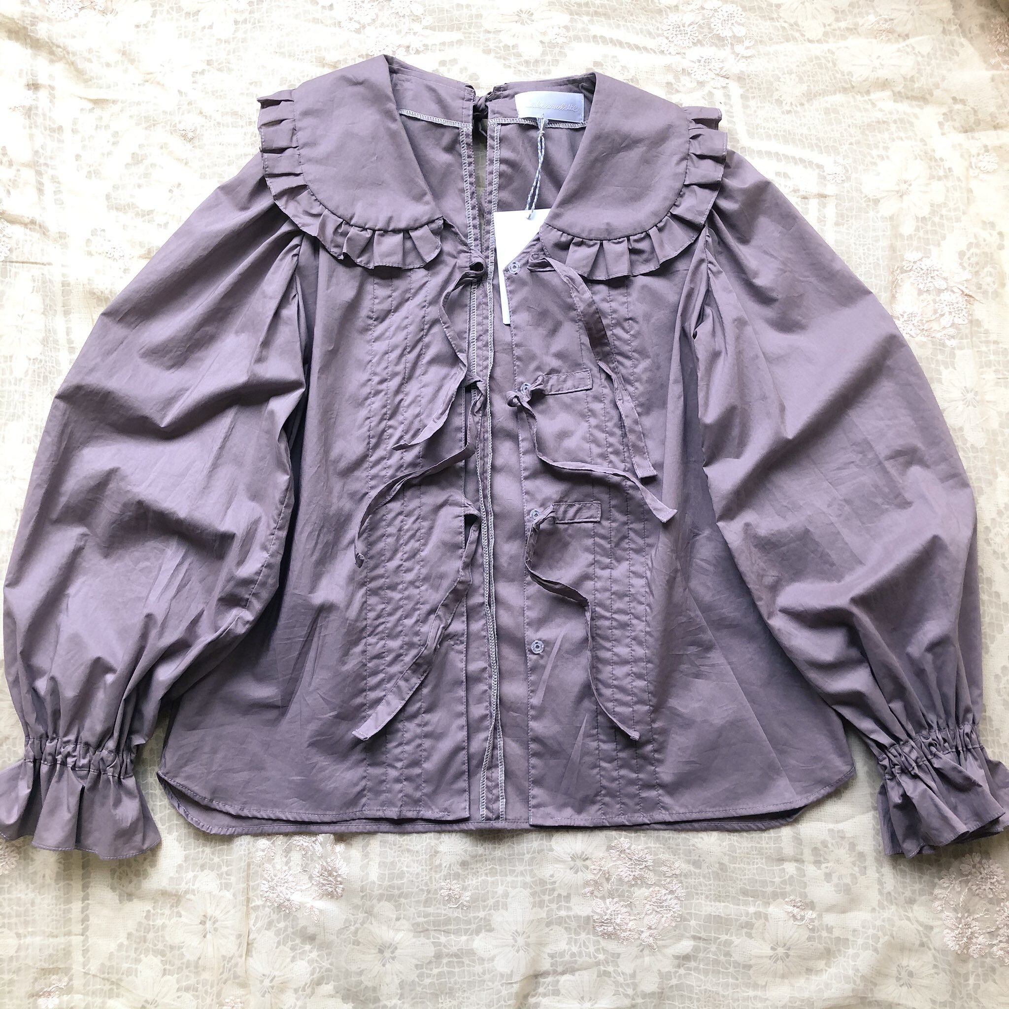 少しハリのある落ち着いた優しいラベンダー生地のシルエットが可愛いすぎるブラウス。