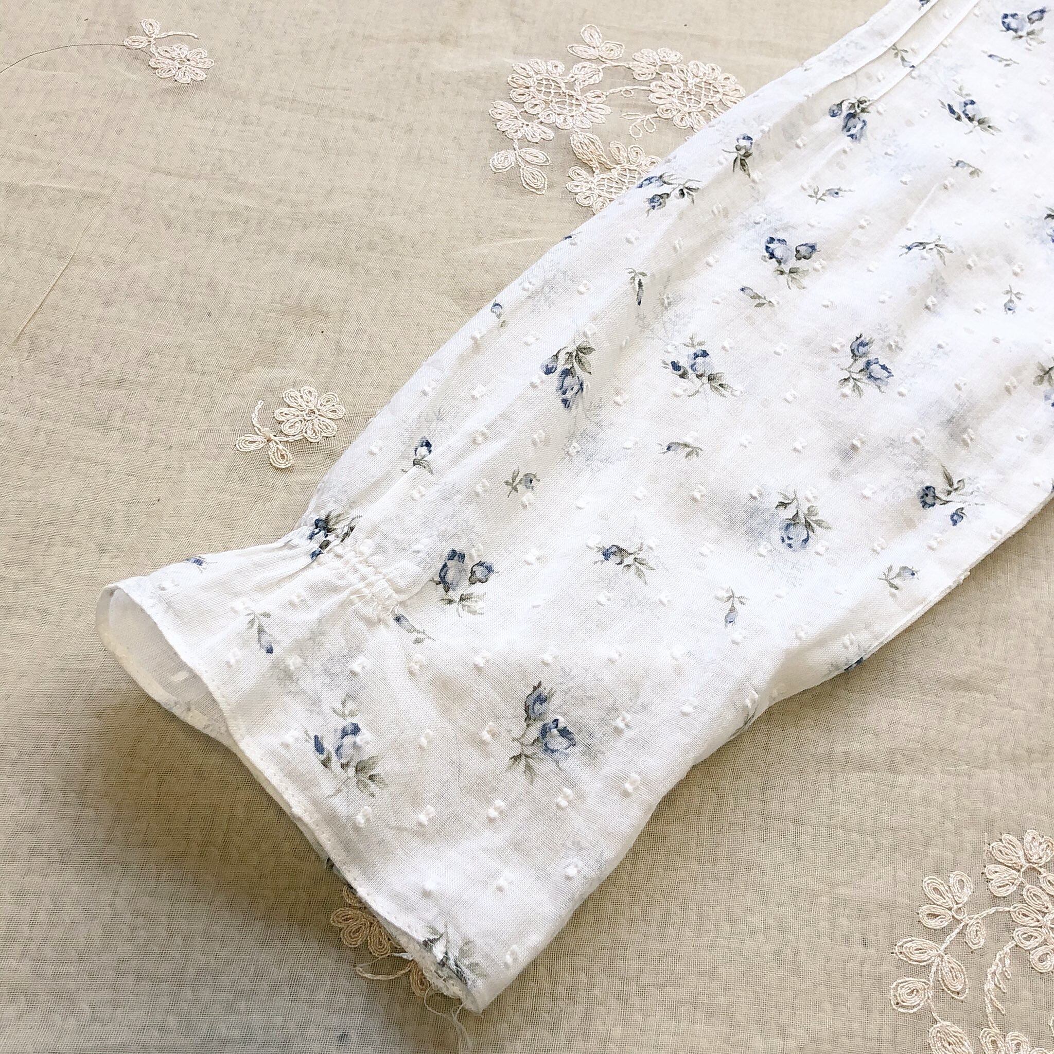 薄手の柔らかいコットン生地に淡いブルーのお花が描かれていて、ドット状に少し立体的な模様がついています。