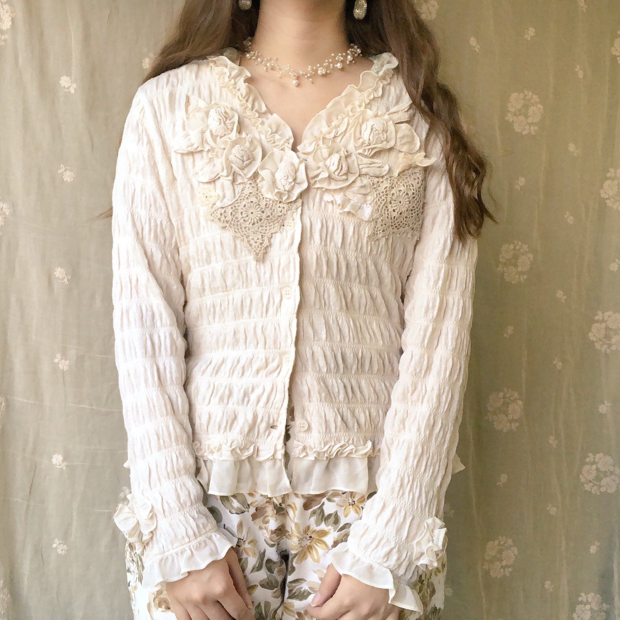 くしゅくしゅした生地にいろんな素材で出来たフリルやお花などの装飾が可愛いです。