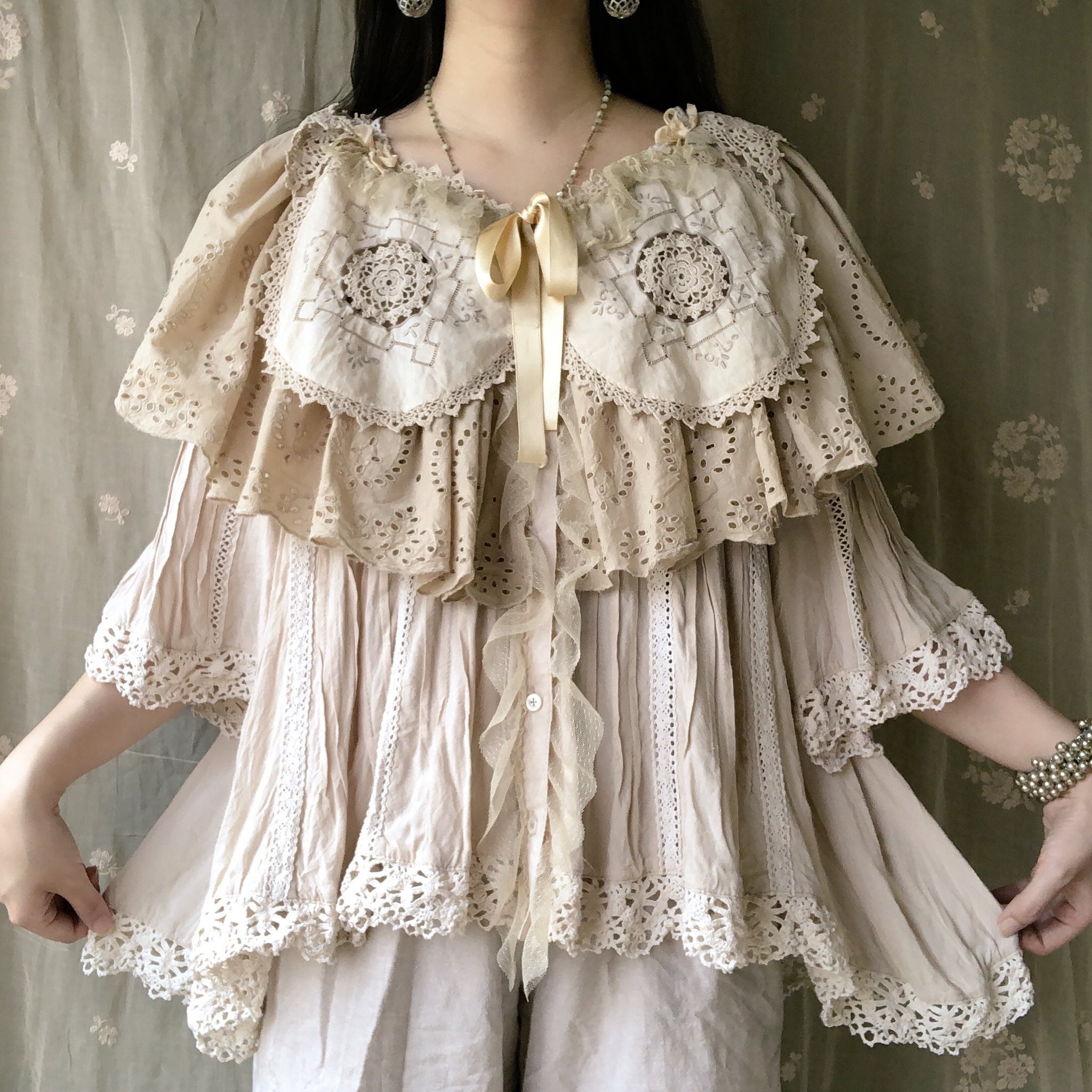 胸元のビスケットみたいなvintageドイリーが可愛いブラウス。