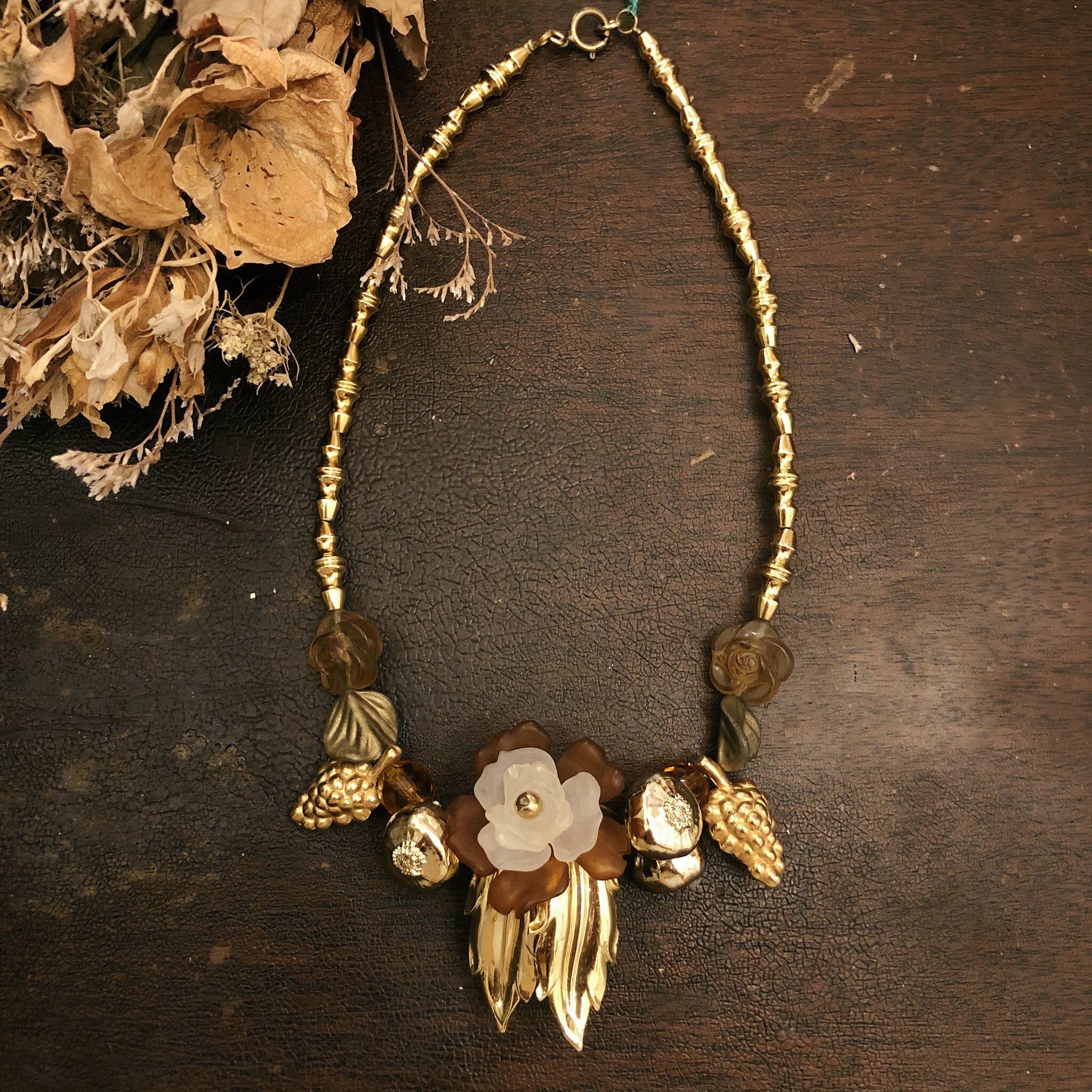 ゴールドとブラウン系のビーズの大ぶりネックレス。vintageならではの変わったモチーフのビーズがたくさん使われていてとっても可愛いです。