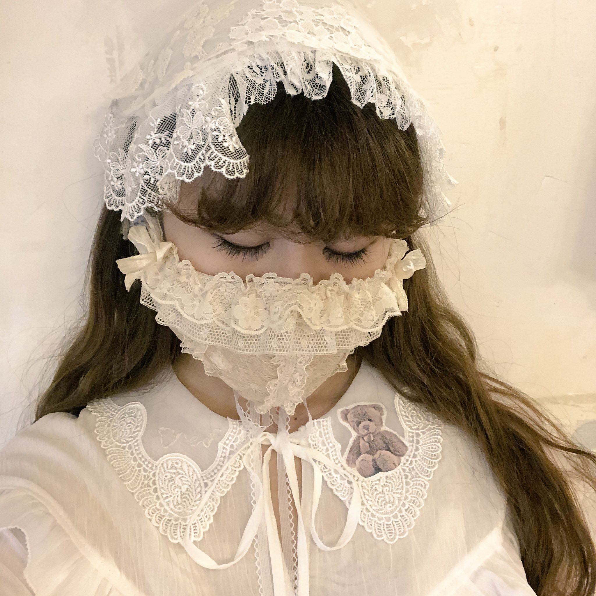 両サイドからコットンレースのリボンが出ていて顎の下か頭の後ろで結ぶ仕様です。