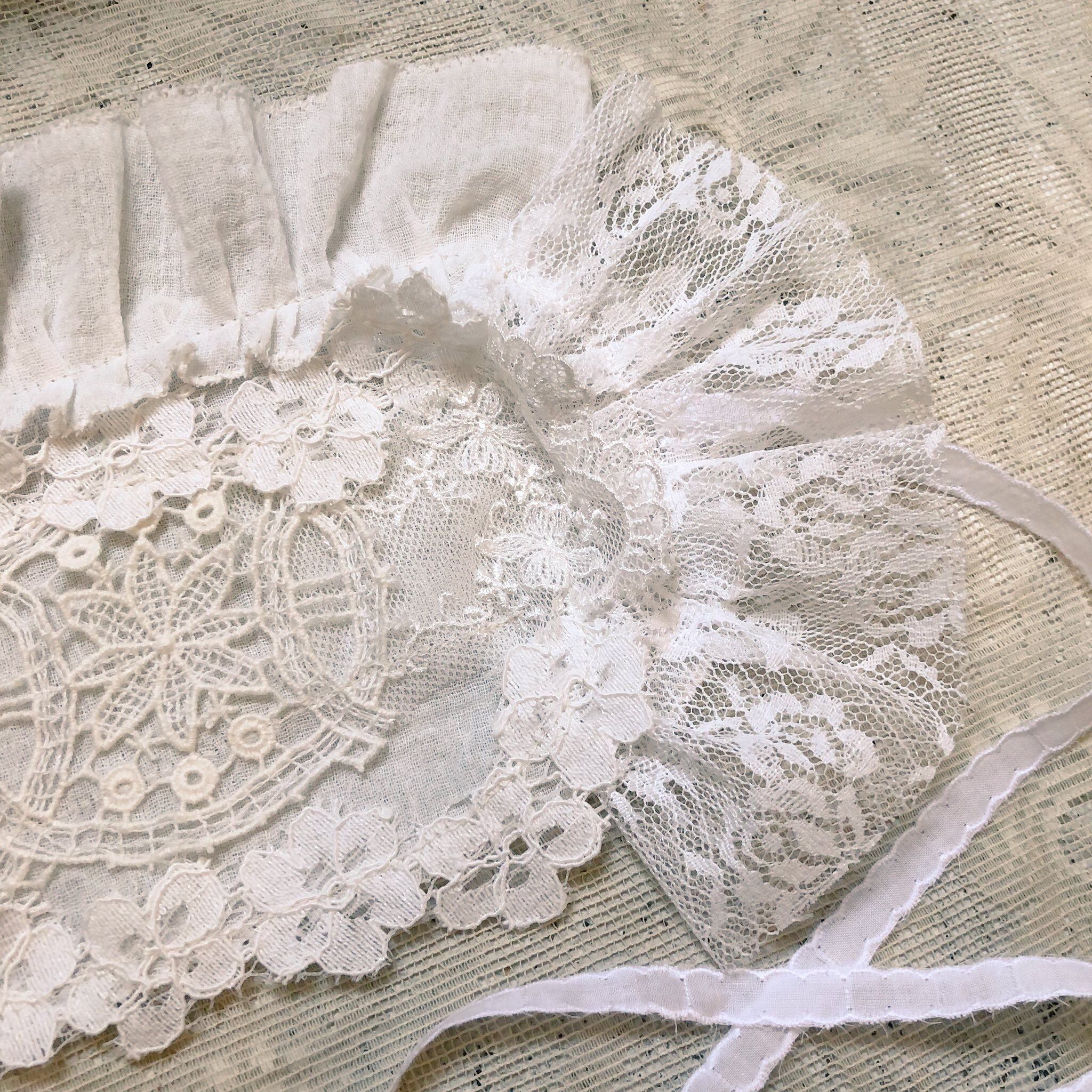 両サイドからコットンレースのリボンが出ていて顎の下か頭の後ろで結ぶ仕様です。