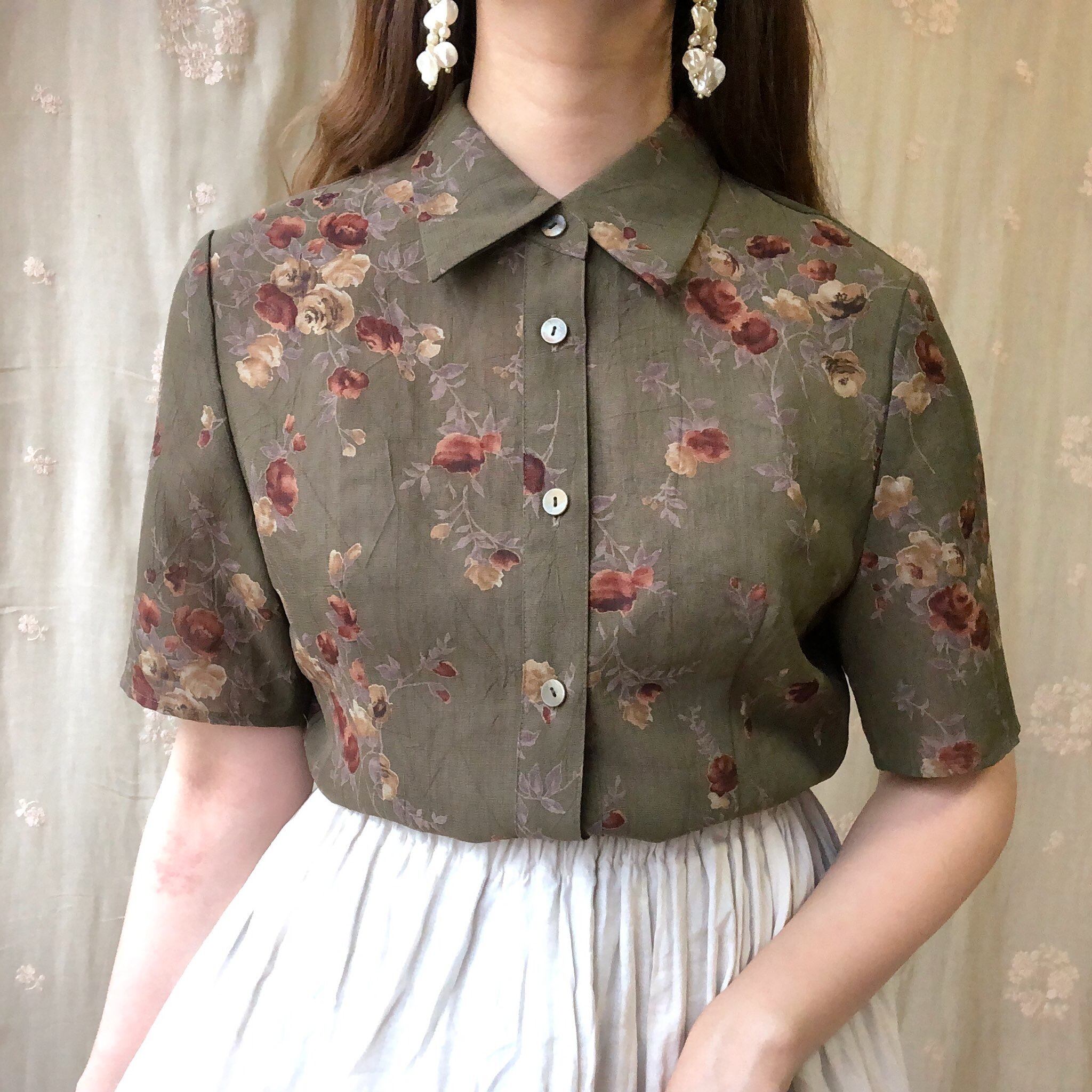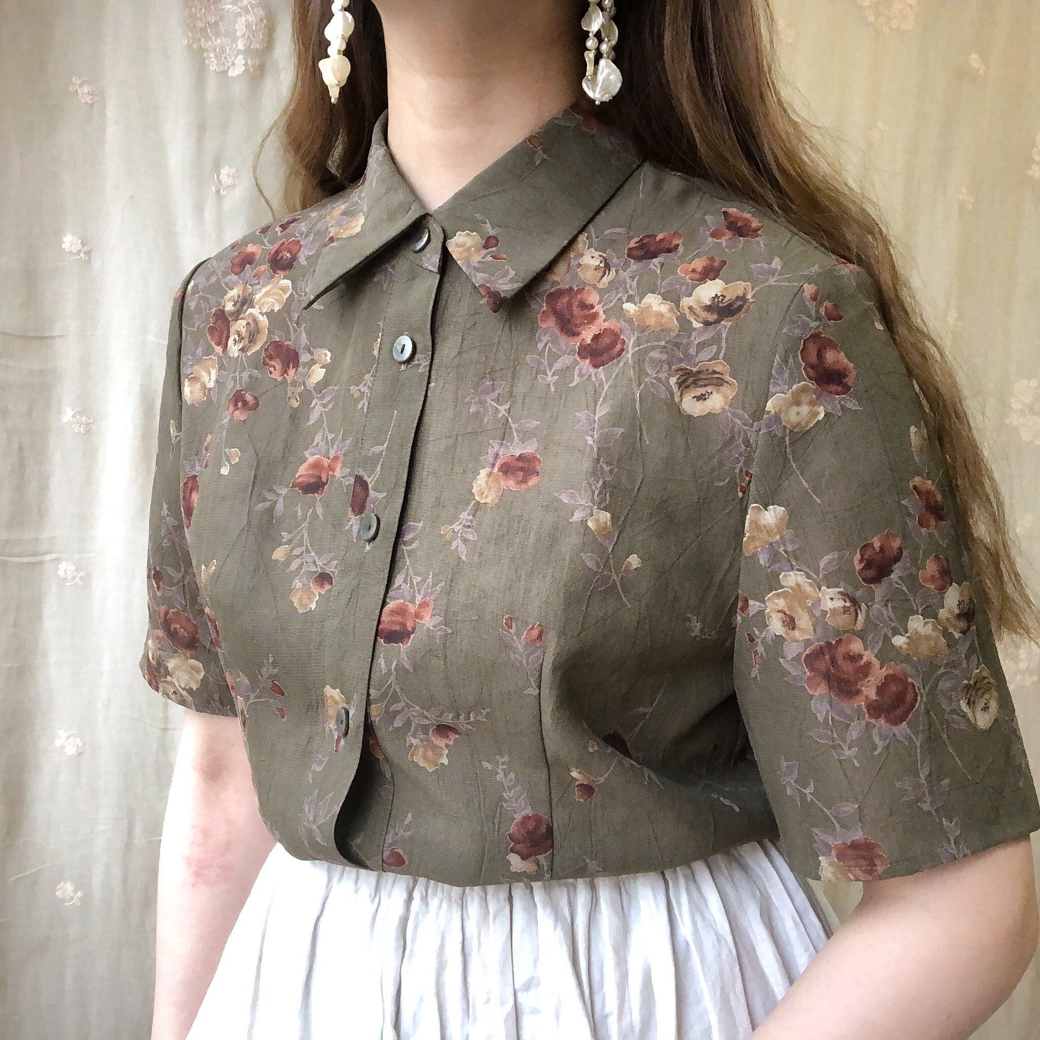 カーキにブラウン系の落ち着いた花柄が可愛いブラウス。