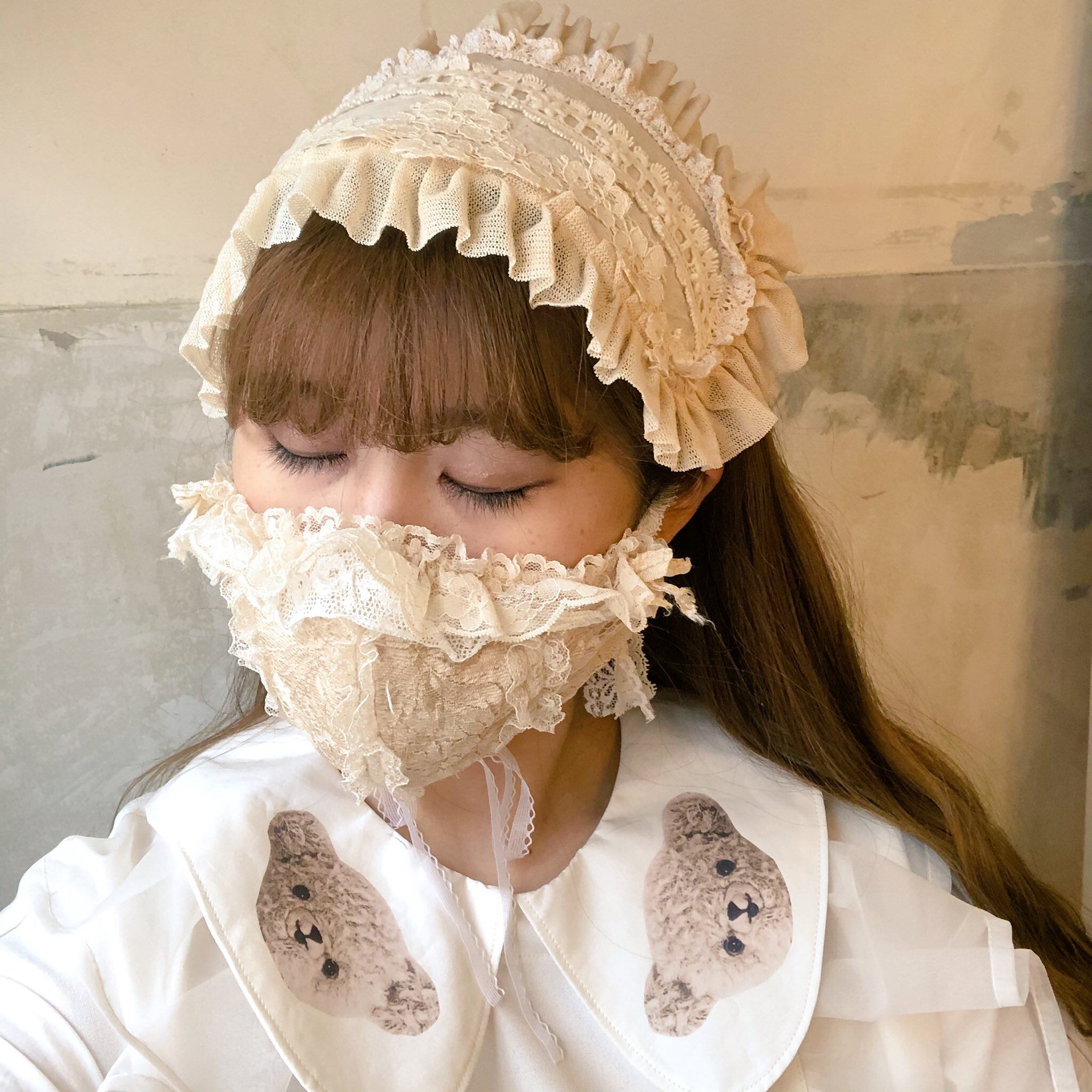 両サイドからレースのリボンが出ていて顎の下か頭の後ろで結ぶ仕様です。