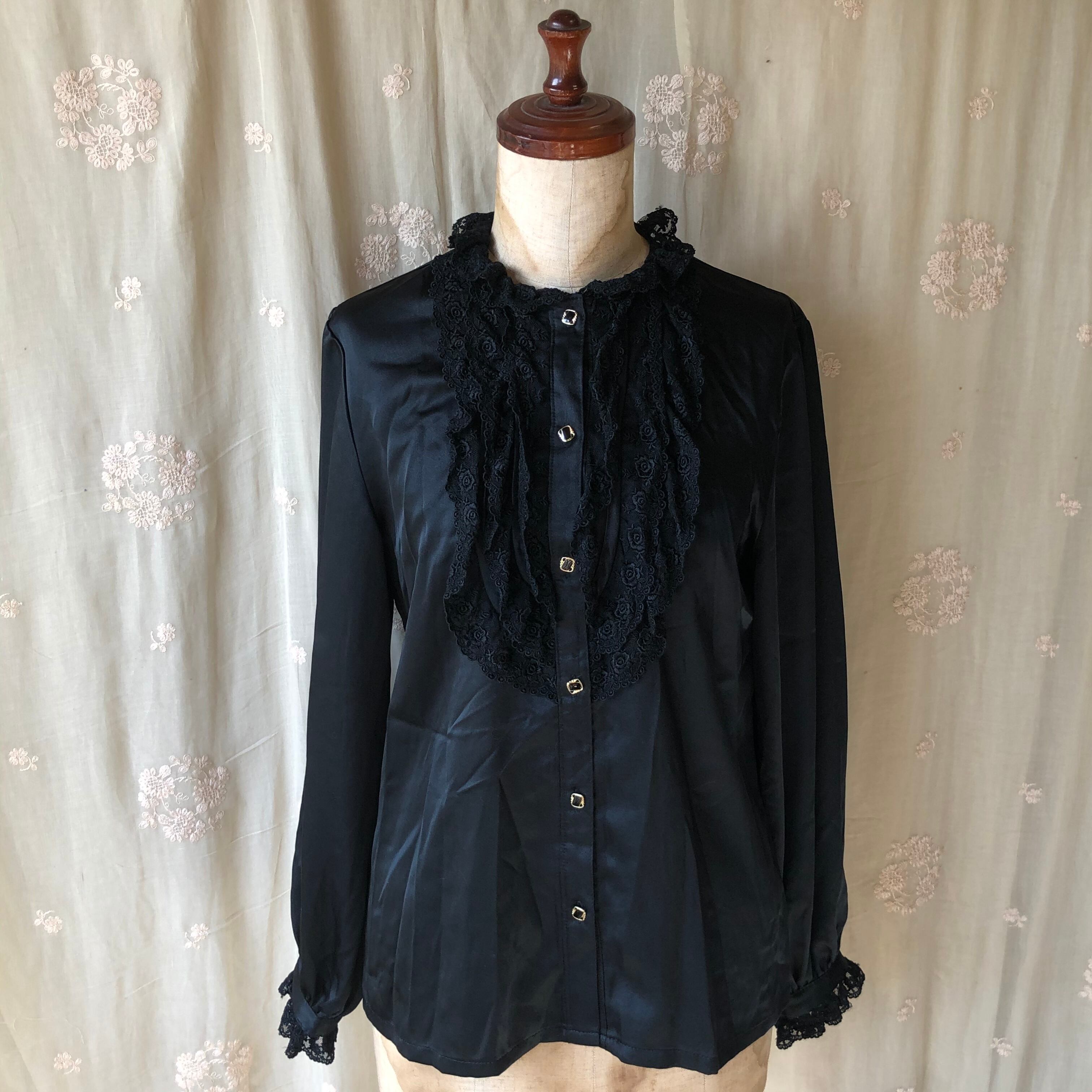 上品なツヤ感のあるシルクサテン調子のブラウス。