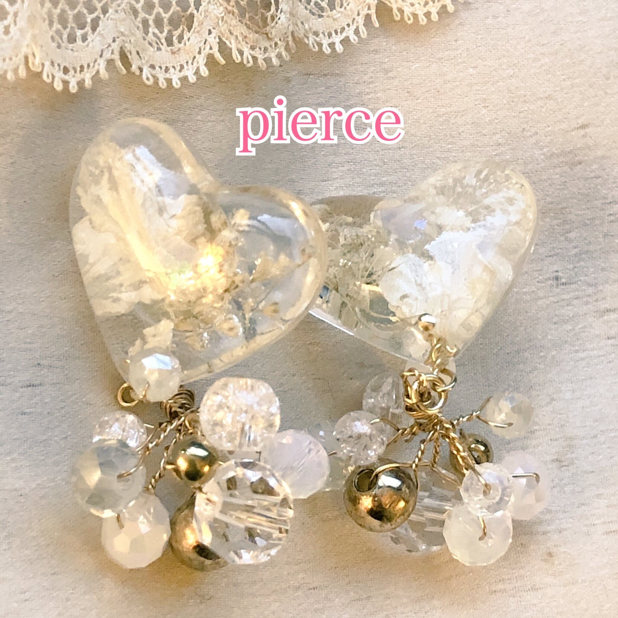 ドライフラワーを閉じ込めた大きめハートのオリジナルパーツが可愛いです。
