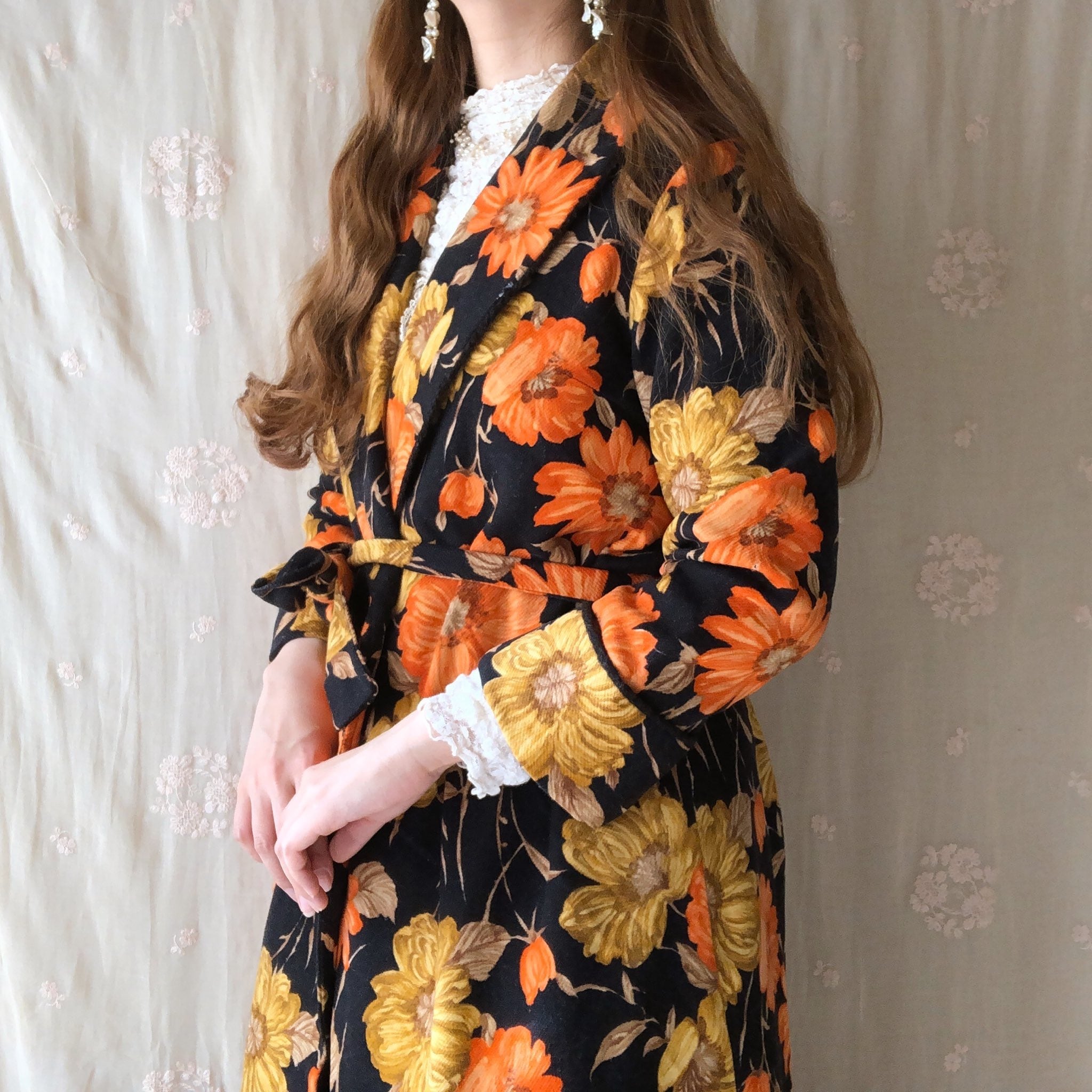 黒地に落ち着いた黄色やオレンジの花柄が可愛いウールガウン。