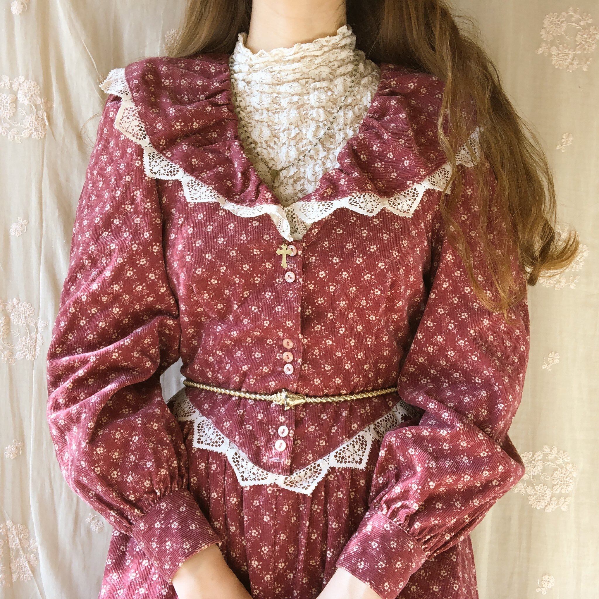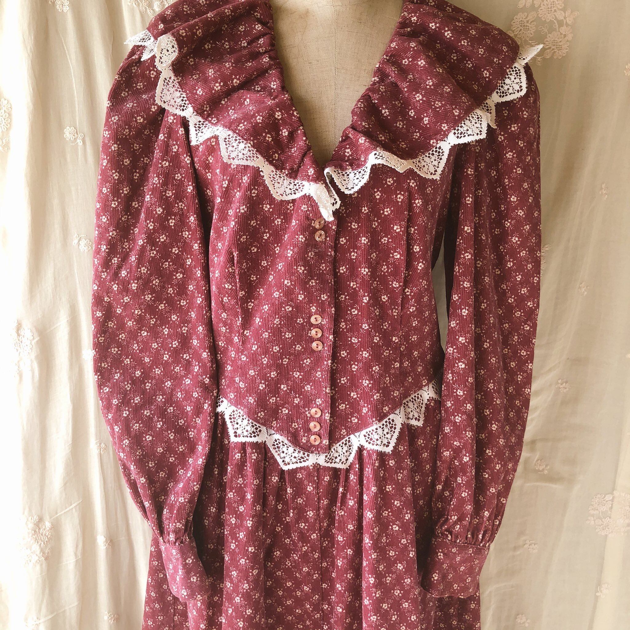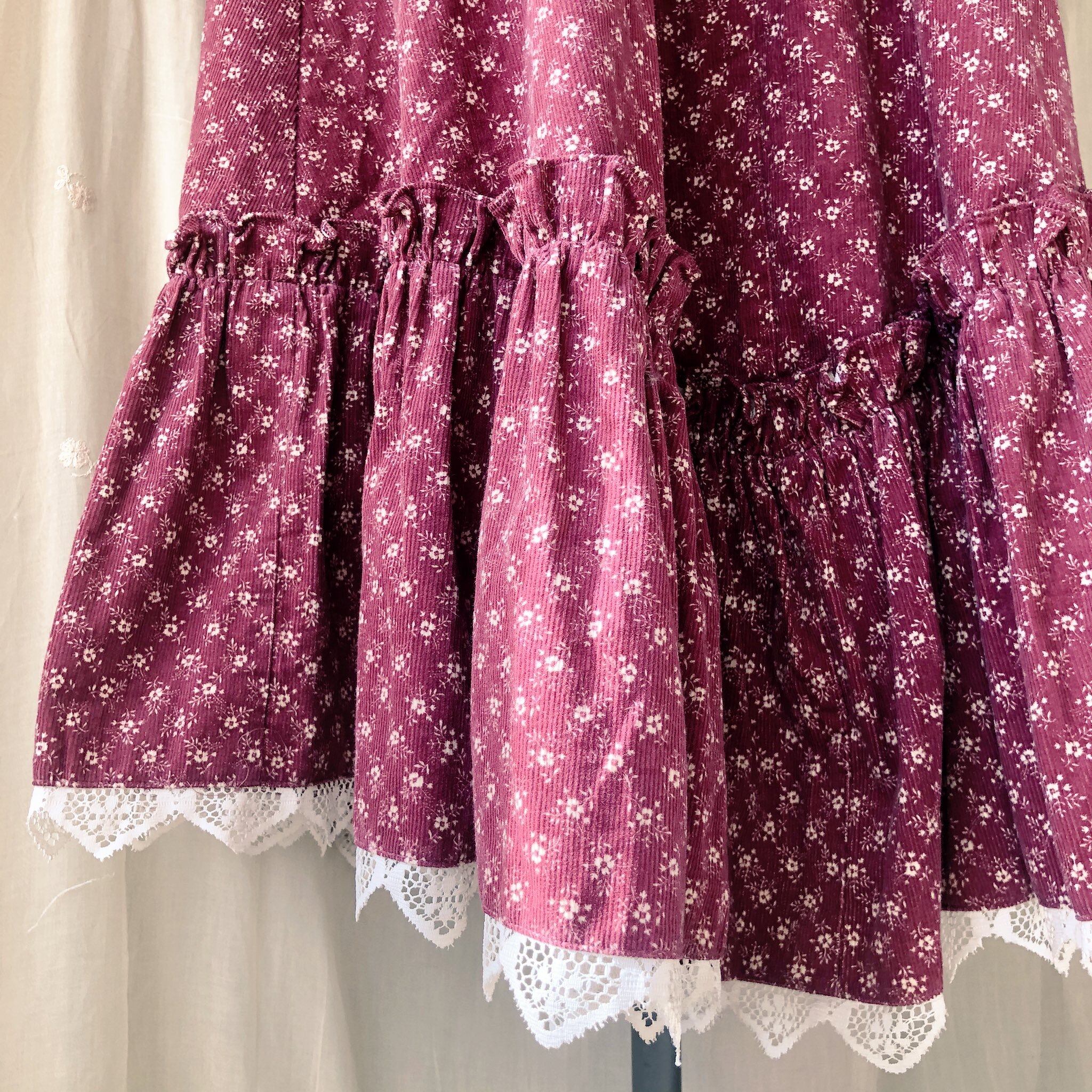ボルドーのお花模様のコーデュロイ生地が可愛いvintageワンピース。