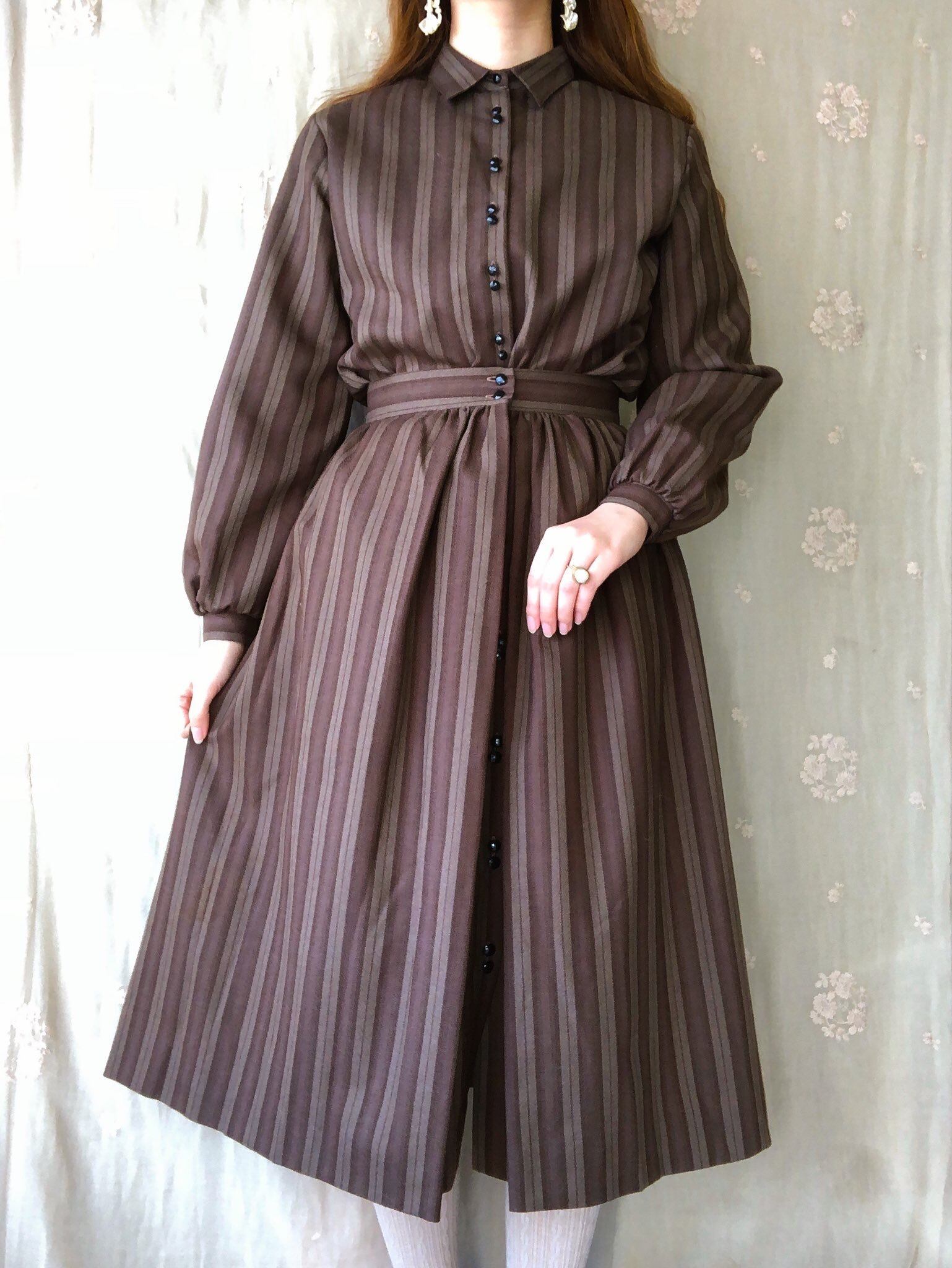 チョコレートカラーのストライプ生地が可愛いスコットランド製のブラウス。