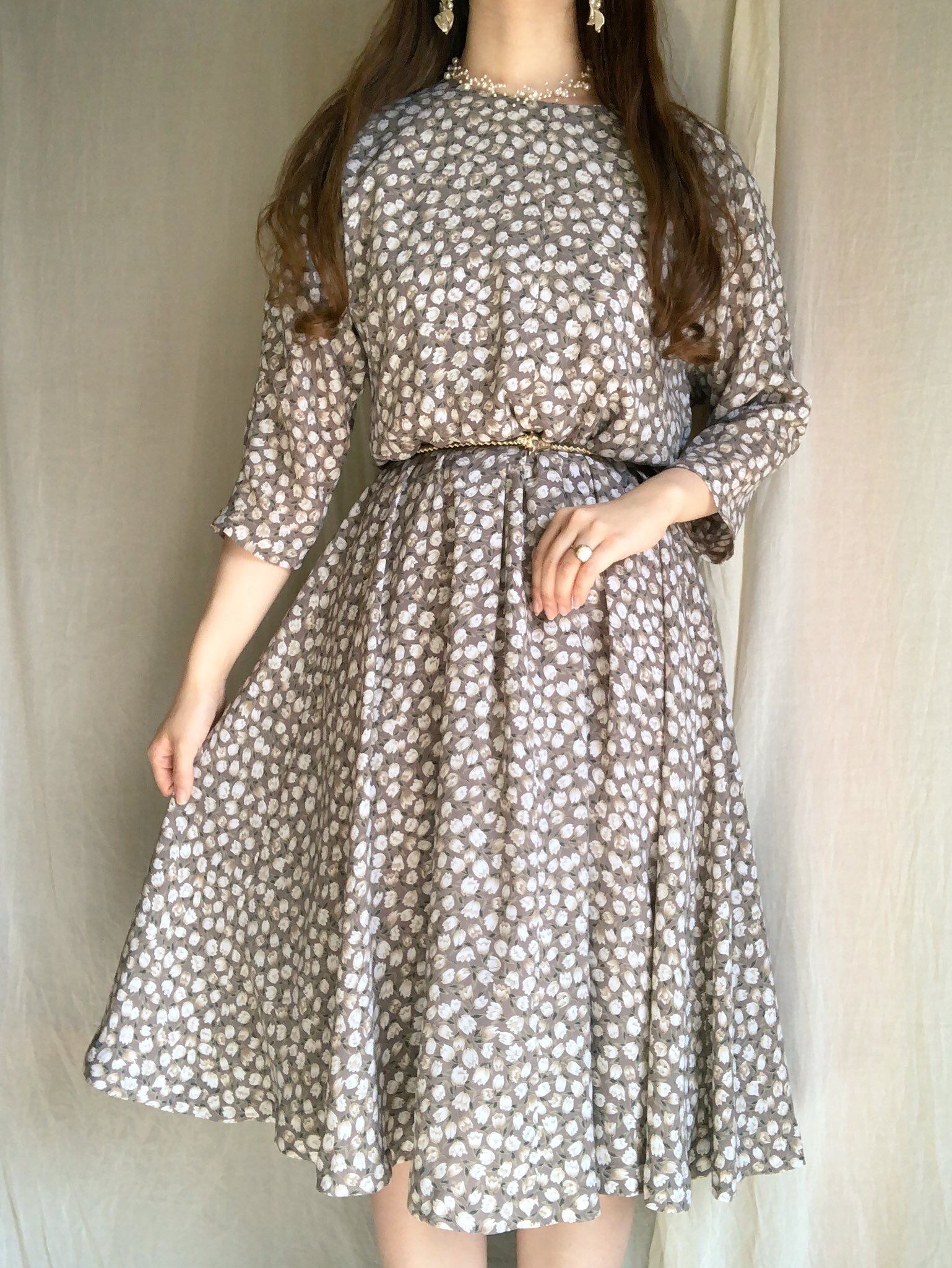 淡いグレーに白系のチューリップ模様がとっても可愛いワンピース。