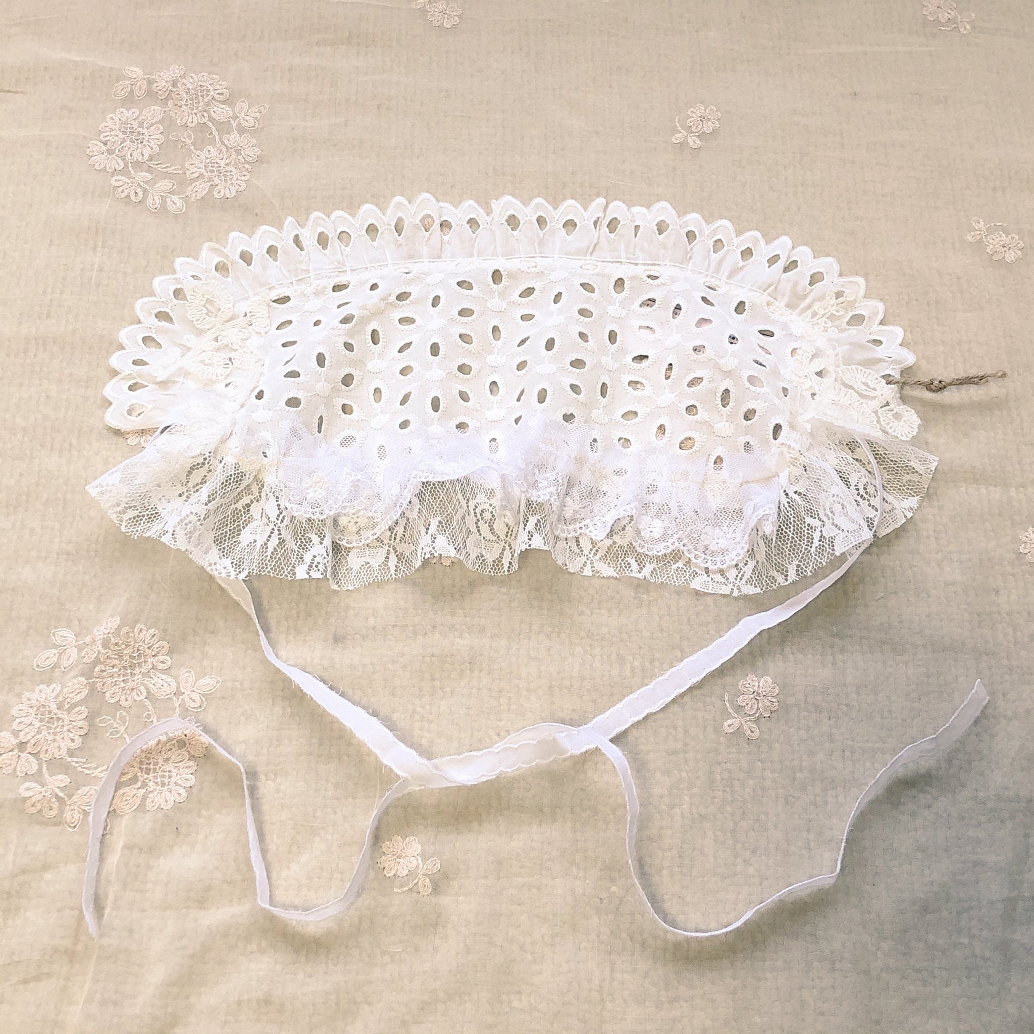 両サイドからレースのリボンが出ていて顎の下か頭の後ろで結ぶ仕様です。