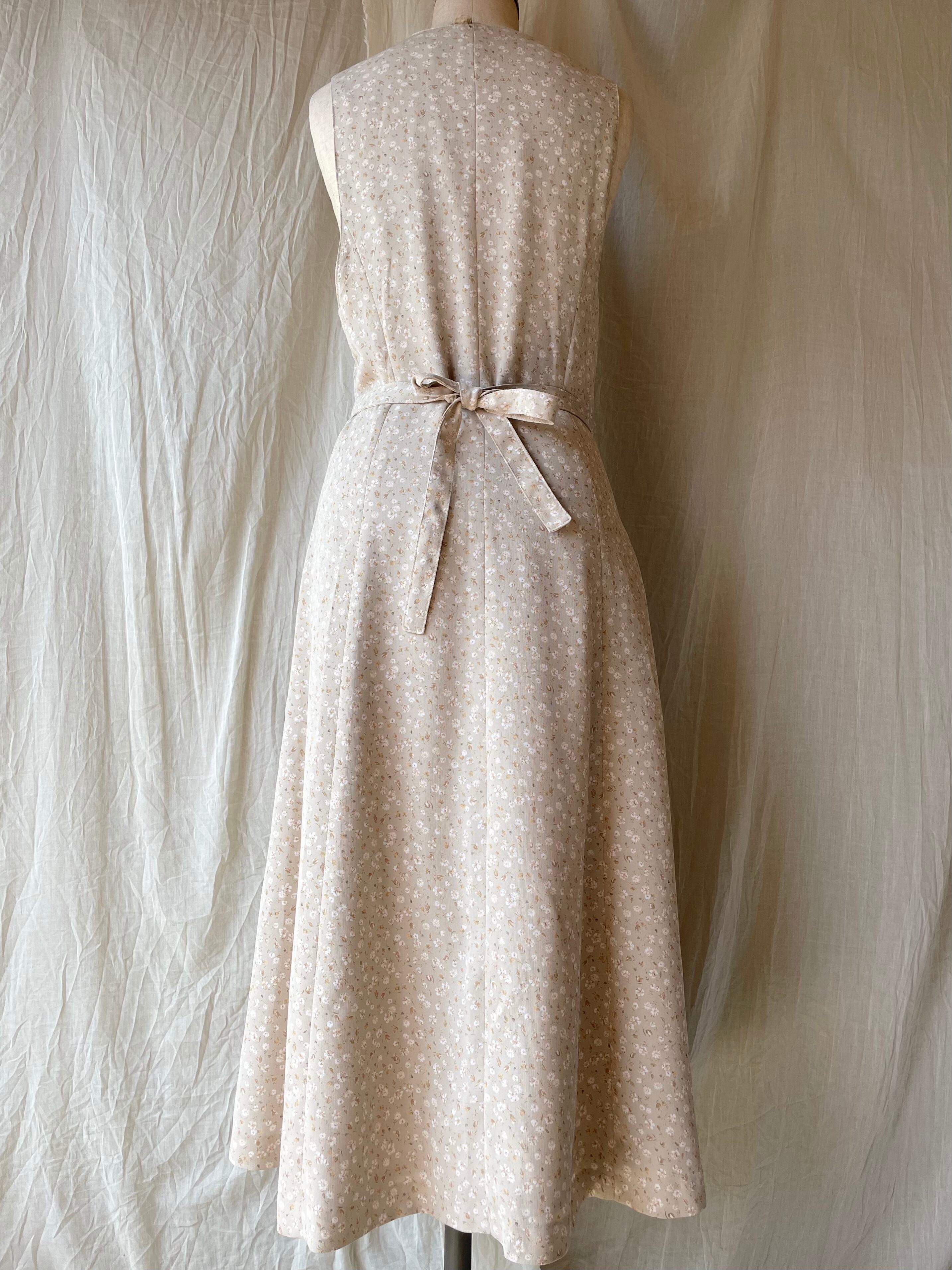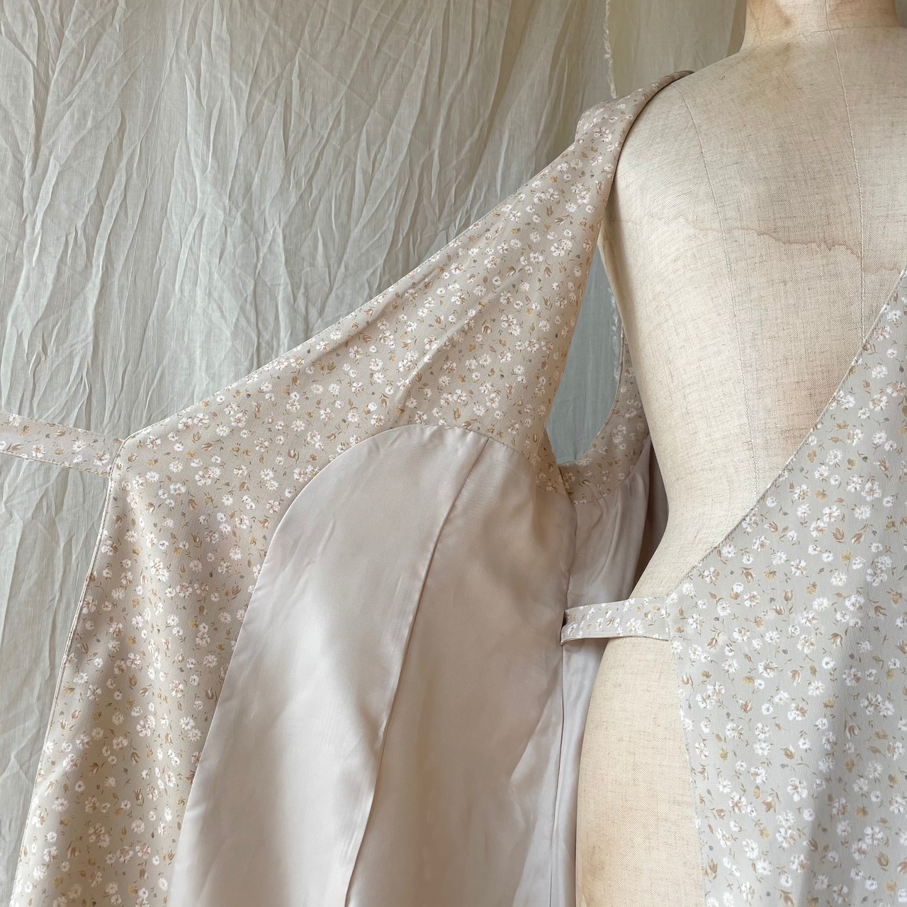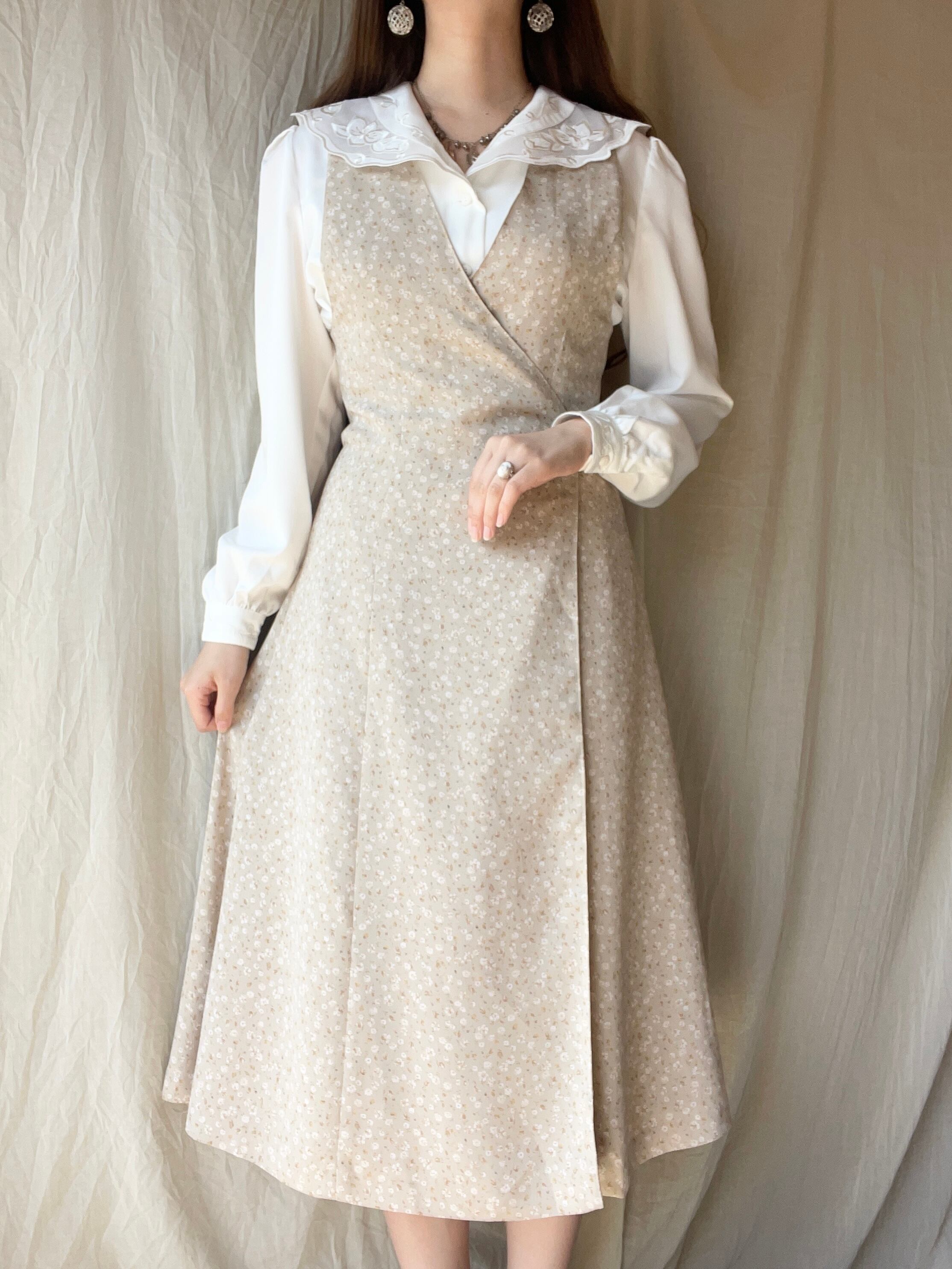 赤みの少ない淡いベージュに白系の小花模様が可愛いワンピース。