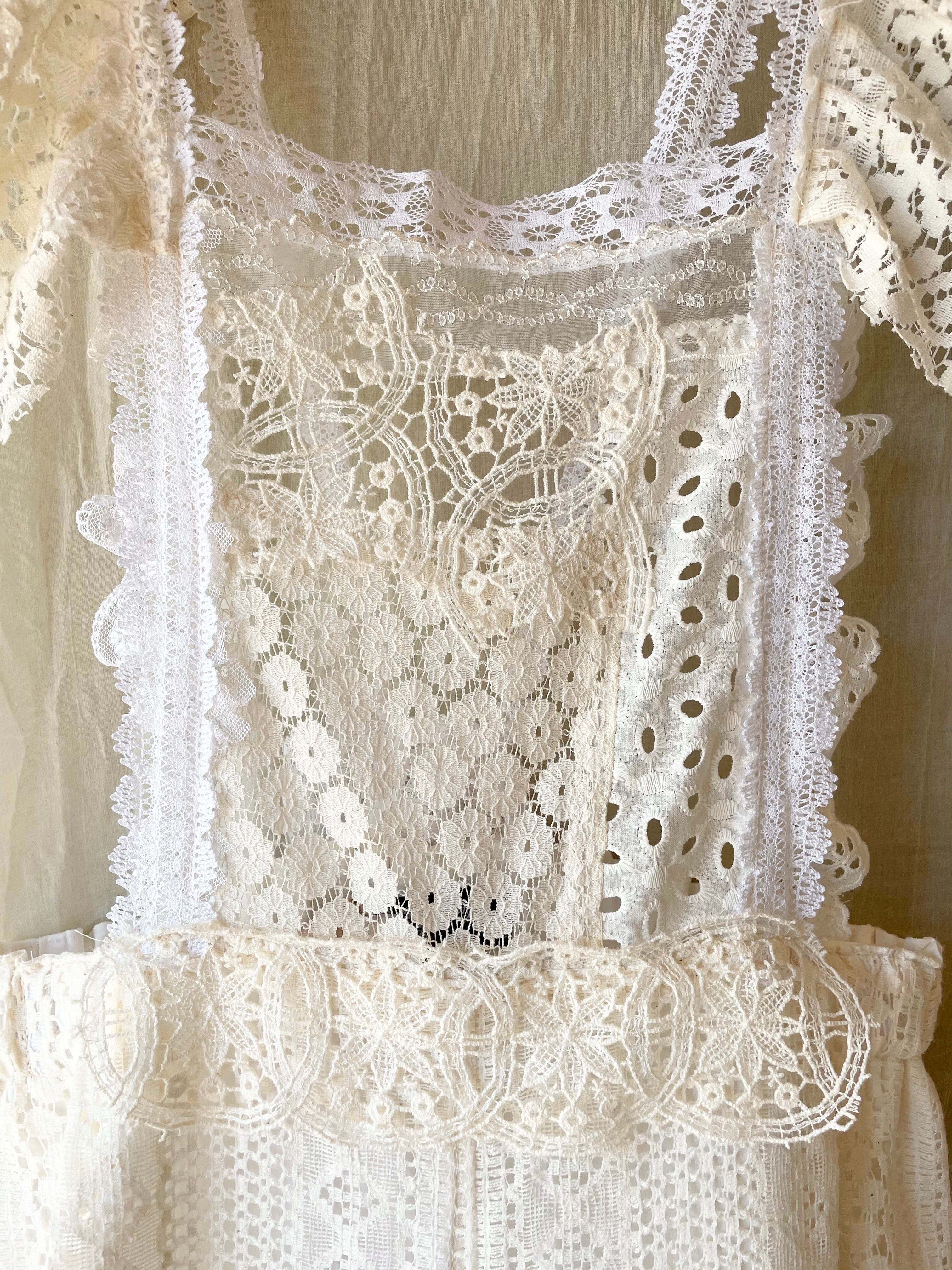 生成り色のレース生地で制作されたワイドパンツにレースコラージュの胸当がついています。