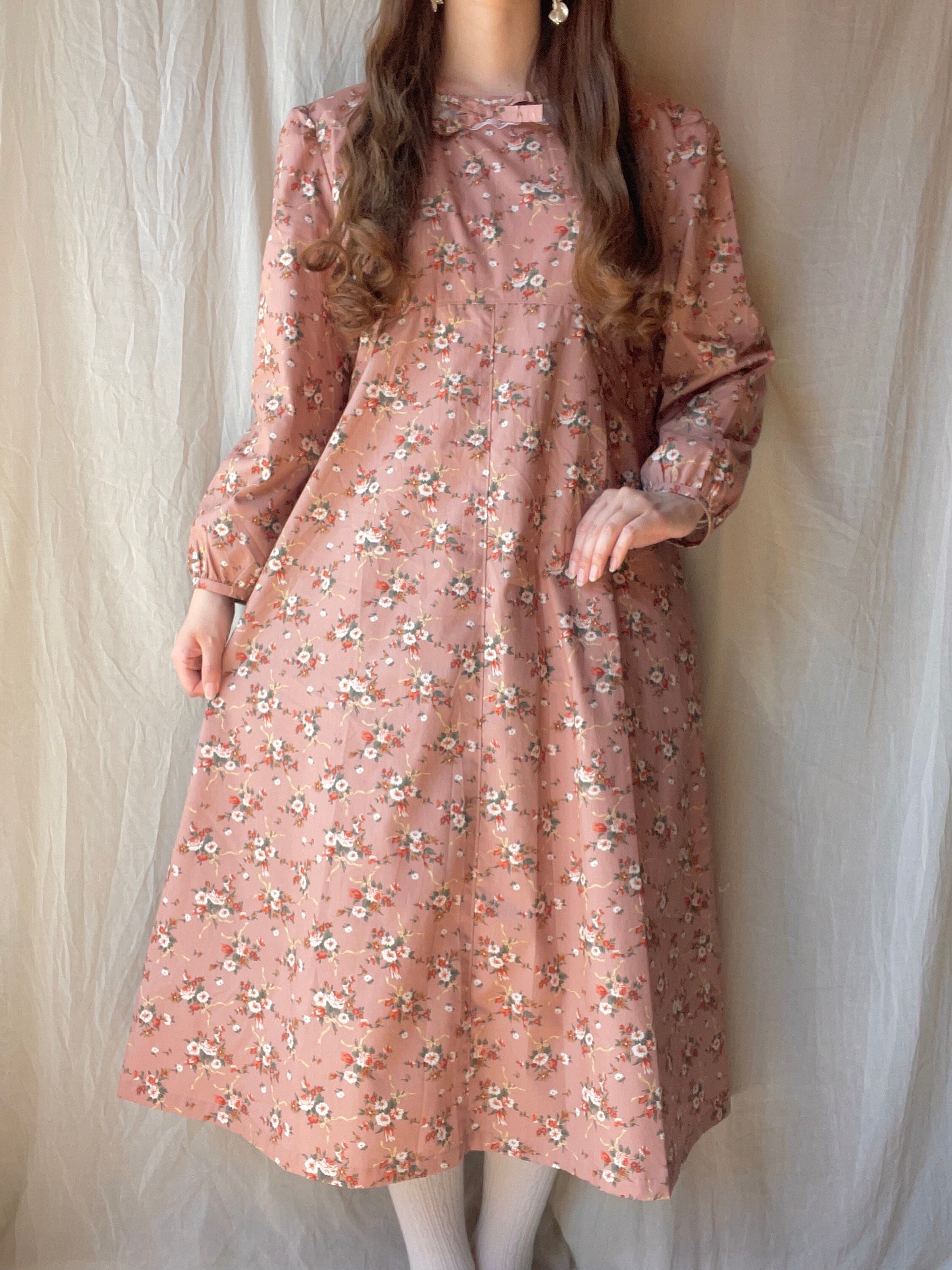 くすみピンクに可愛いブーケ柄のコットンワンピース。